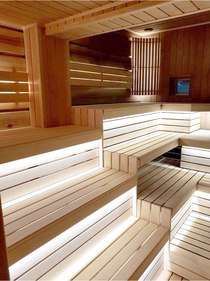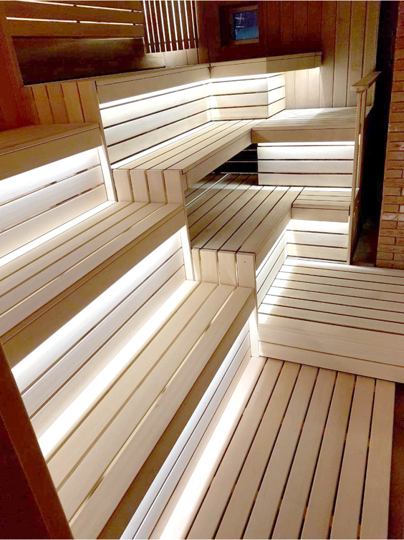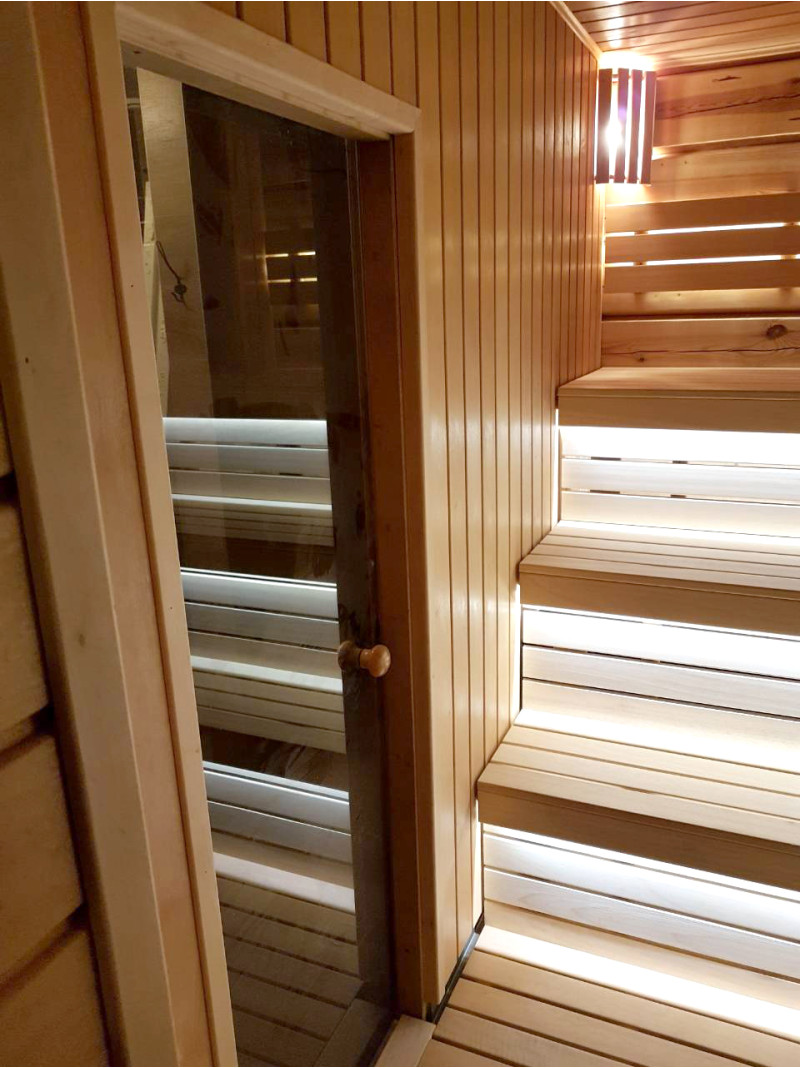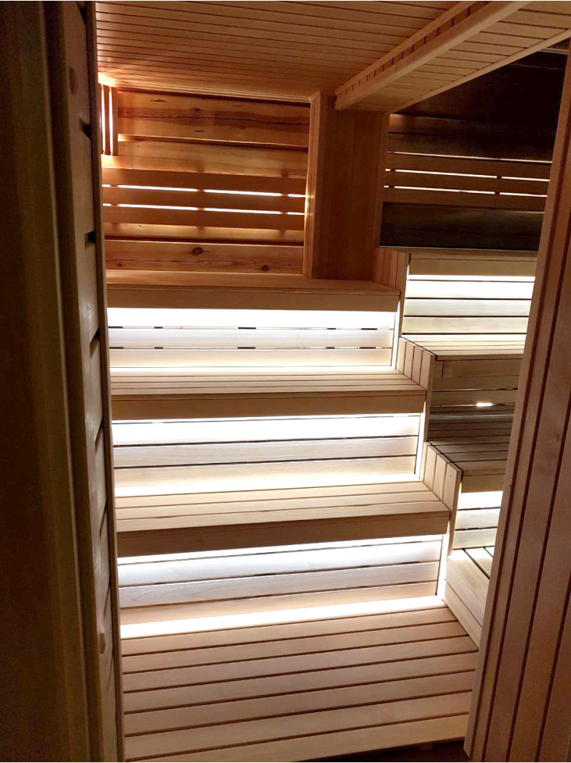 Ζεστός λευκός φωτισμός LED τοποθετείται κάτω από τις ξαπλώστρες, δίνοντας στη σάουνα μια αίσθηση ευρυχωρίας και θαλπωρής. Για τον φωτισμό τοίχου επιλέχθηκε ένα φωτιστικό με ασορτί ξύλινο κάλυμμα.