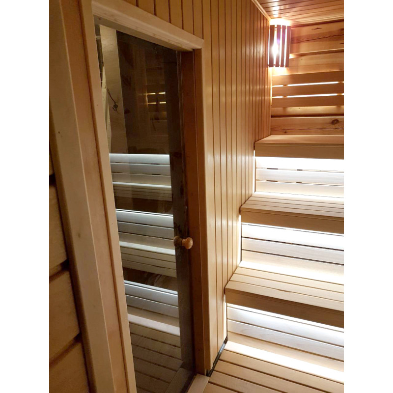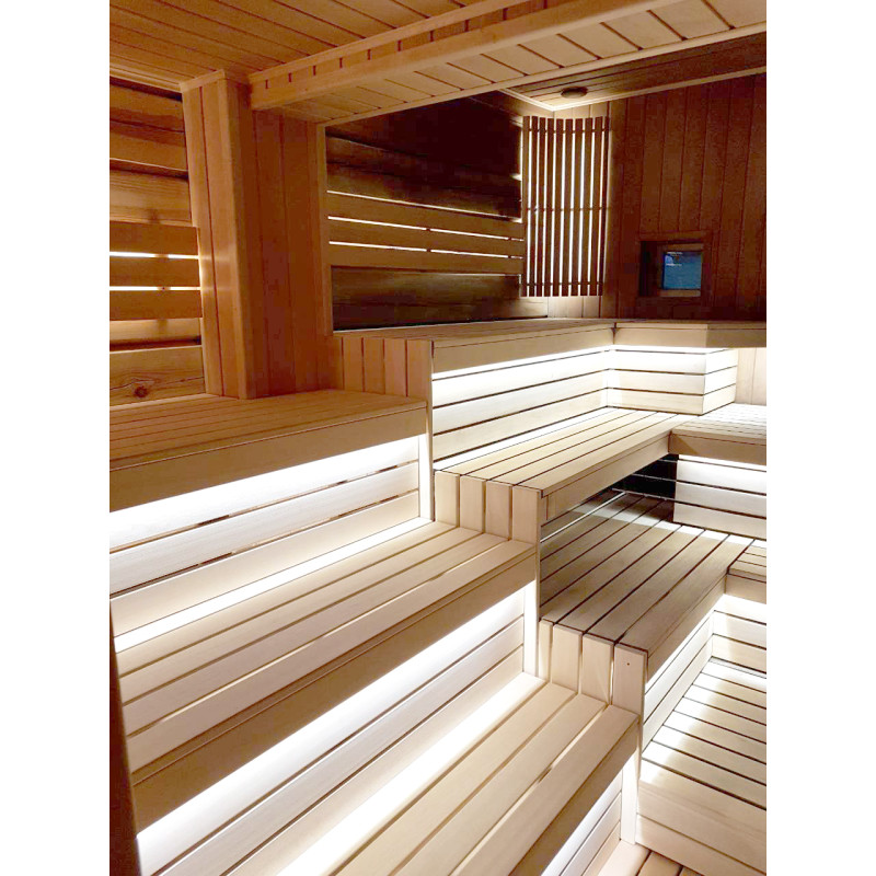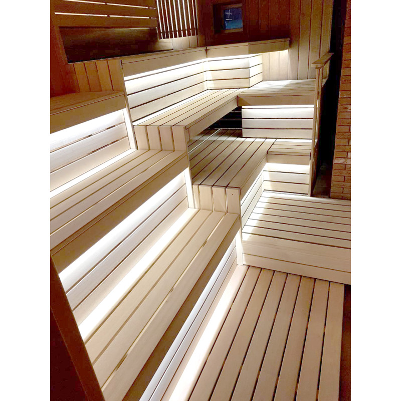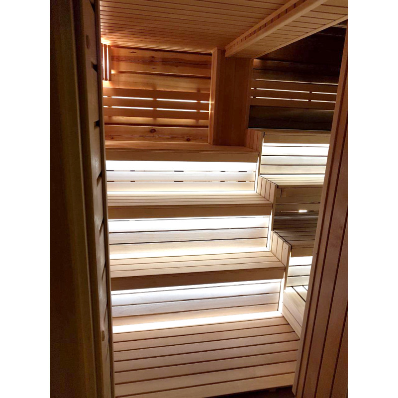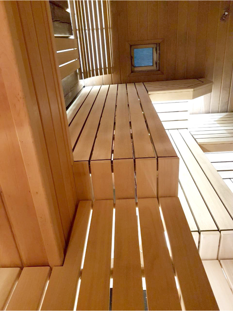 Ζεστός λευκός φωτισμός LED τοποθετείται κάτω από τις ξαπλώστρες, δίνοντας στη σάουνα μια αίσθηση ευρυχωρίας και θαλπωρής. Για τον φωτισμό τοίχου επιλέχθηκε ένα φωτιστικό με ασορτί ξύλινο κάλυμμα.