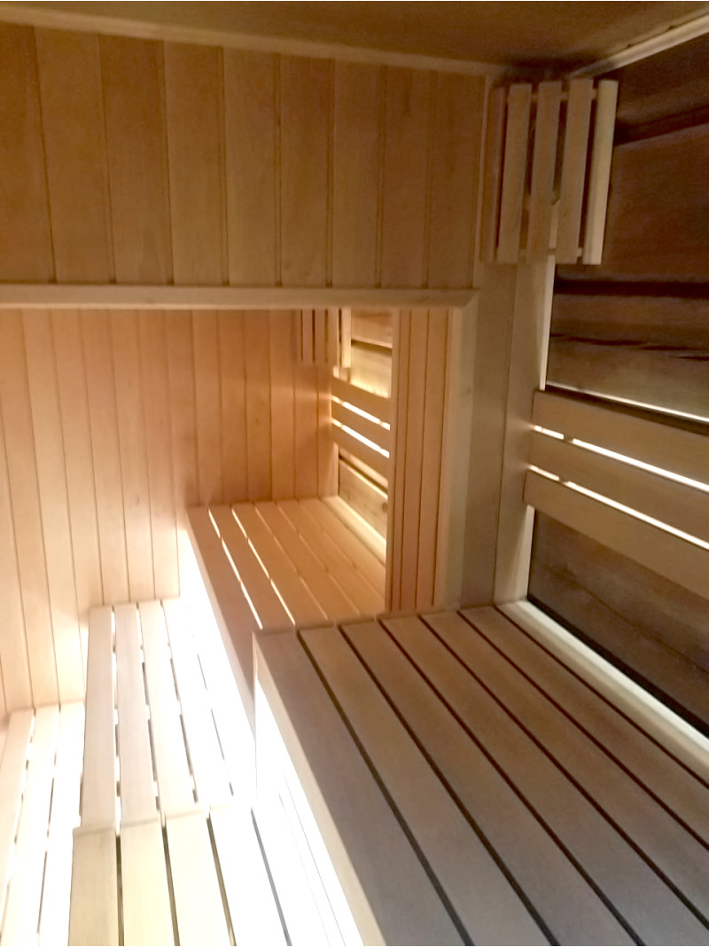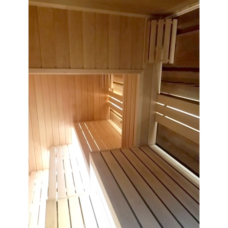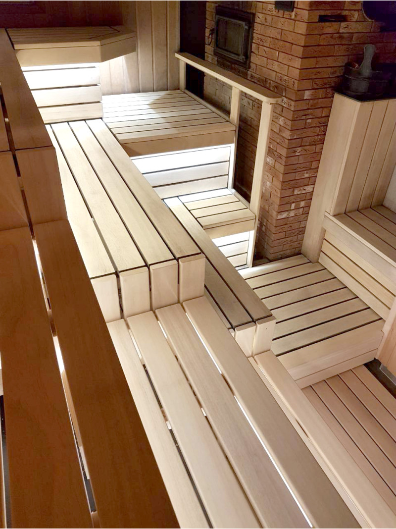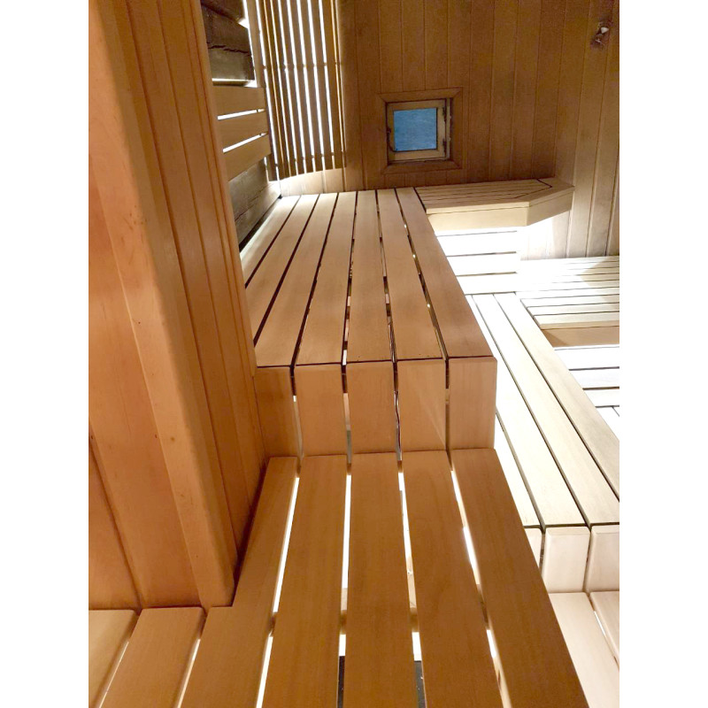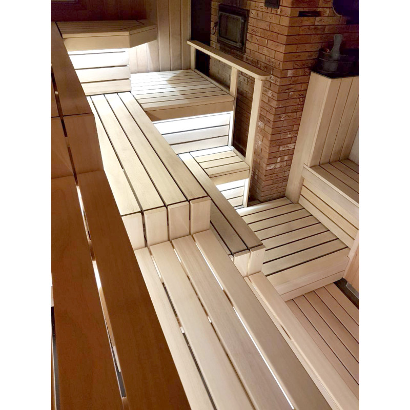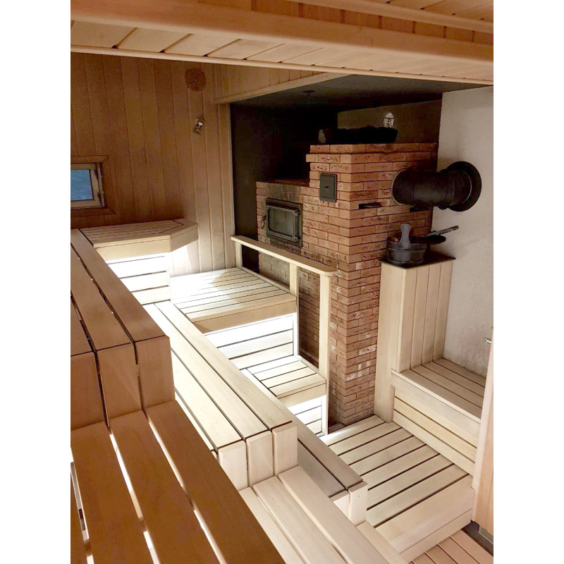 Το ξύλο είναι εμποτισμένο, προστατευμένο από την υψηλή θερμότητα και έτοιμο για μακροχρόνια χρήση. Οι πάγκοι και οι πλάτες λιπαίνονται με ειδικό λάδι για ξύλο σάουνας.