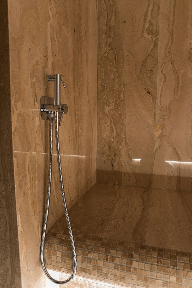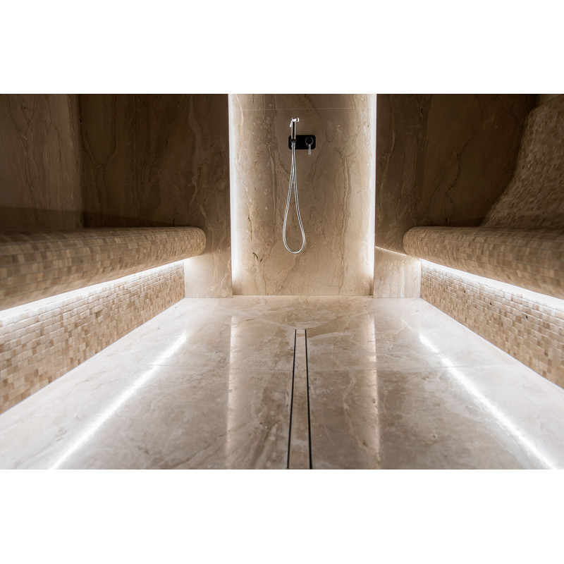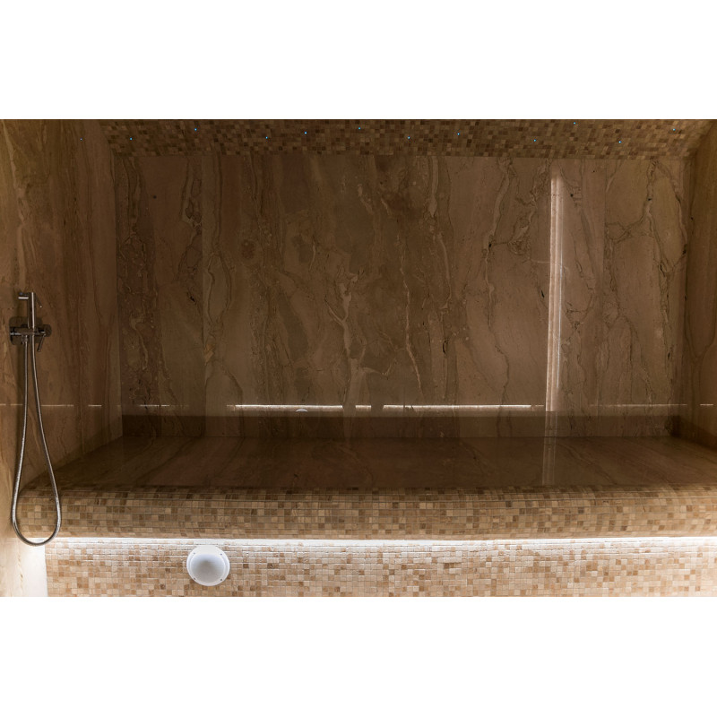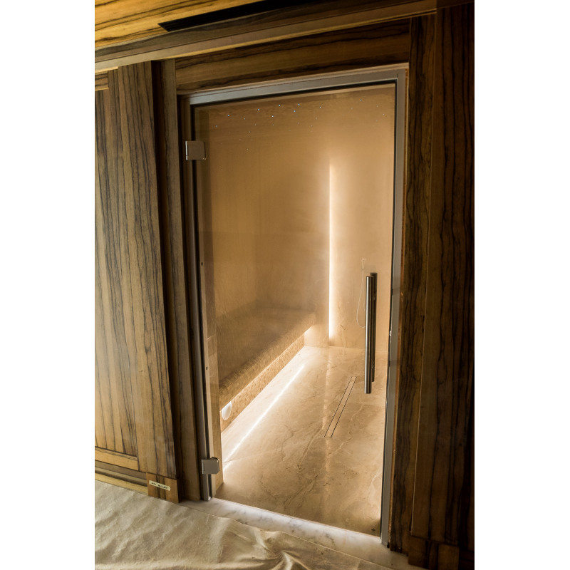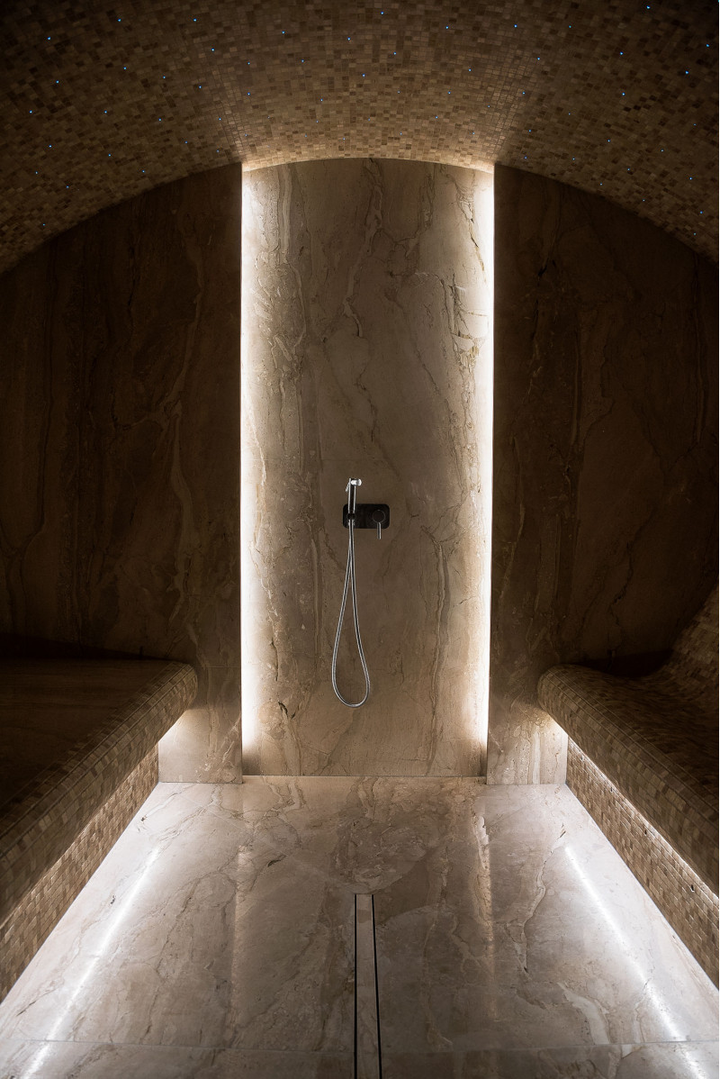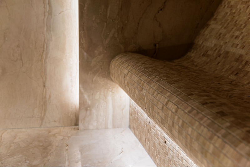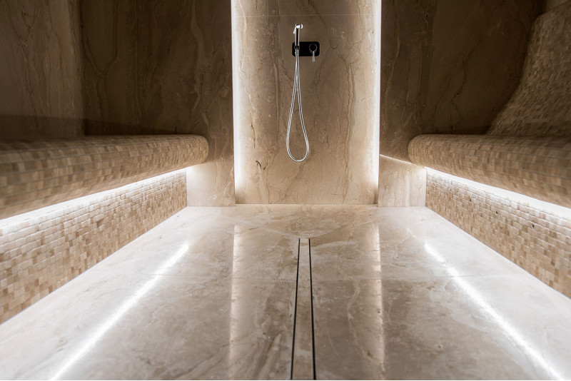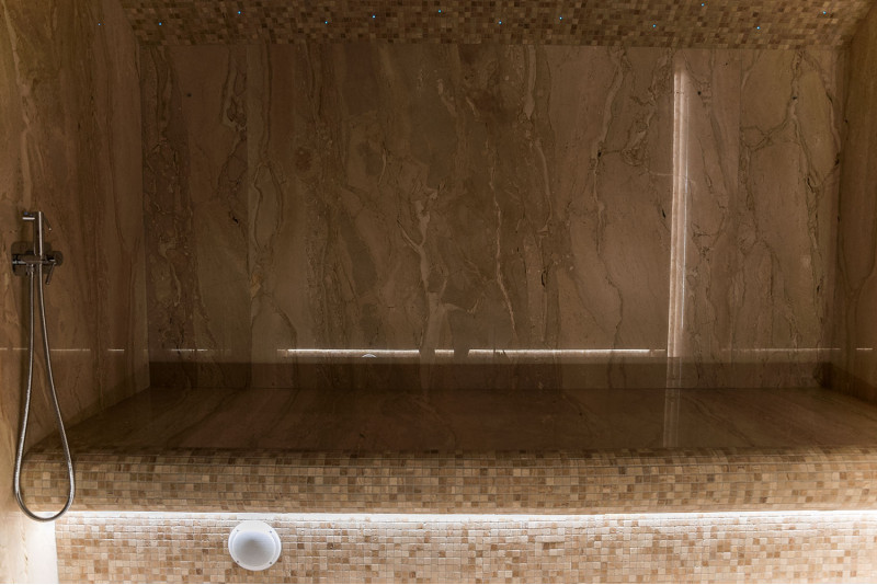 Οι τοίχοι του ατμόλουτρου είναι επενδεδυμένοι με μαρμάρινες πλάκες, τα κρεβάτια και οι οροφές είναι κατασκευασμένες από μαρμάρινα πλακάκια από μάρμαρο. Ένα από τα κρεβάτια, το φαρδύτερο έχει σχεδιαστεί για να ξαπλώνει πάνω του, το άλλο με σχήμα εργονομικής καμπύλης - για καθιστικό. Η σάουνα θερμαίνεται από μια γεννήτρια ατμού Pego 9kW που ελέγχεται από τη μονάδα ελέγχου ευαίσθητη στην αφή Fasel. Ο φωτισμός LED στη σάουνα είναι κάτω από τα κρεβάτια και στους τοίχους, το σύστημα "Žvaigždėtas dangus" είναι ενσωματωμένο στην οροφή. Η αντλία αρώματος εκπέμπει μια ευχάριστη μυρωδιά και φρεσκάδα στη σάουνα.