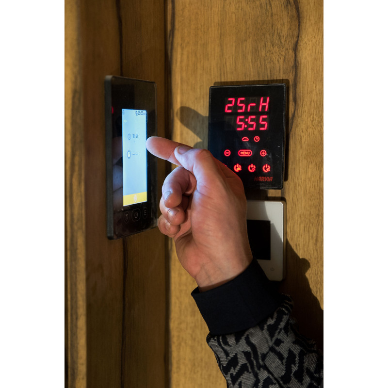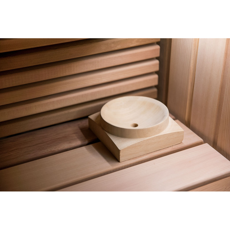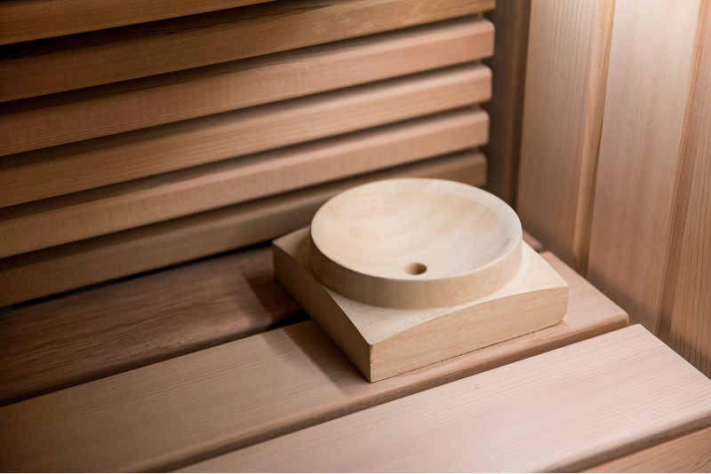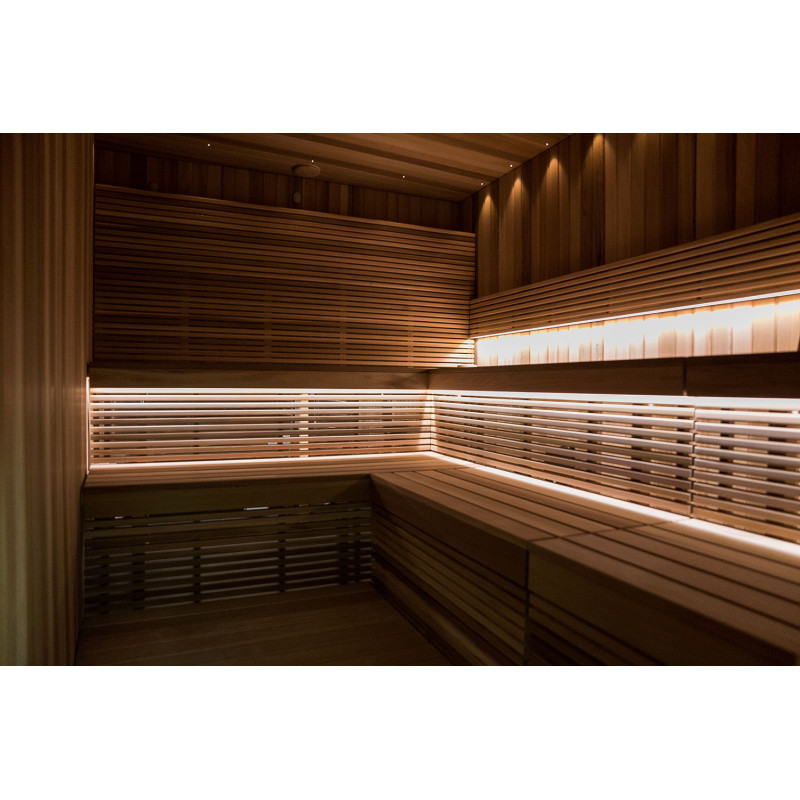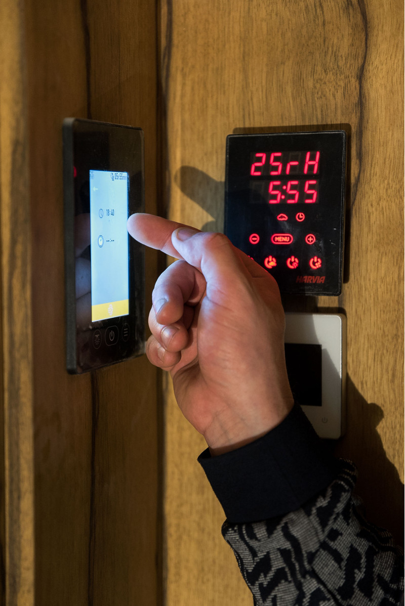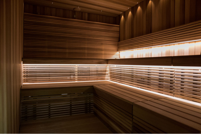 Ένα εξαιρετικά όμορφο ξύλο επιλέχθηκε για τη σάουνα - κόκκινος καναδικός κέδρος. Διακοσμητικά ξύλινα μπλοκ φωτίζονται από σύστημα LED, η οροφή διαθέτει ενσωματωμένο κιτ φωτισμού οπτικών ινών Cariitti. Κάτω από τα κρεβάτια σάουνας, υπάρχει εγκατεστημένος ο θερμαντήρας EOS bi-O Mat με ενσωματωμένο ψεκαστήρα που ελέγχεται από τη μονάδα ελέγχου Harvia Xenio Combi CX110C.
