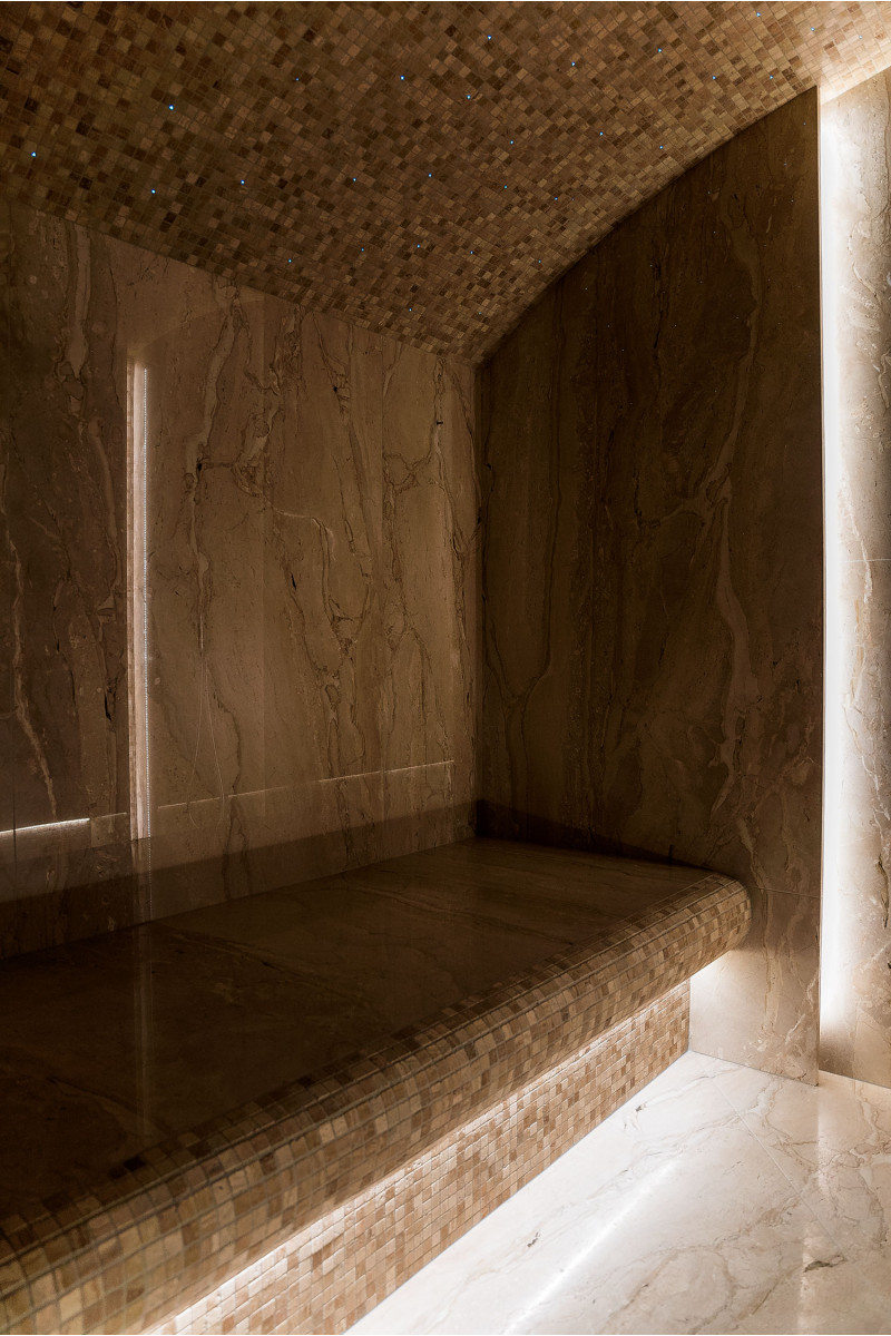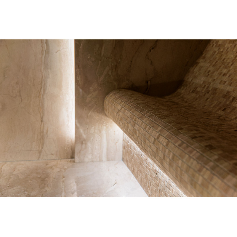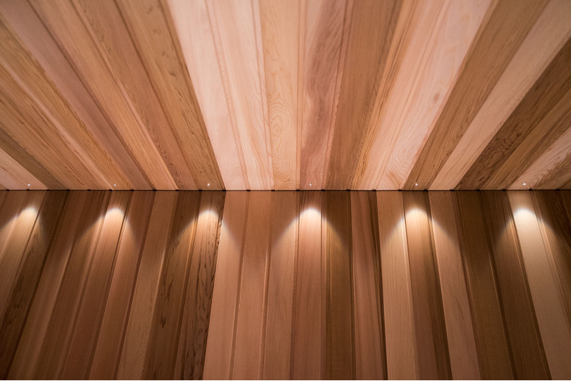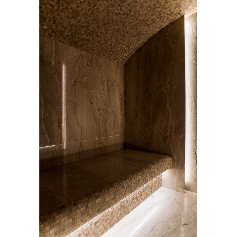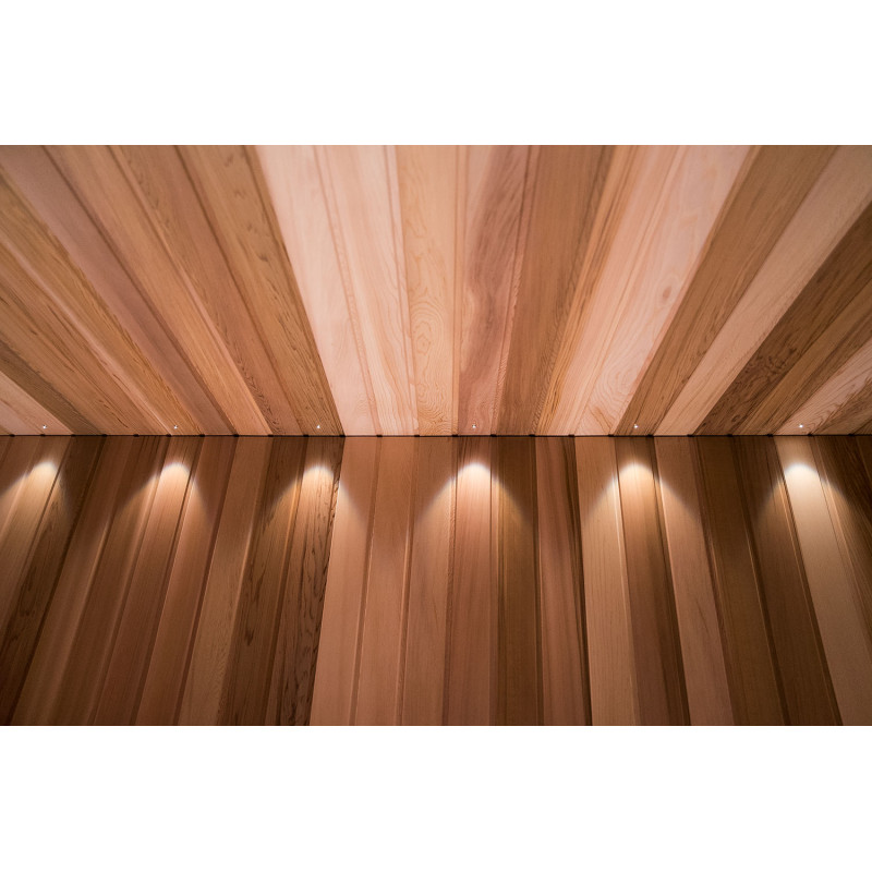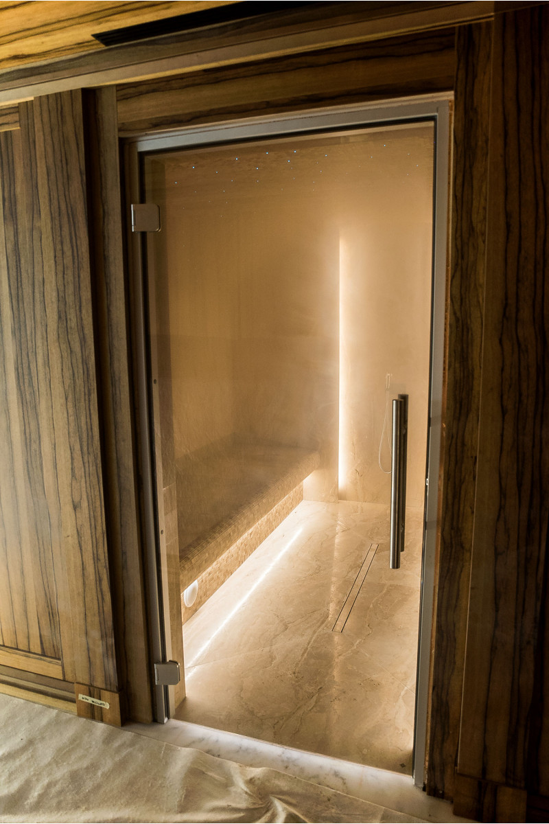 Ένα εξαιρετικά όμορφο ξύλο επιλέχθηκε για τη σάουνα - κόκκινος καναδικός κέδρος. Διακοσμητικά ξύλινα μπλοκ φωτίζονται από σύστημα LED, η οροφή διαθέτει ενσωματωμένο κιτ φωτισμού οπτικών ινών Cariitti. Κάτω από τα κρεβάτια σάουνας, υπάρχει εγκατεστημένος ο θερμαντήρας EOS bi-O Mat με ενσωματωμένο ψεκαστήρα που ελέγχεται από τη μονάδα ελέγχου Harvia Xenio Combi CX110C.