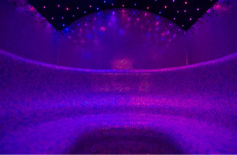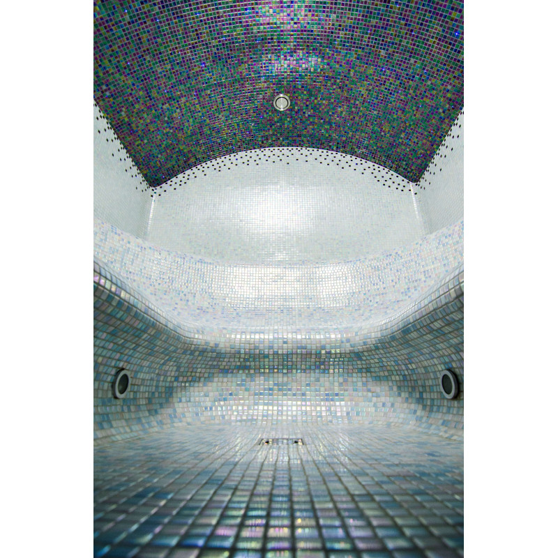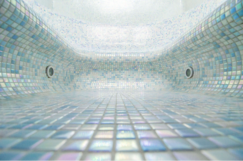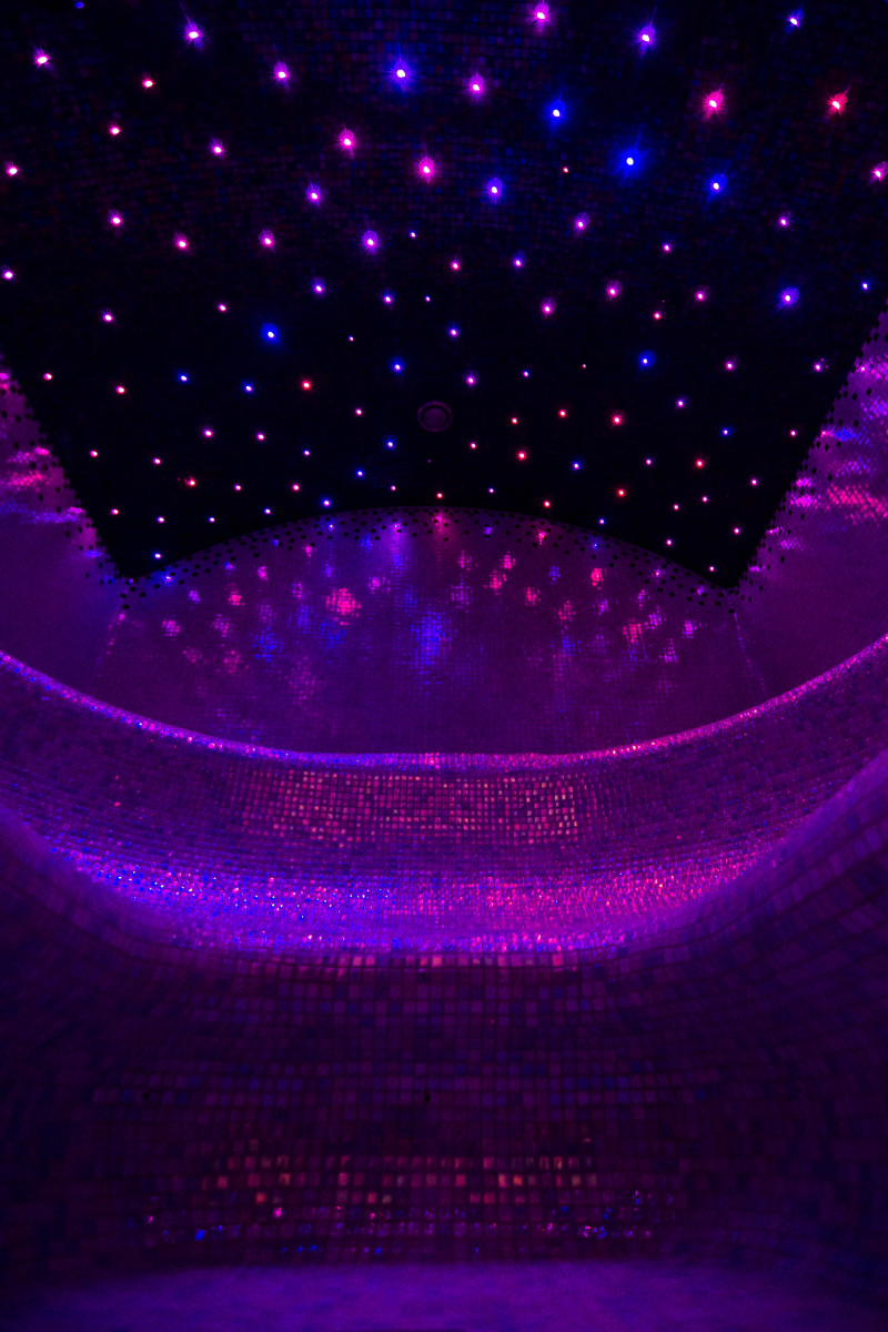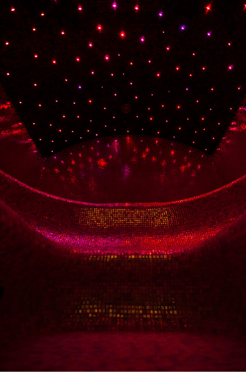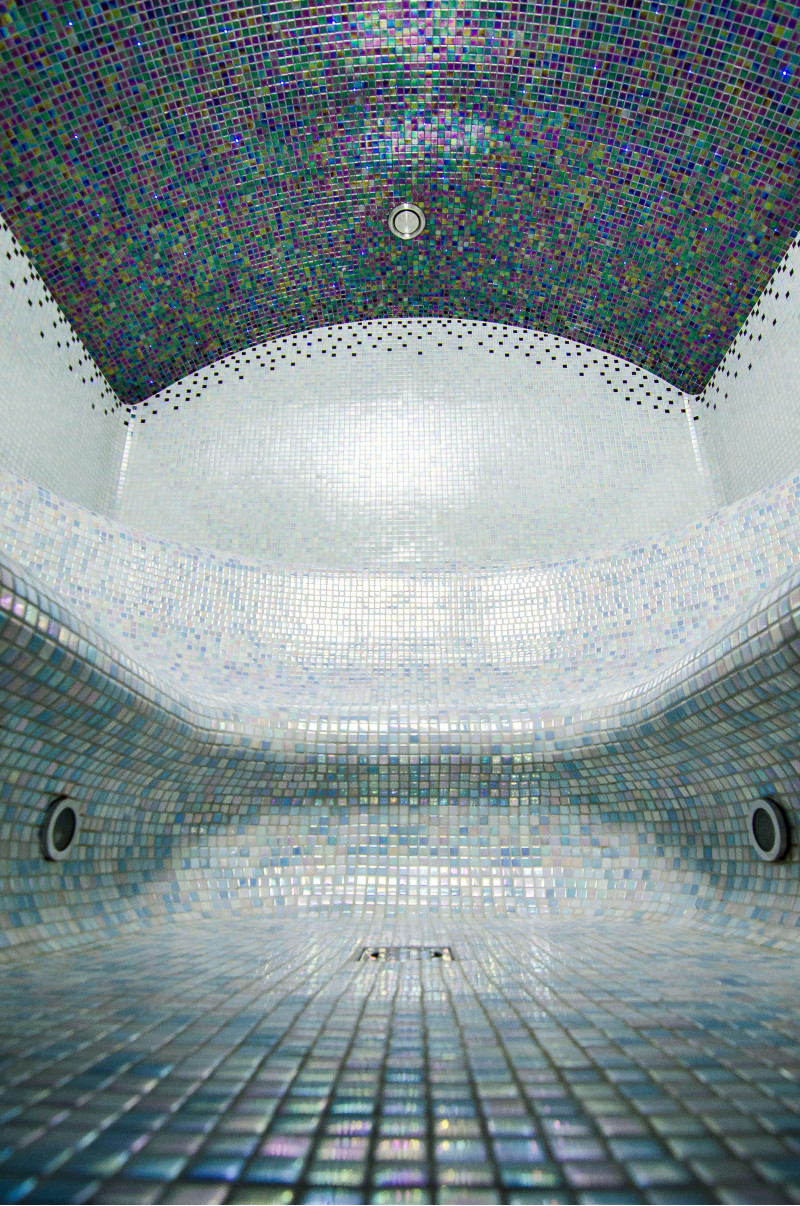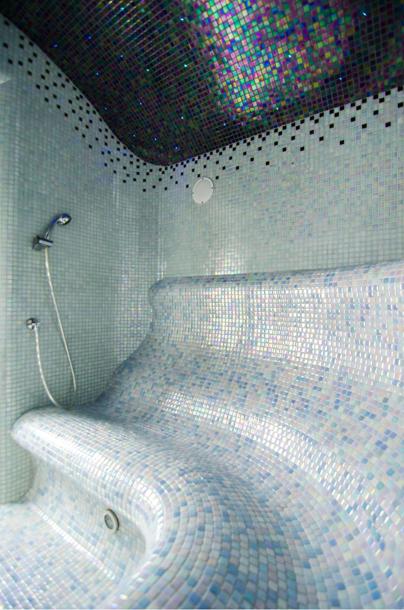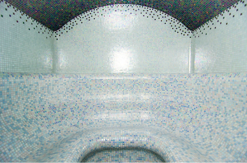 Οι πάγκοι, τα δάπεδα και οι τοίχοι είναι διακοσμημένοι με ψηφιδωτά πλακάκια σε παστέλ χρώμα. Η οροφή καλύπτεται με χρωματιστά πλακάκια, που μαζί με τον φωτισμό οροφής δίνουν ακόμα πιο εντυπωσιακή θέα.