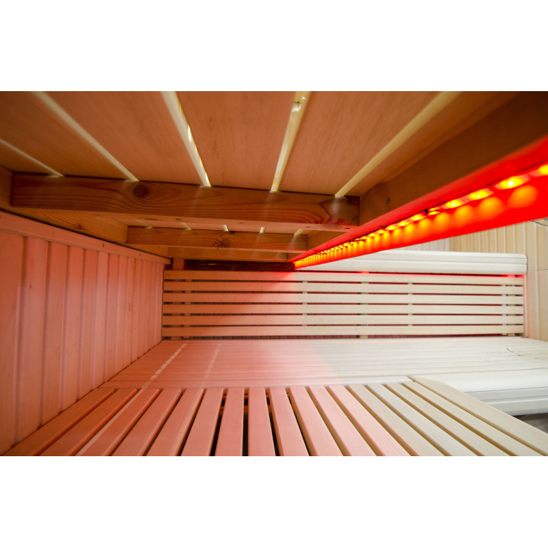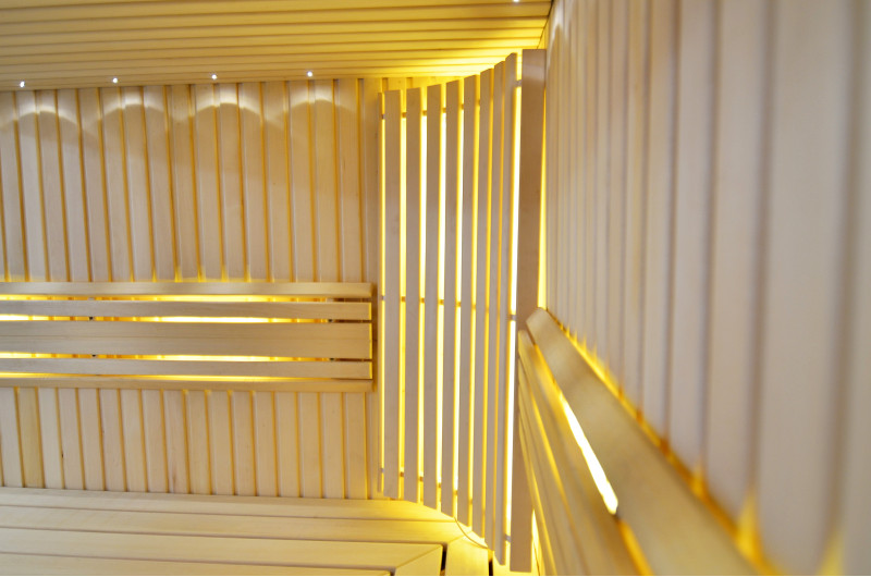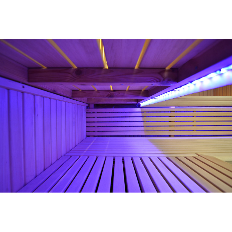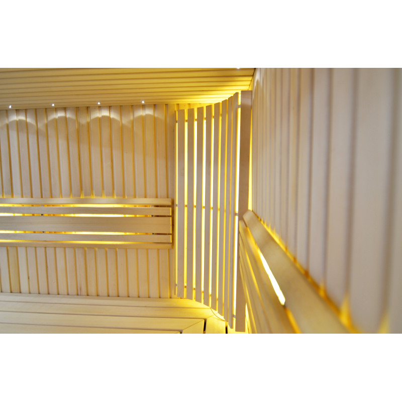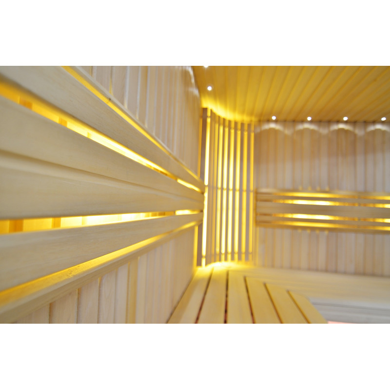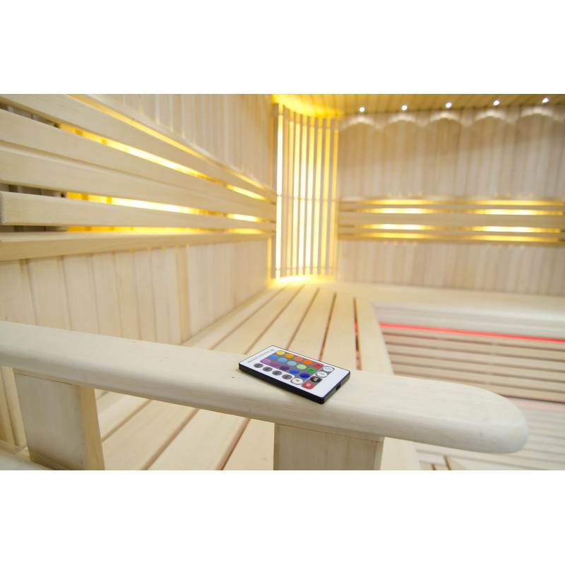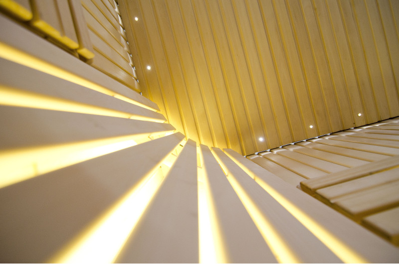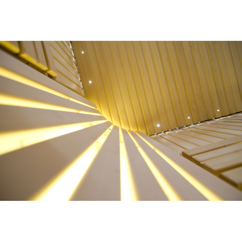 Η οροφή φωτίζεται με λευκό φωτισμό LED "φεγγάρι" - μια καλή εναλλακτική για τον φωτισμό οπτικών ινών. Στους τοίχους κάτω από τις πλάτες - LED λευκός ζεστός φωτισμός, που τονίζει τέλεια την υφή του ξύλου. Κάτω από τα παγκάκια - έγχρωμος φωτισμός LED RGB, τα χρώματα του οποίου μπορείτε να ελέγξετε εύκολα με το τηλεχειριστήριο για να δημιουργήσετε την επιθυμητή ατμόσφαιρα της σάουνας.