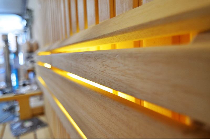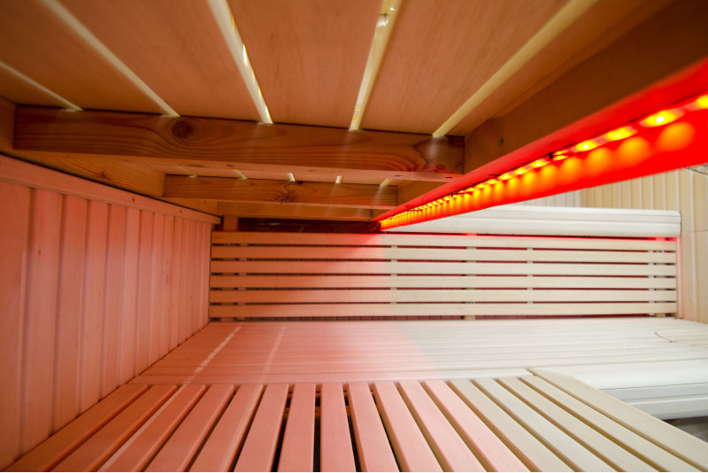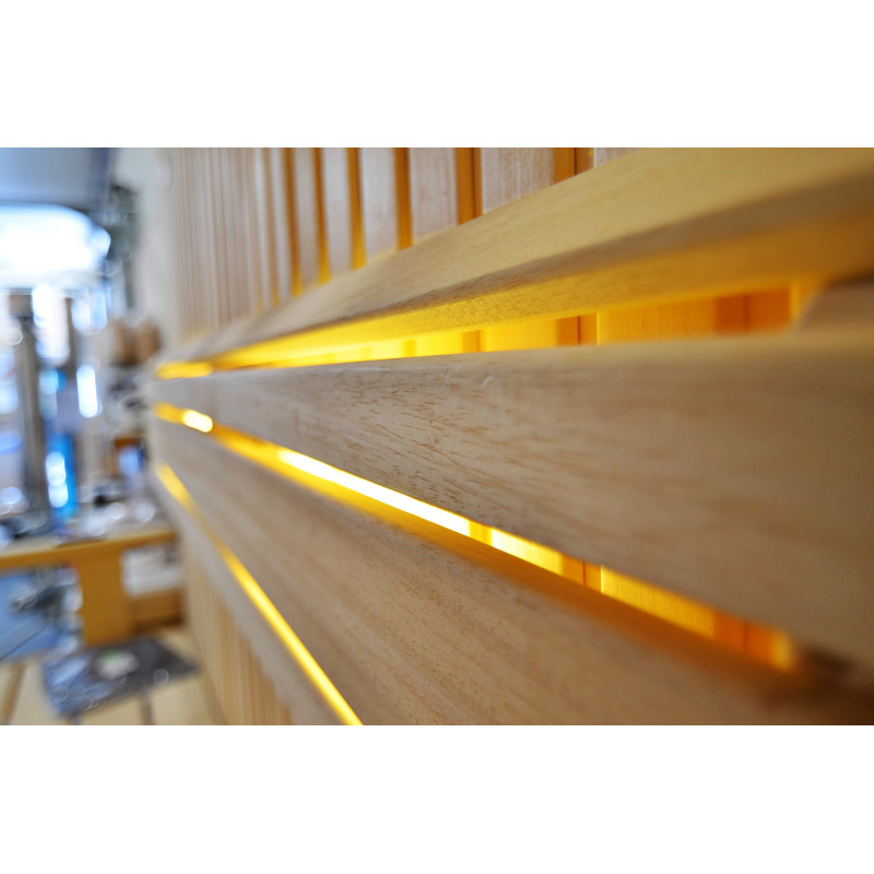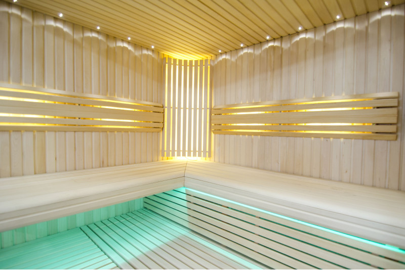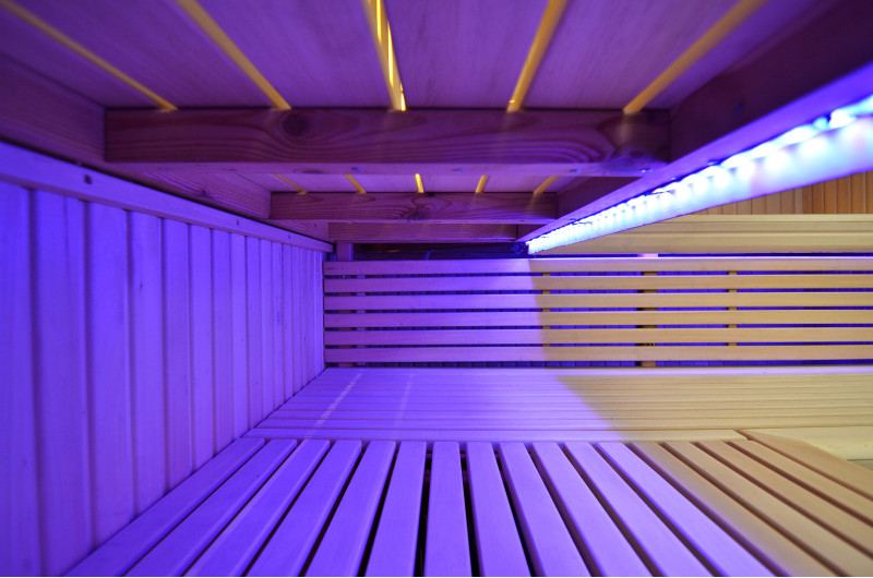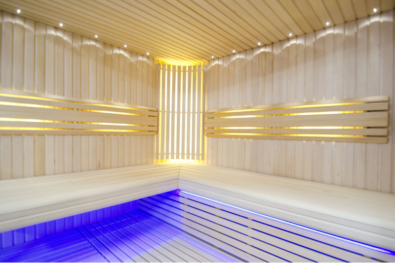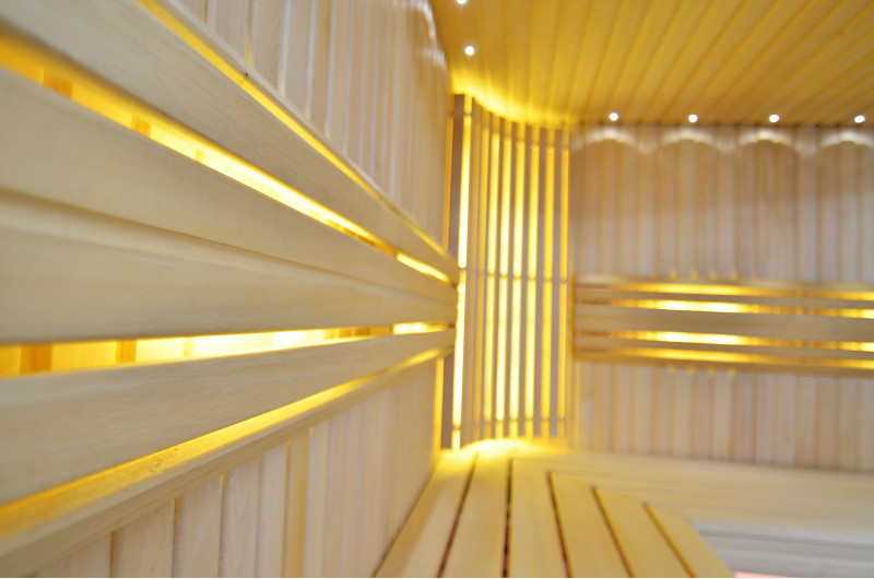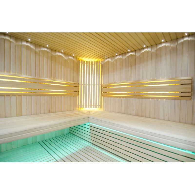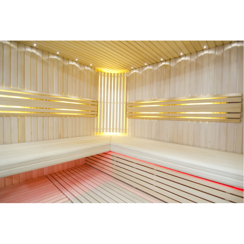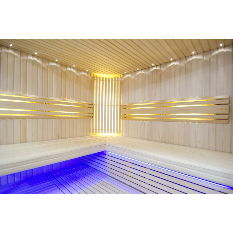Η οροφή φωτίζεται με λευκό φωτισμό LED "φεγγάρι" - μια καλή εναλλακτική για τον φωτισμό οπτικών ινών. Στους τοίχους κάτω από τις πλάτες - LED λευκός ζεστός φωτισμός, που τονίζει τέλεια την υφή του ξύλου. Κάτω από τα παγκάκια - έγχρωμος φωτισμός LED RGB, τα χρώματα του οποίου μπορείτε να ελέγξετε εύκολα με το τηλεχειριστήριο για να δημιουργήσετε την επιθυμητή ατμόσφαιρα της σάουνας.