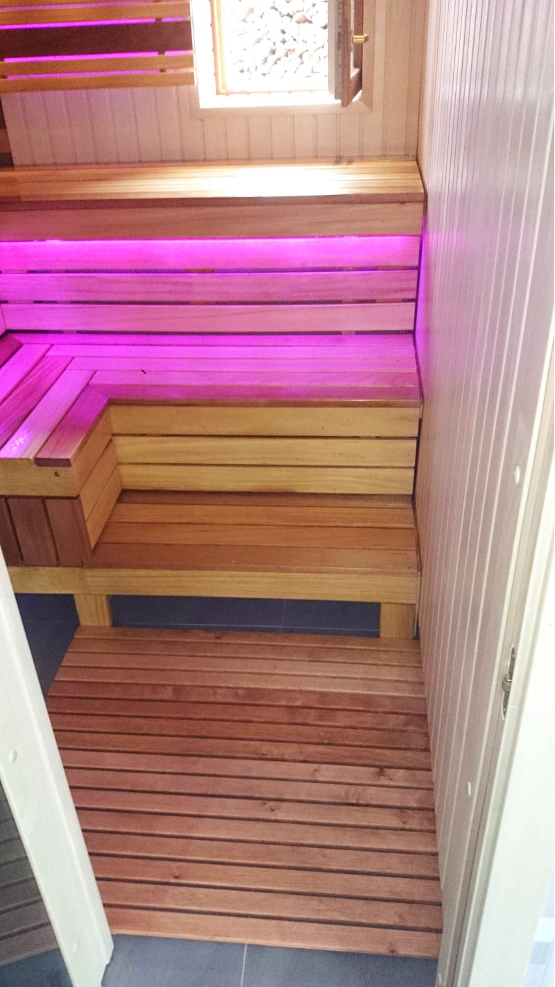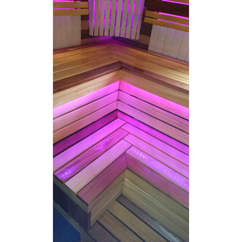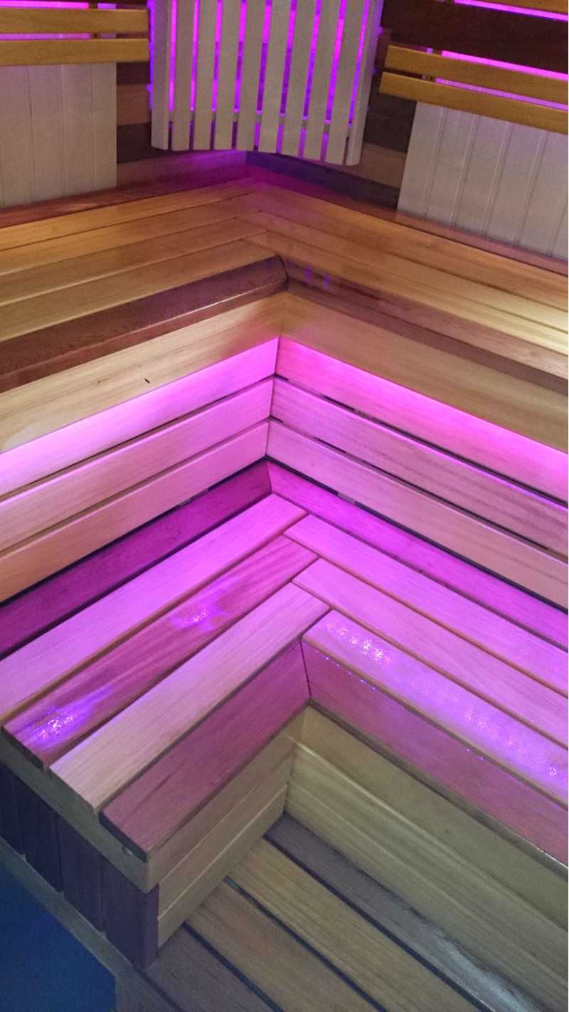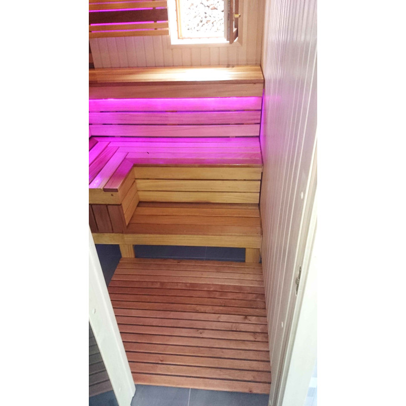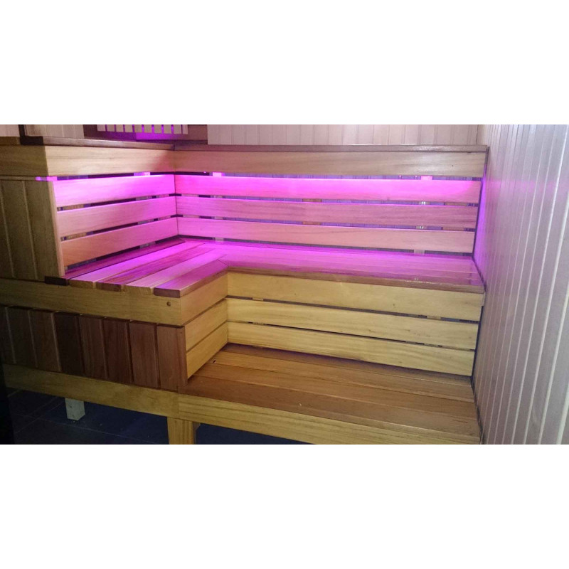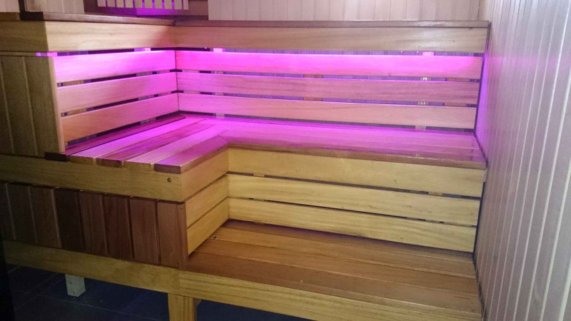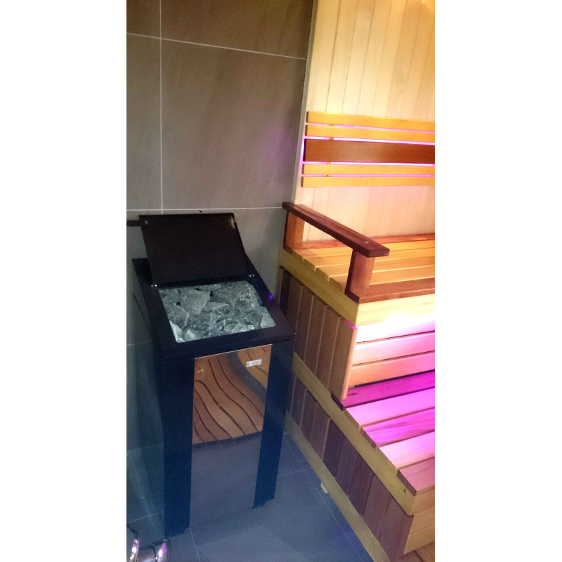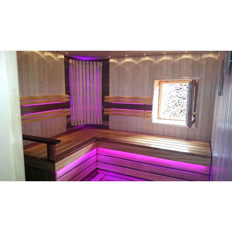 Η σάουνα είναι εξοπλισμένη με σύστημα εξαερισμού. Ο έγχρωμος φωτισμός εγκαθίσταται κάτω από τους πάγκους και πίσω από τις πλάτες, δημιουργώντας ένα ζεστό, χαλαρωτικό περιβάλλον. Κρεμαστό φωτιστικό Harvia με ξύλινο κάλυμμα abachi. Θερμόμετρο και υγρόμετρο Harvia, δύο κλίμακες.