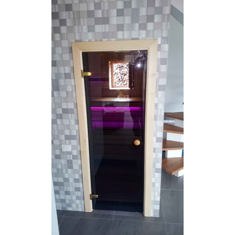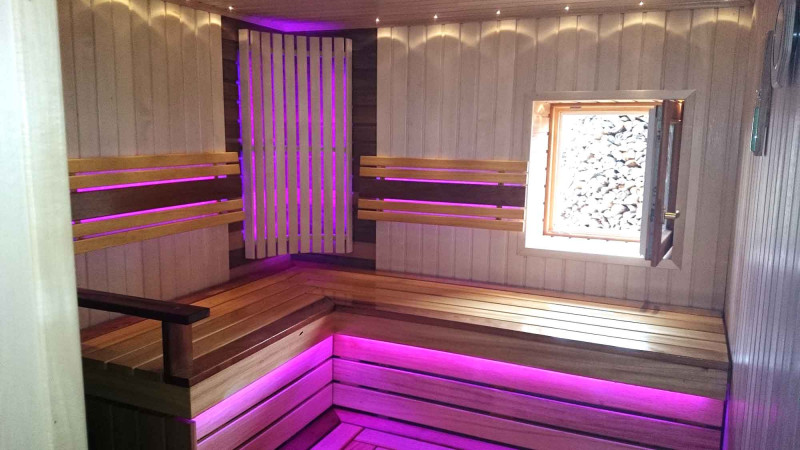 Οι πάγκοι της σάουνας και το αμπαζούρ-μπαχρέστ είναι κατασκευασμένα από σανίδες αφρικανικού ξύλου abachi. Αυτό το υψηλής ποιότητας ξύλο θερμαίνεται λιγότερο από όλα, επομένως είναι ωραίο να το αγγίζετε στη σάουνα. Οι τοίχοι και οι οροφές είναι κατασκευασμένες από επένδυση από ξύλο πεύκου. Το παράθυρο στη σάουνα υποστηρίζει τη ροή του φυσικού φωτός, διευρύνει το χώρο και δημιουργεί μια σύνδεση με τη φύση. Γυαλί παραθύρου - σκληρυμένο, ανθεκτικό στη θερμότητα, μπρούτζινο γυαλί.