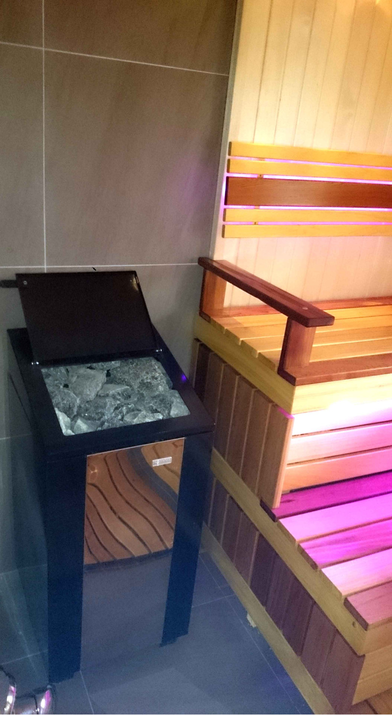 Για τη σάουνα έχει επιλεγεί ένας πολύ υψηλής ποιότητας θερμαντήρας ξύλου Narvi Steam Master WT για 10-130 m3. Χωράει πολύ μεγάλη ποσότητα λίθων - 100 κιλά. Παράγει πολύ ευχάριστο και ποιοτικό ατμό.