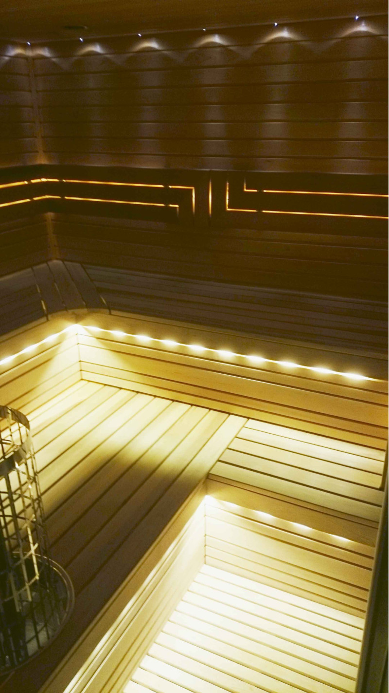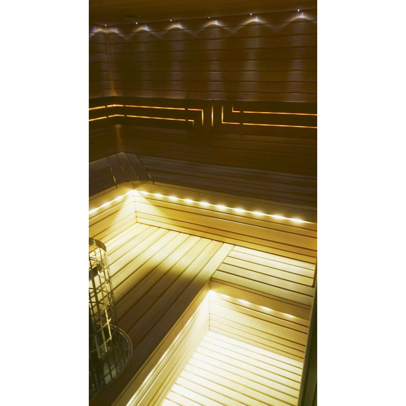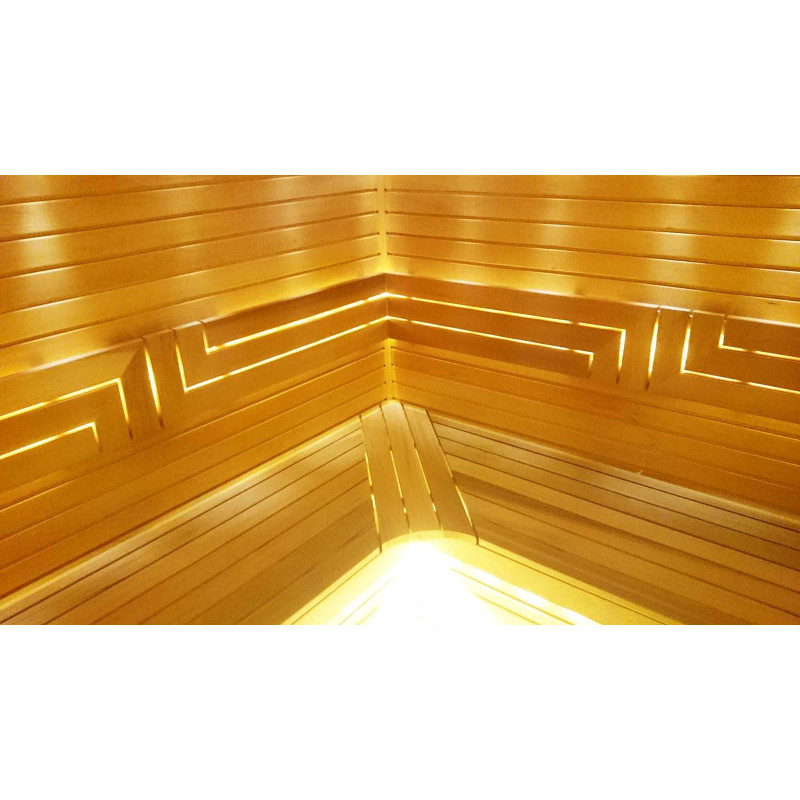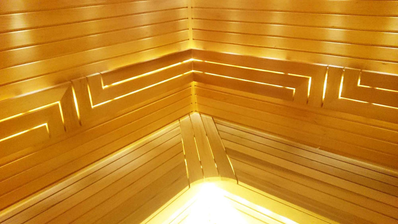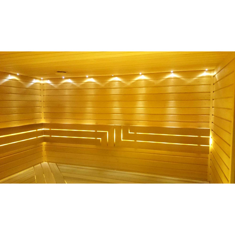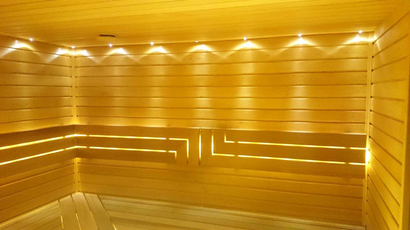 Η οροφή είναι εξοπλισμένη με αποκλειστικό φωτισμό LED "Sun", λωρίδες φωτισμού LED είναι εγκατεστημένες κάτω από τους πάγκους και τις πλάτες, ζεστό λευκό χρώμα. Χάρη στον φωτισμό, παρέχεται μέρος της χαλαρωτικής επίδρασης της σάουνας.