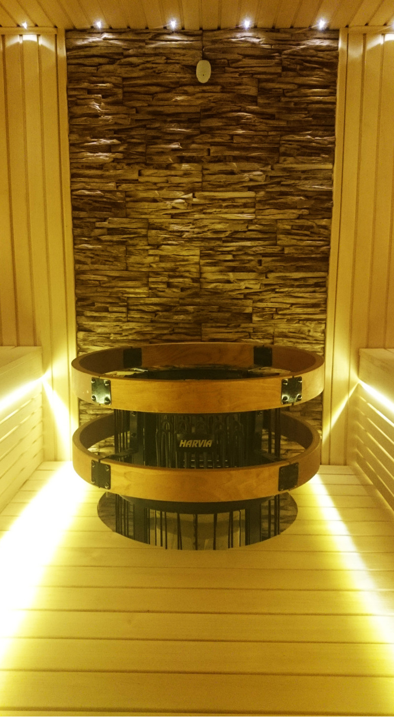 Heater - Harvia Legend, που δίνει πολύ ατμό. Γεμάτο με μεγάλη ποσότητα λίθων διαβάσης ολιβίνης. Ο θερμαντήρας ελέγχεται από μια ψηφιακή κονσόλα Griffin, η οποία μπορεί να ρυθμίσει τη θερμοκρασία σε ένα βαθμό ακρίβειας.