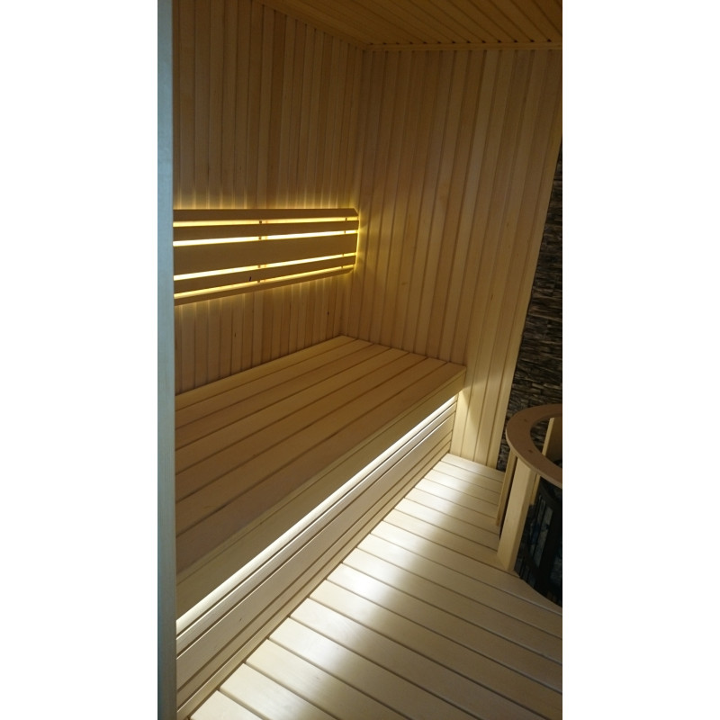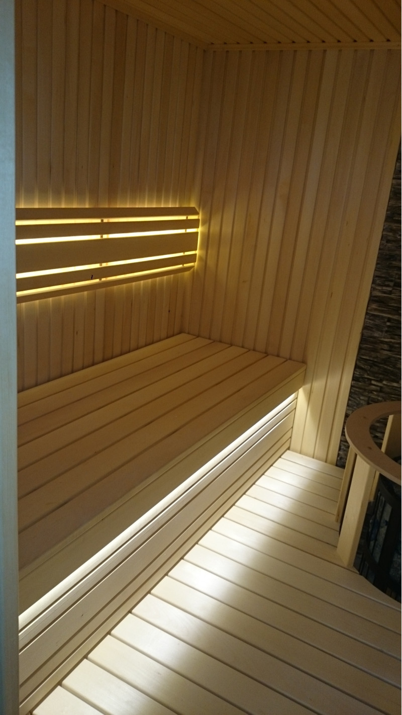 Ο φωτισμός δημιουργεί τη μεγαλύτερη άνεση στη σάουνα. Σε αυτή την περίπτωση, τοποθετείται ζεστός λευκός φωτισμός LED στις πλάτες και κάτω από τους πάγκους.