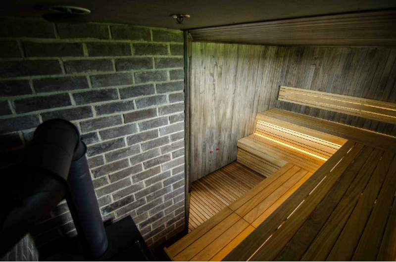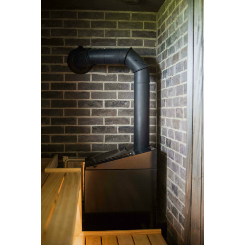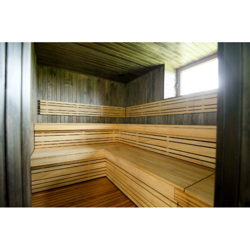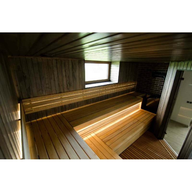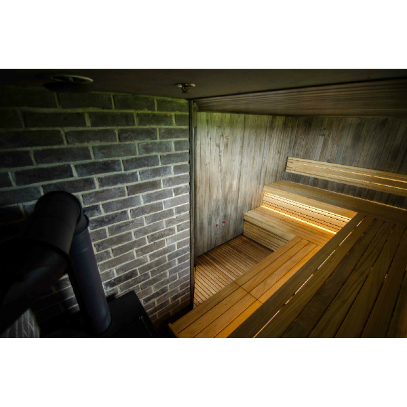 Οι τοίχοι και η οροφή, κερωμένα με ειδικό μαύρο κερί, έρχονται σε αντίθεση με τους φωτεινούς πάγκους της σάουνας, το δωμάτιο φαίνεται μοναδικό, δημιουργώντας μια ζεστή και μοντέρνα ατμόσφαιρα. Αυτή η αντίθεση πάγκων και τοίχων τονίζεται περαιτέρω από τον ενσωματωμένο λευκό φωτισμό LED που είναι ανθεκτικός στη θερμοκρασία και την υγρασία κάτω από τους πάγκους και τις πλάτες.