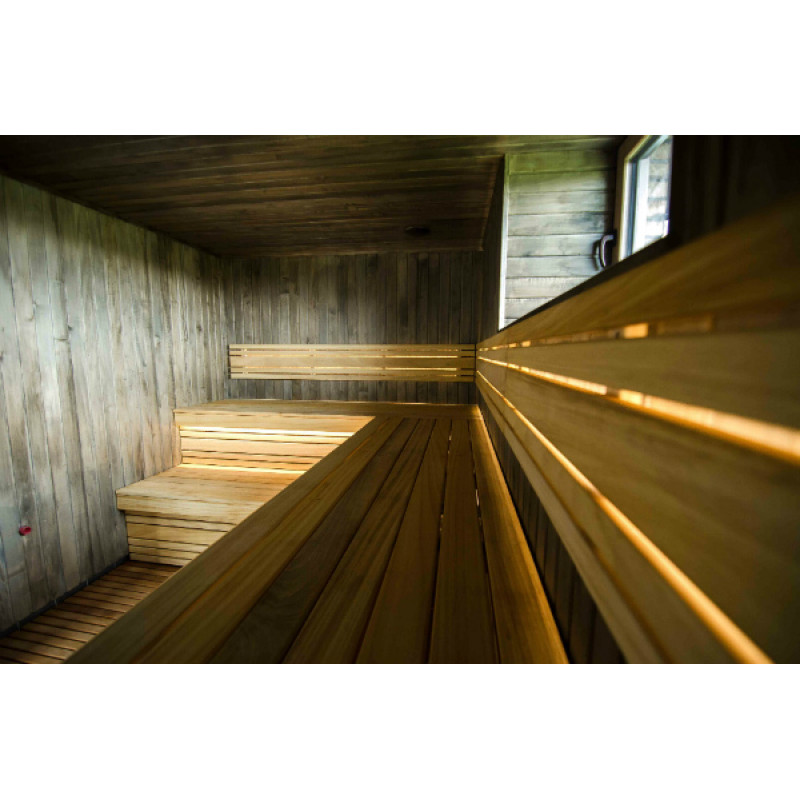 Το υψηλής ποιότητας αφρικανικό ξύλο Abachi επιλέγεται για τις ξαπλώστρες της σάουνας, τις πλάτες και τις σχάρες δαπέδου. Αυτό το ξύλο όχι μόνο φαίνεται υπέροχο, αλλά επίσης δεν θερμαίνεται, καθιστώντας αδύνατο να καεί όταν το αγγίζετε. Είναι ιδιαίτερα βολικό και ευχάριστο να απολαμβάνετε μια σάουνα σε τέτοιους πάγκους.