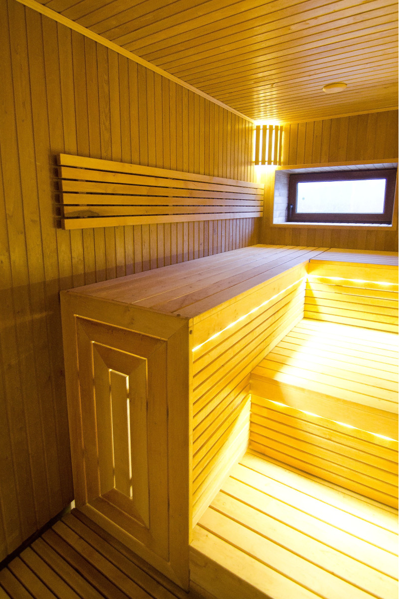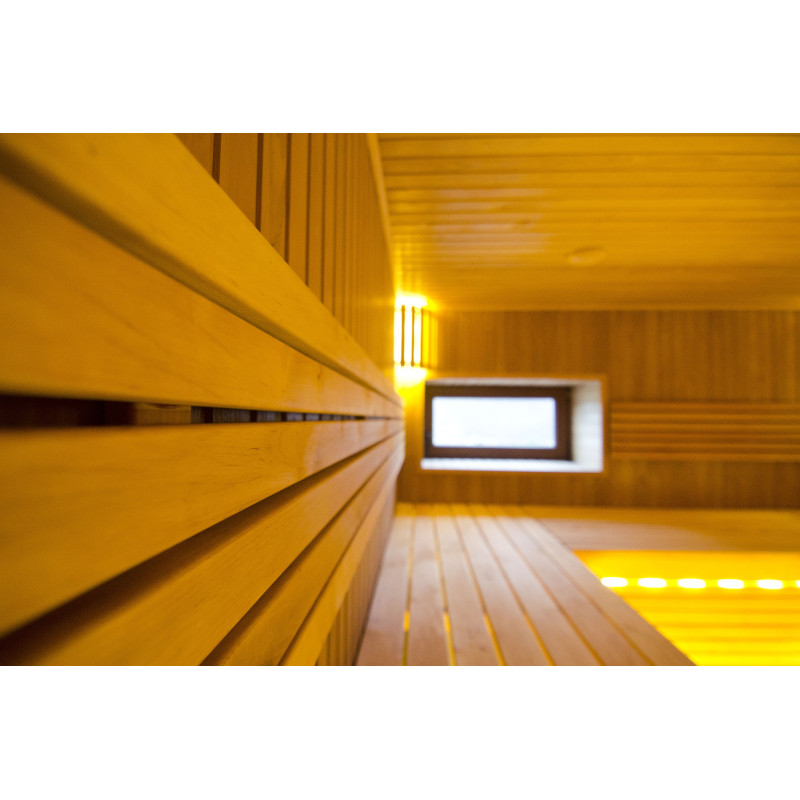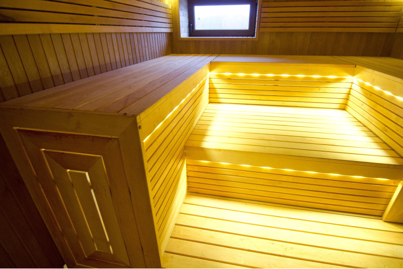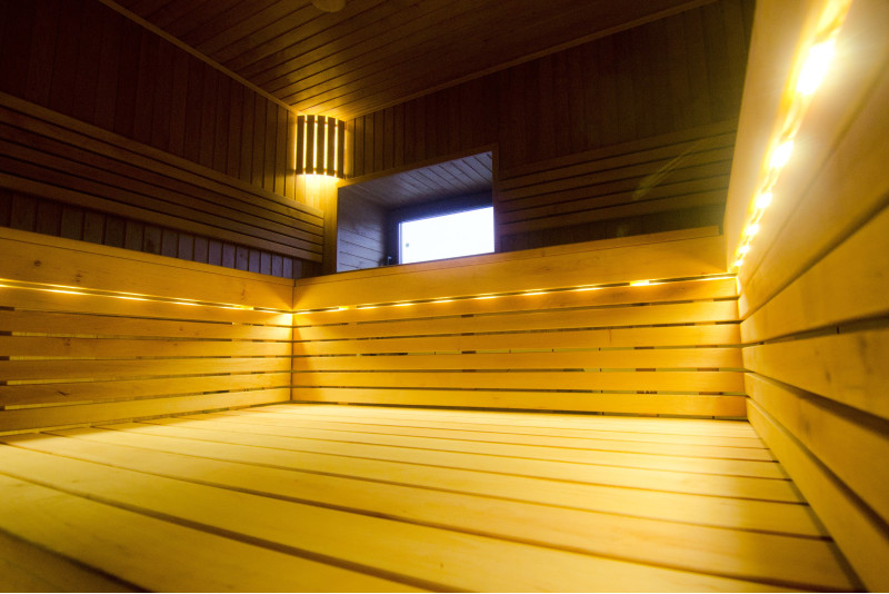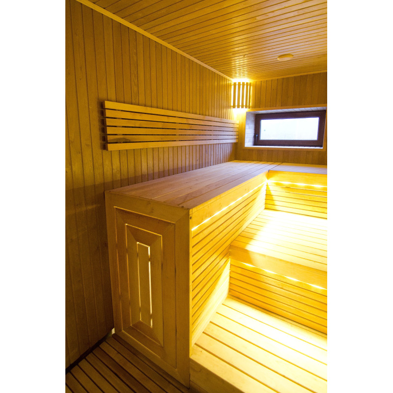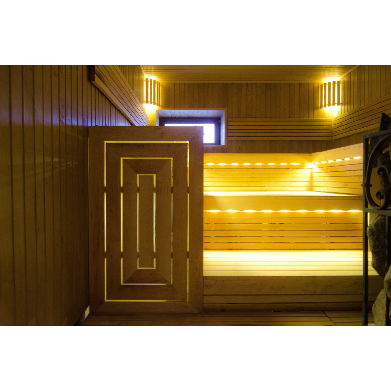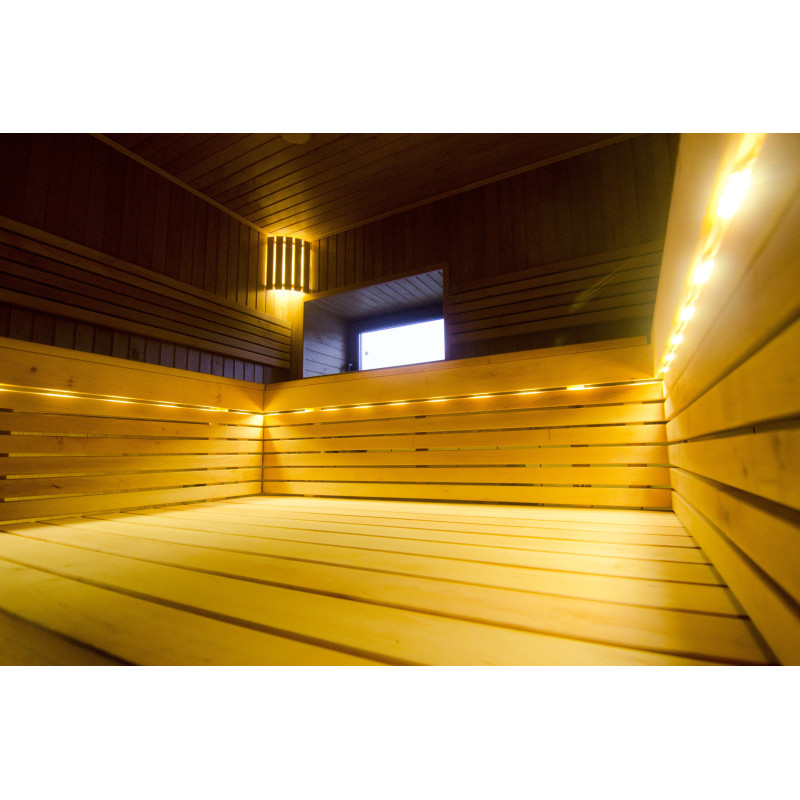 Η σάουνα είναι εξοπλισμένη με φωτισμό LED ζεστού χρώματος κάτω από τις ξαπλώστρες και επιτοίχια φωτιστικά με ξύλινα καλύμματα.