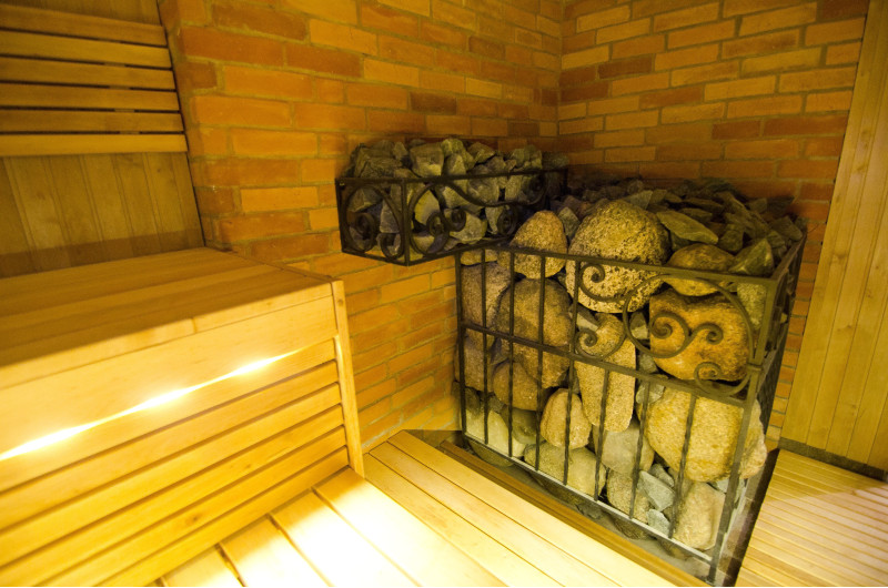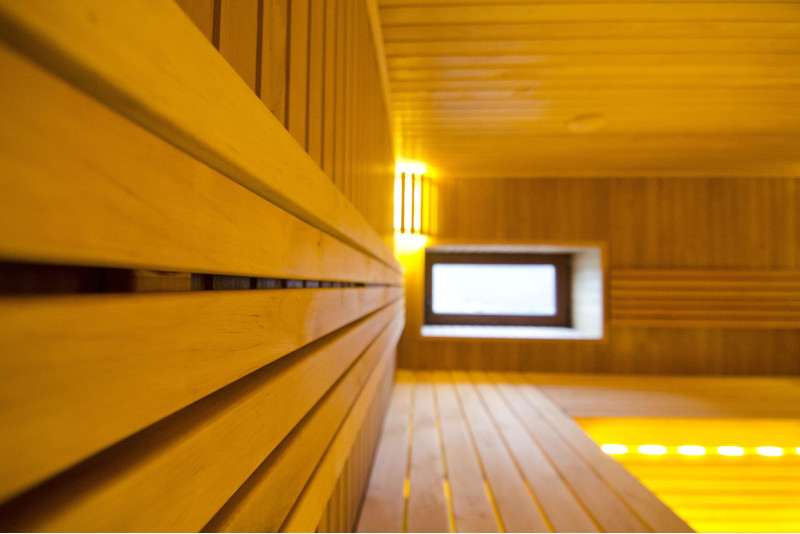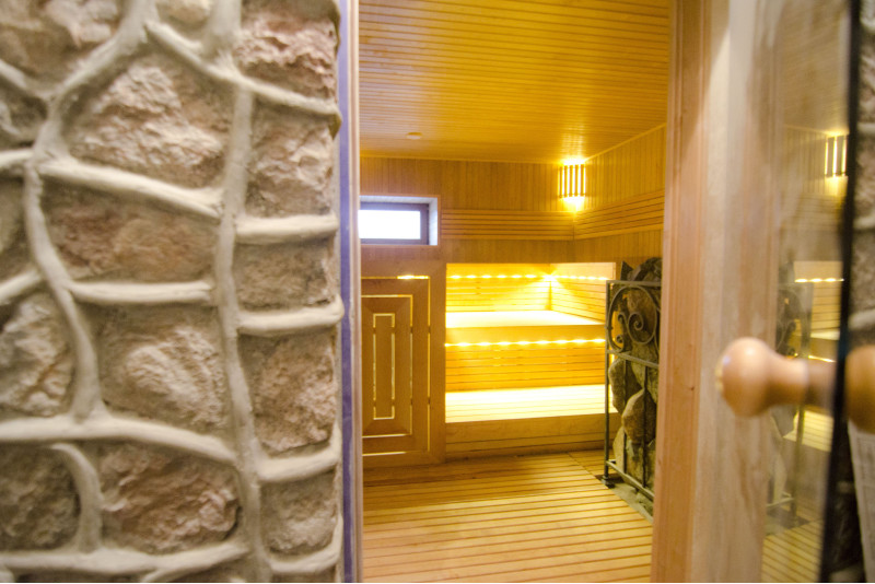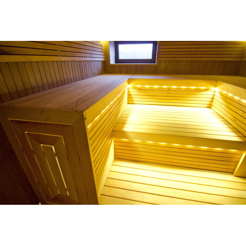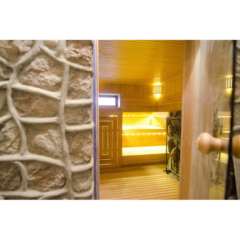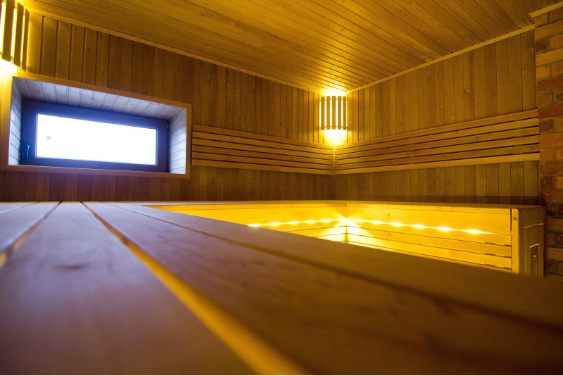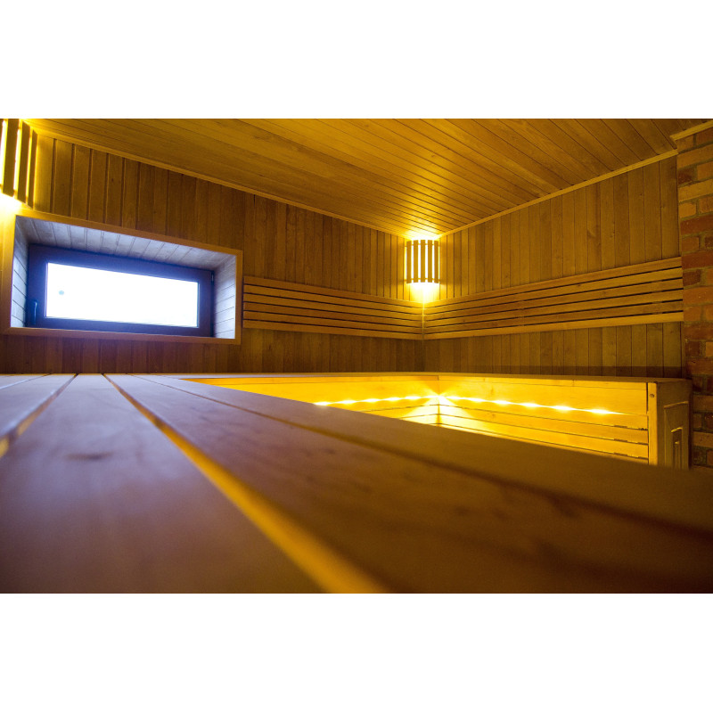 Η σάουνα είναι εξοπλισμένη με φωτισμό LED ζεστού χρώματος κάτω από τις ξαπλώστρες και επιτοίχια φωτιστικά με ξύλινα καλύμματα.