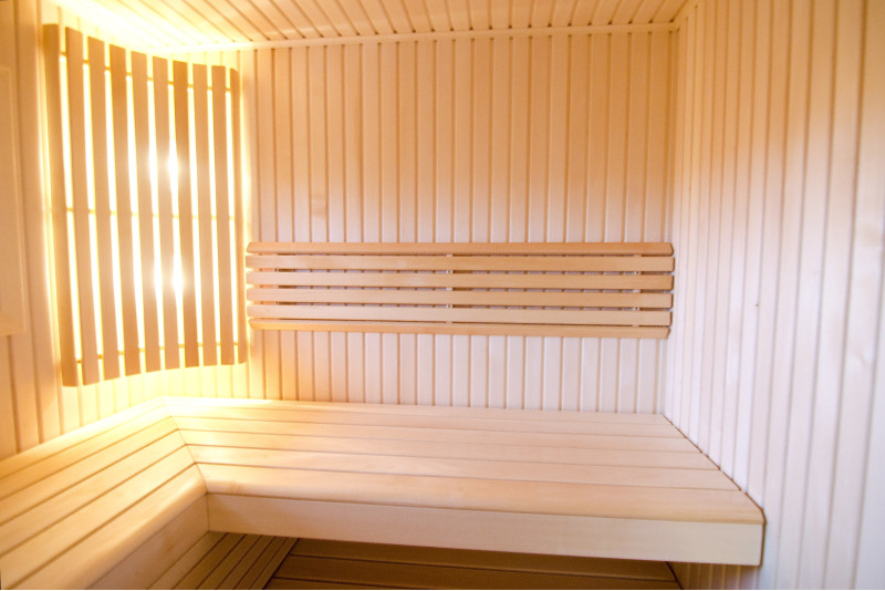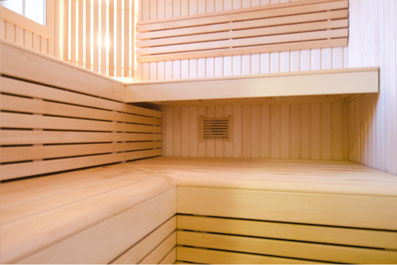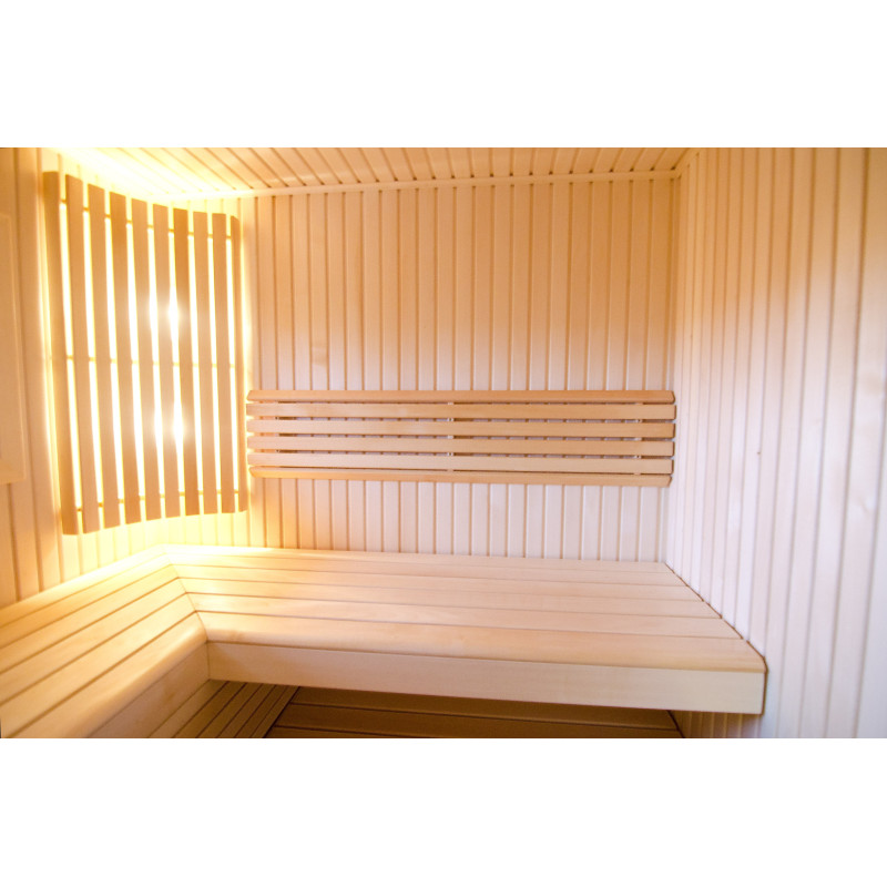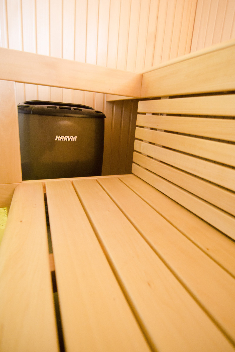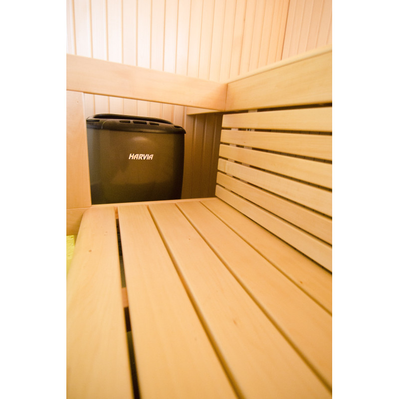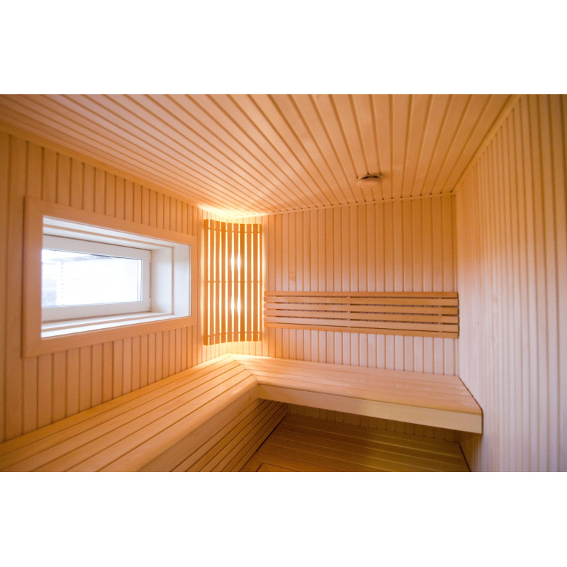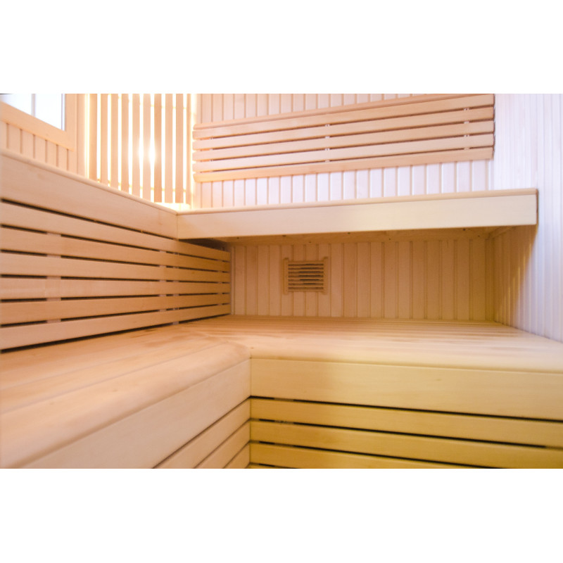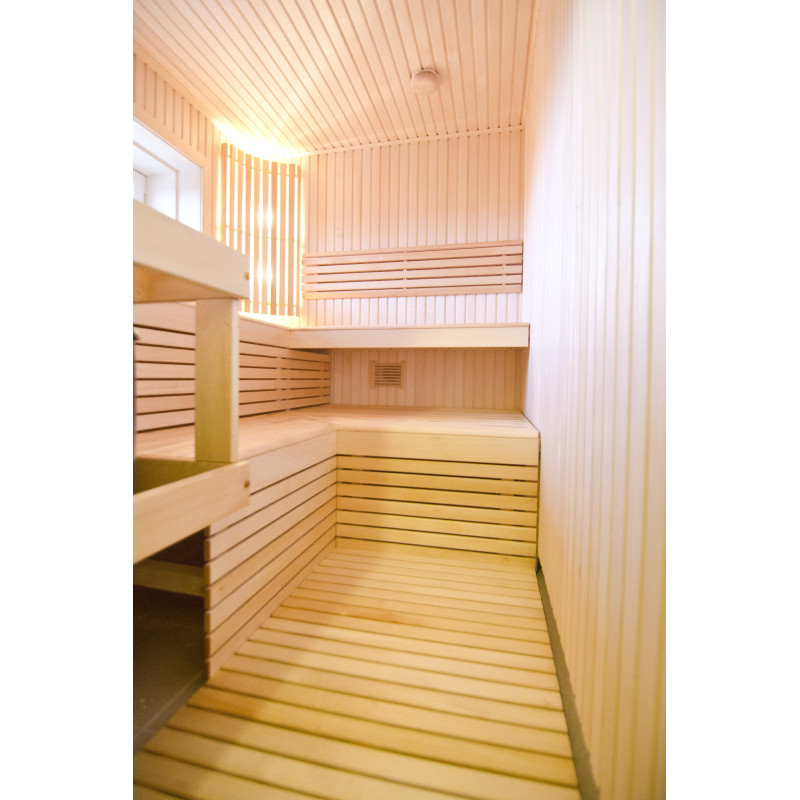 Οι επενδύσεις τοίχων και οι πάγκοι είναι κατασκευασμένοι από ξύλο φλαμουριάς υψηλής ποιότητας. Το ξύλο είναι εξαιρετικά ελαφρύ, δίνοντας στη σάουνα μια αίσθηση χώρου.