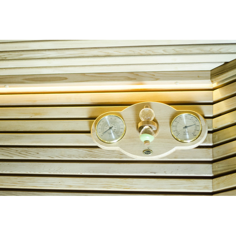 Αξεσουάρ σάουνας: σετ κουβά και κουτάλας, ξύλινο θερμόμετρο με υγρόμετρο και κλεψύδρα.