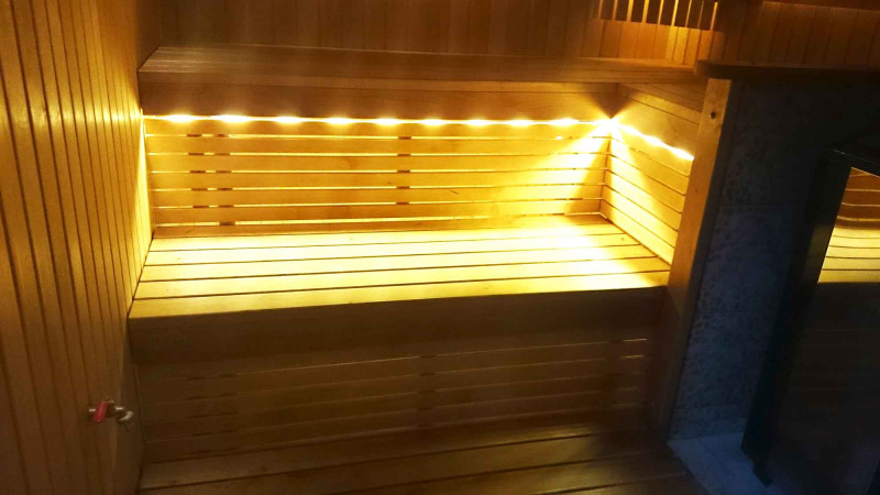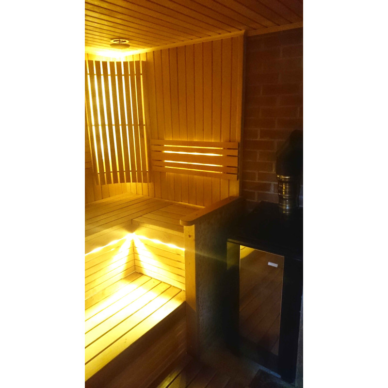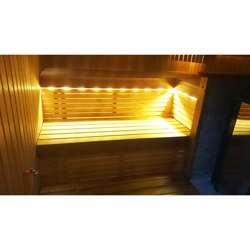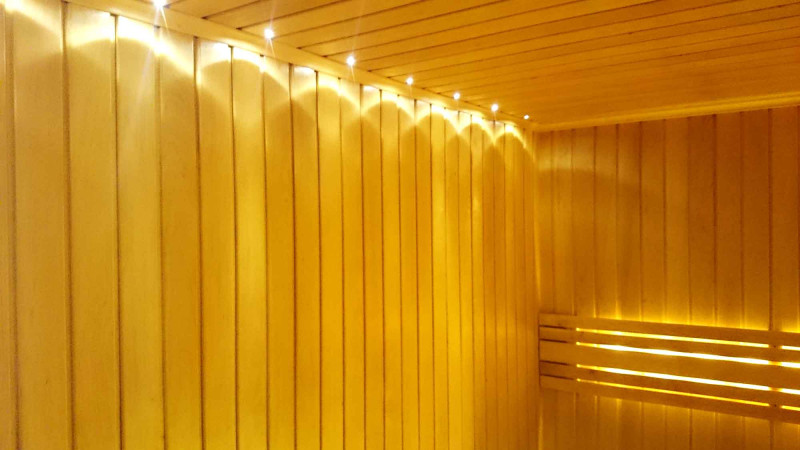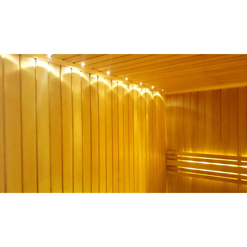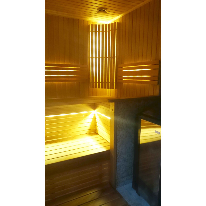 Ο φωτισμός της σάουνας είναι ένα πολύ σημαντικό στοιχείο, γιατί είναι ο φωτισμός που παρέχει μέρος της χαλαρωτικής επίδρασης της σάουνας. Αυτή η σάουνα είναι εξοπλισμένη με φώτα LED στην οροφή, κάτω από τις ξαπλώστρες και τις πλάτες. Τα φωτιστικά είναι ανθεκτικά στην υγρασία και τις υψηλές θερμοκρασίες.