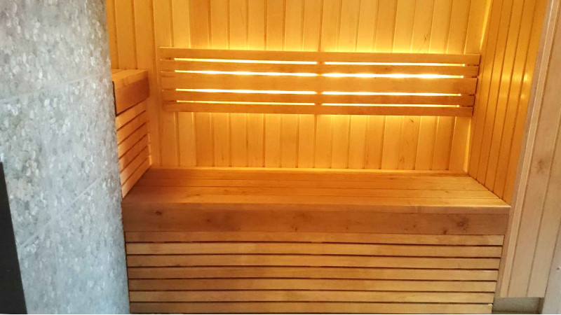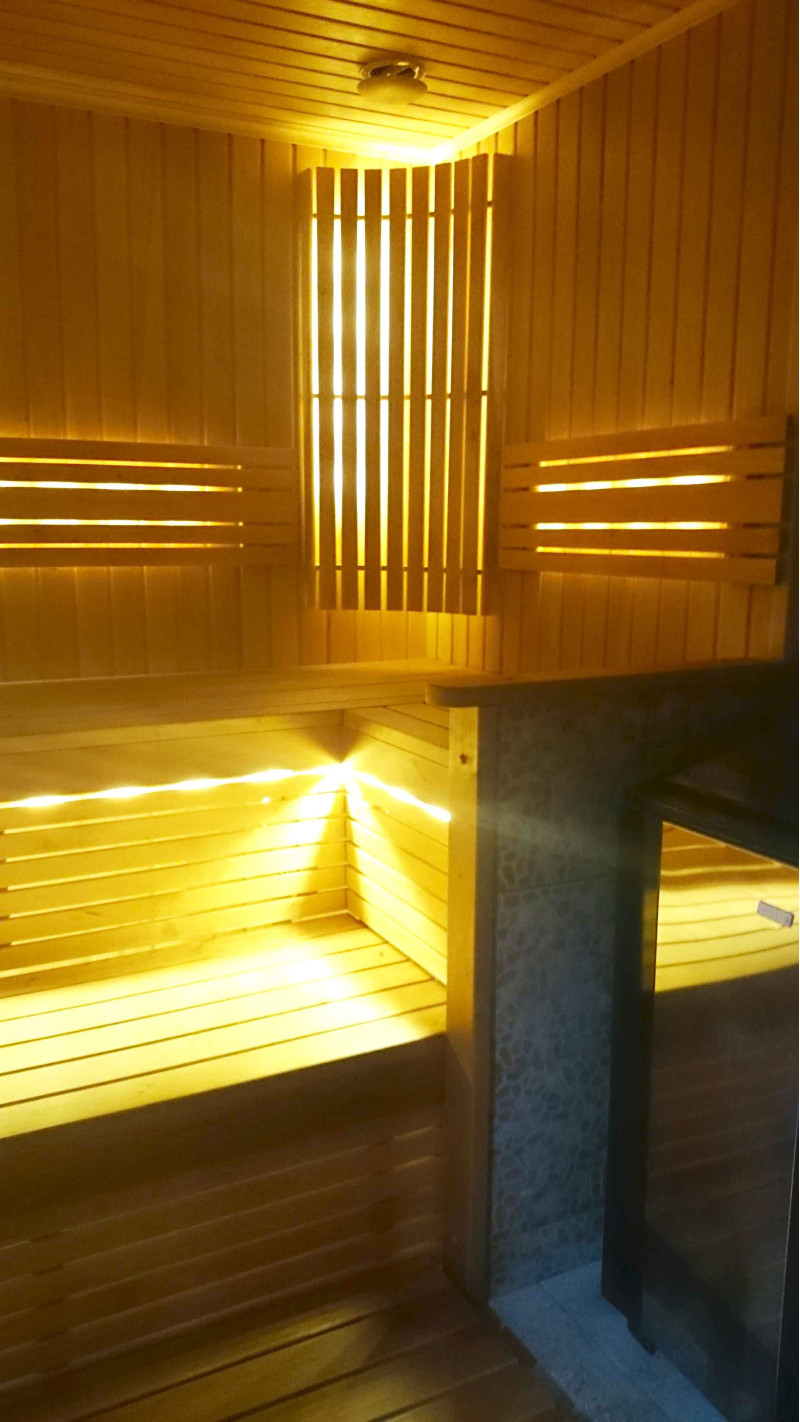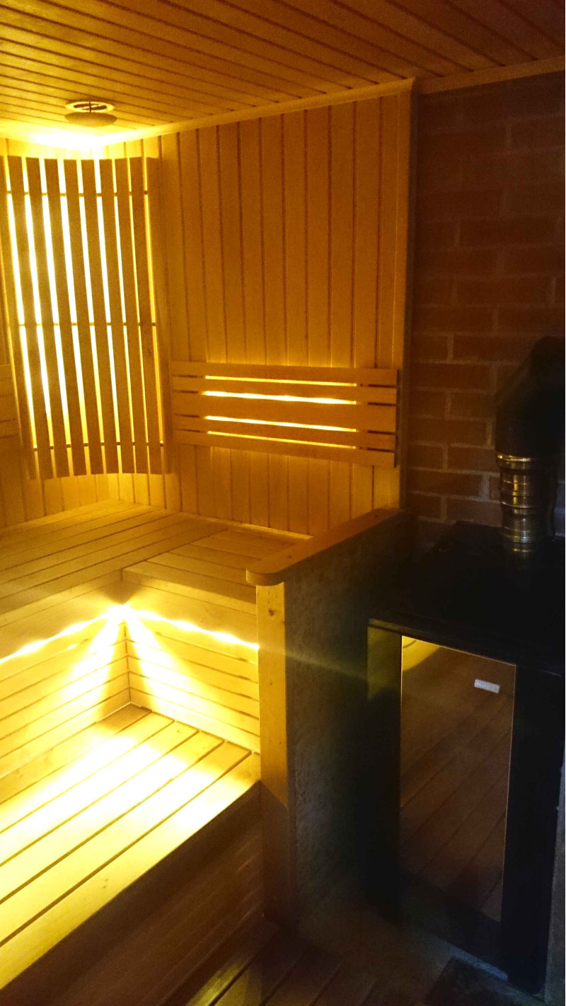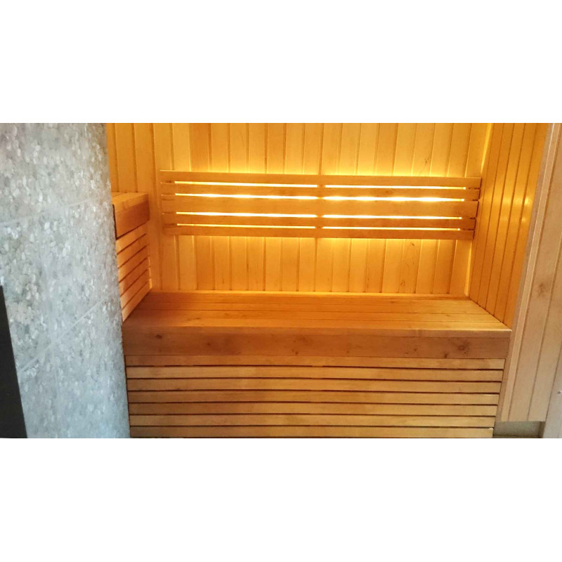 Ο φωτισμός της σάουνας είναι ένα πολύ σημαντικό στοιχείο, γιατί είναι ο φωτισμός που παρέχει μέρος της χαλαρωτικής επίδρασης της σάουνας. Αυτή η σάουνα είναι εξοπλισμένη με φώτα LED στην οροφή, κάτω από τις ξαπλώστρες και τις πλάτες. Τα φωτιστικά είναι ανθεκτικά στην υγρασία και τις υψηλές θερμοκρασίες.