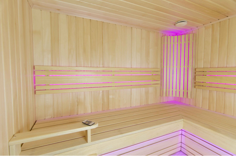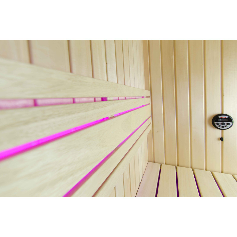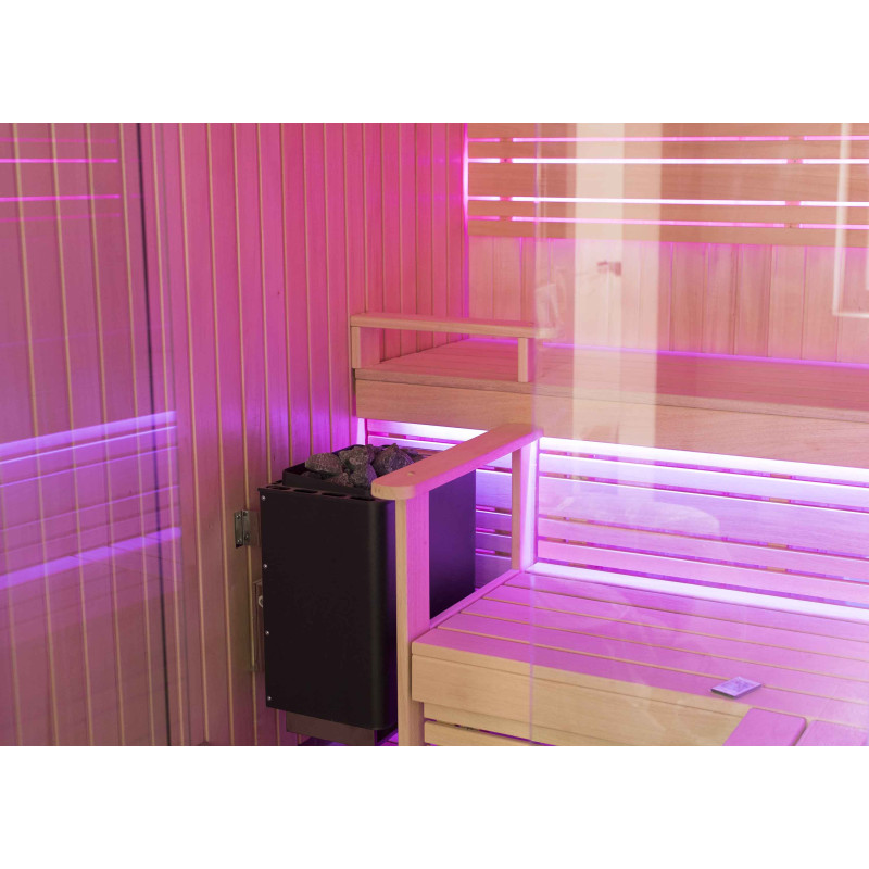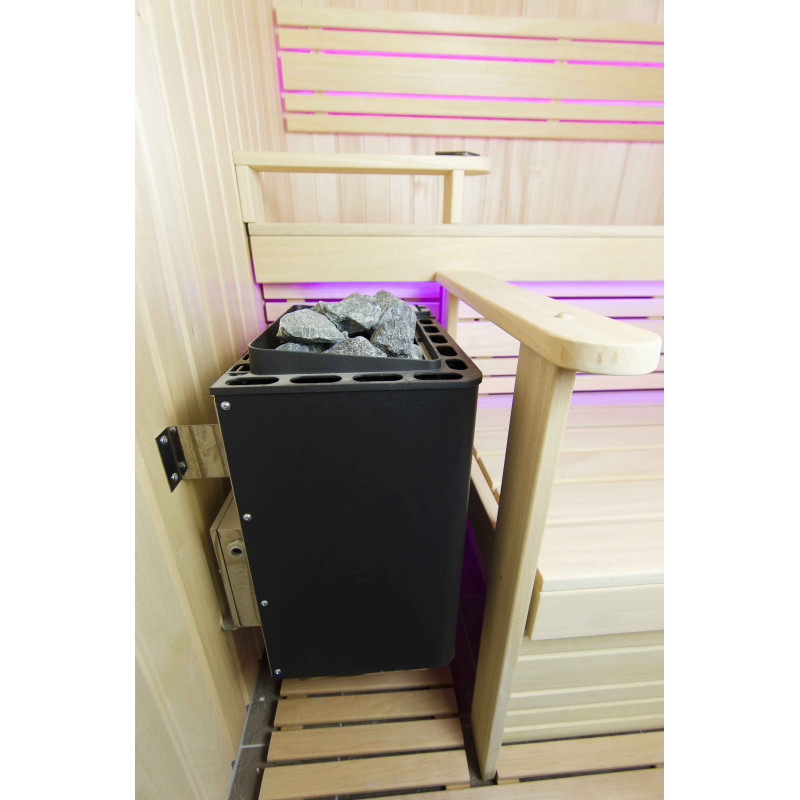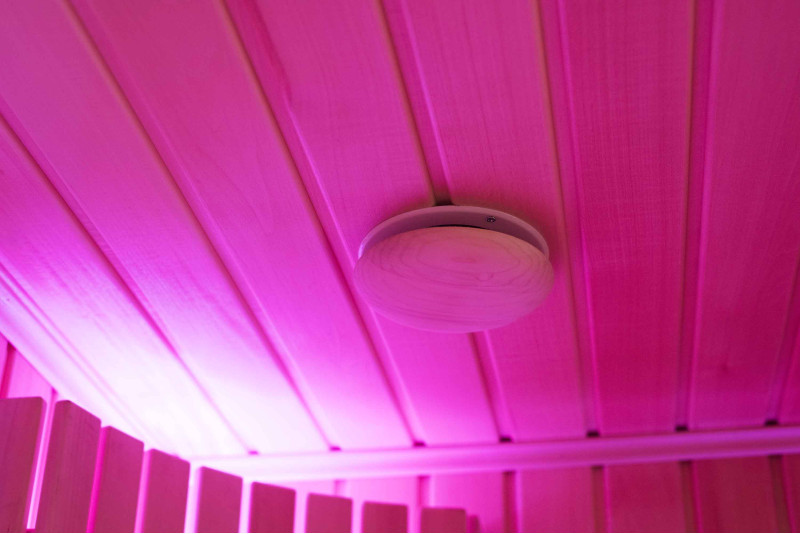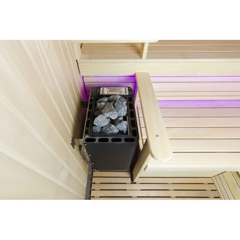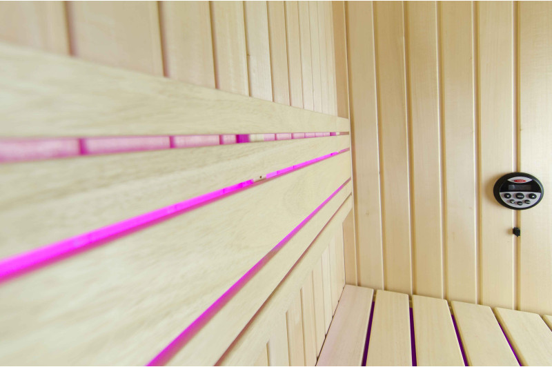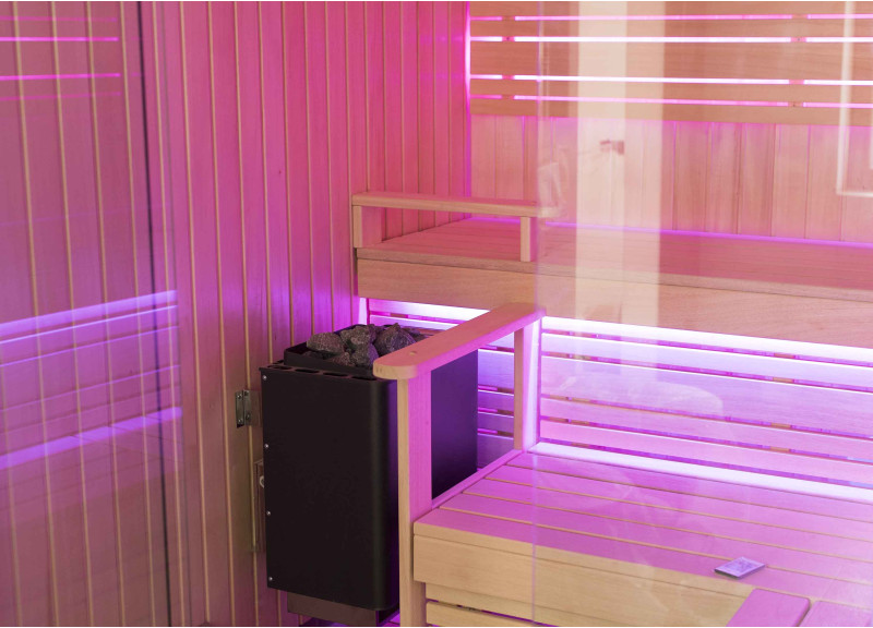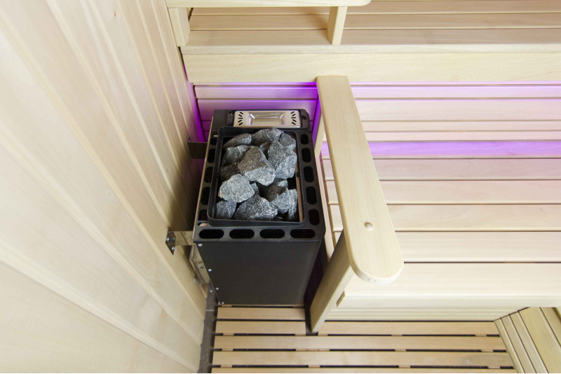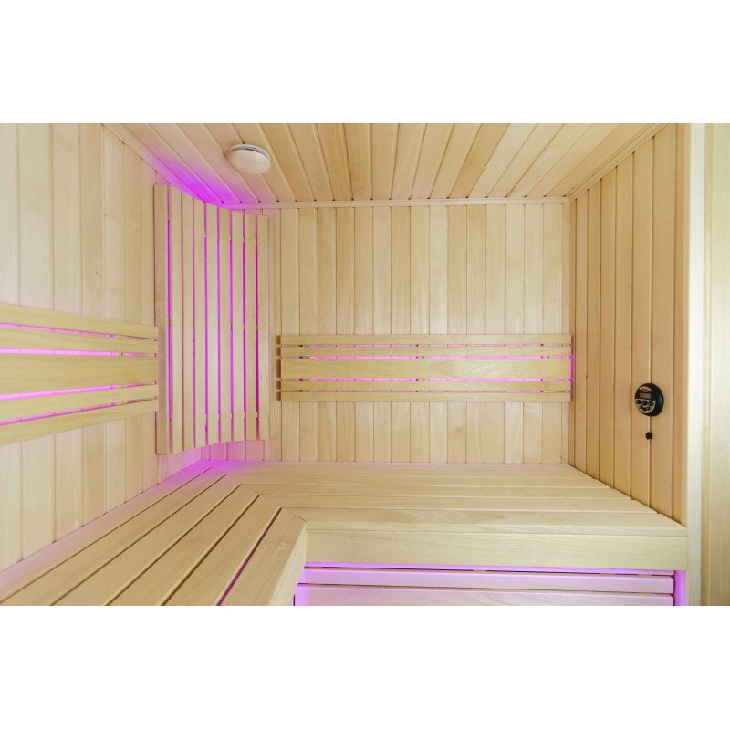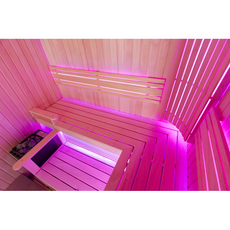 Το εσωτερικό της σάουνας είναι κατασκευασμένο από υψηλής ποιότητας ξύλο linden, οι ξαπλώστρες είναι κατασκευασμένες από ξύλο abachi - χωρίς θέρμανση και είναι ιδανικές για τη σάουνα.