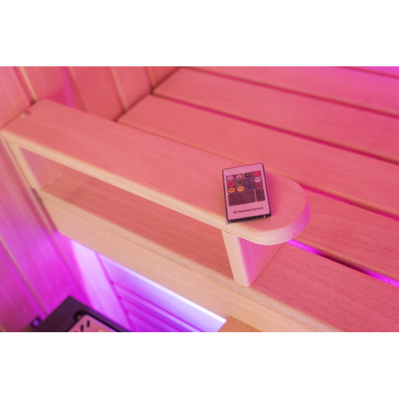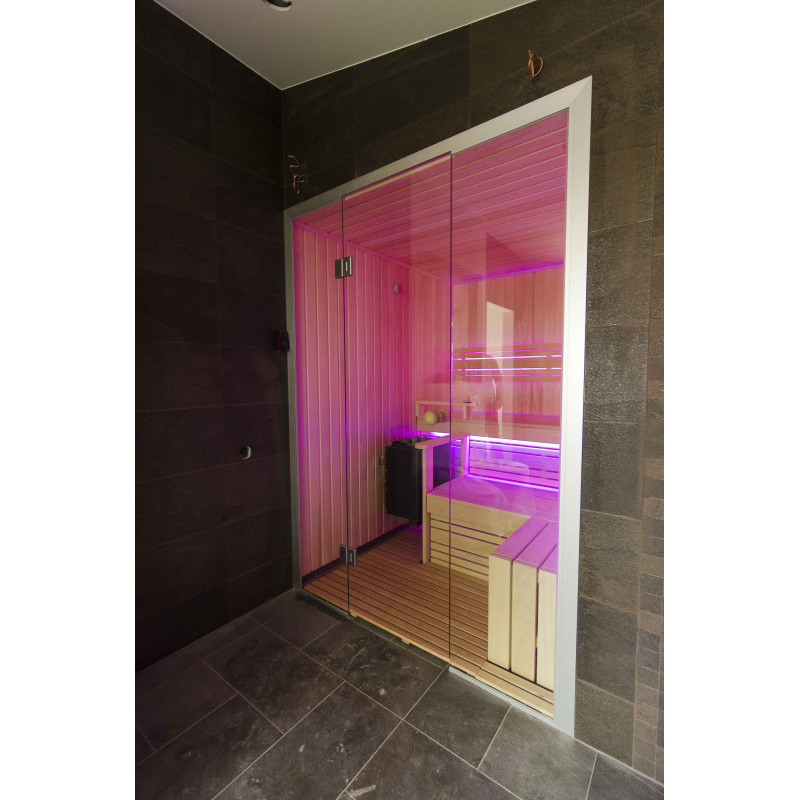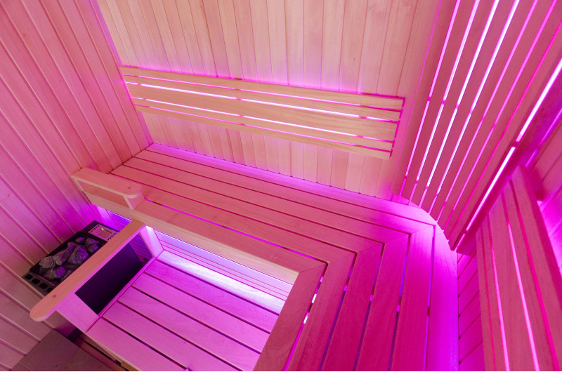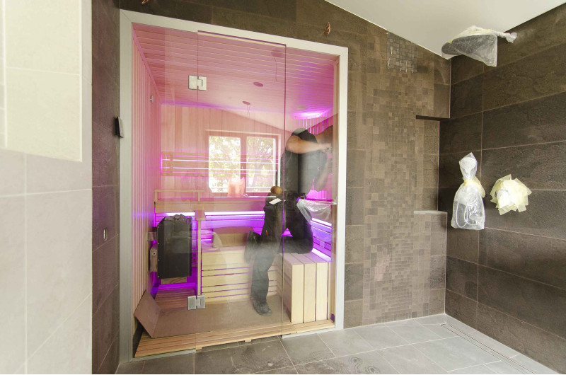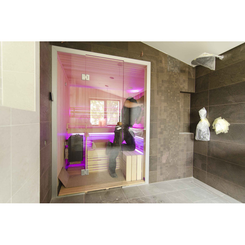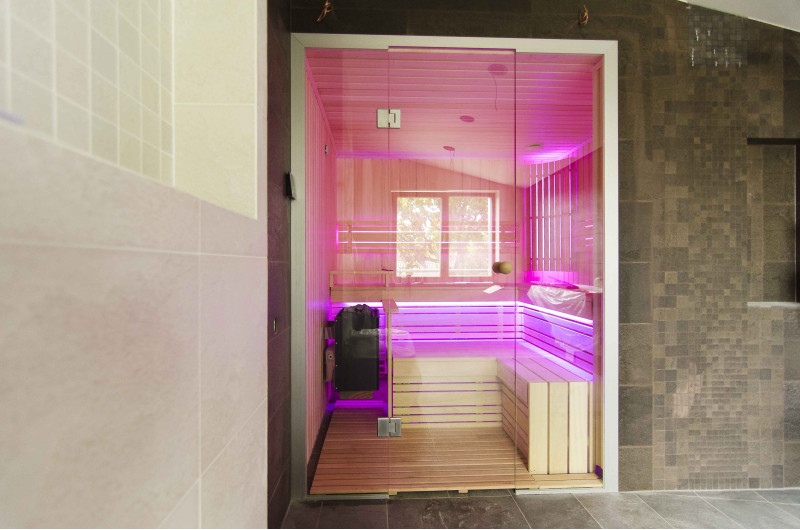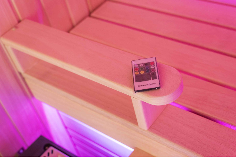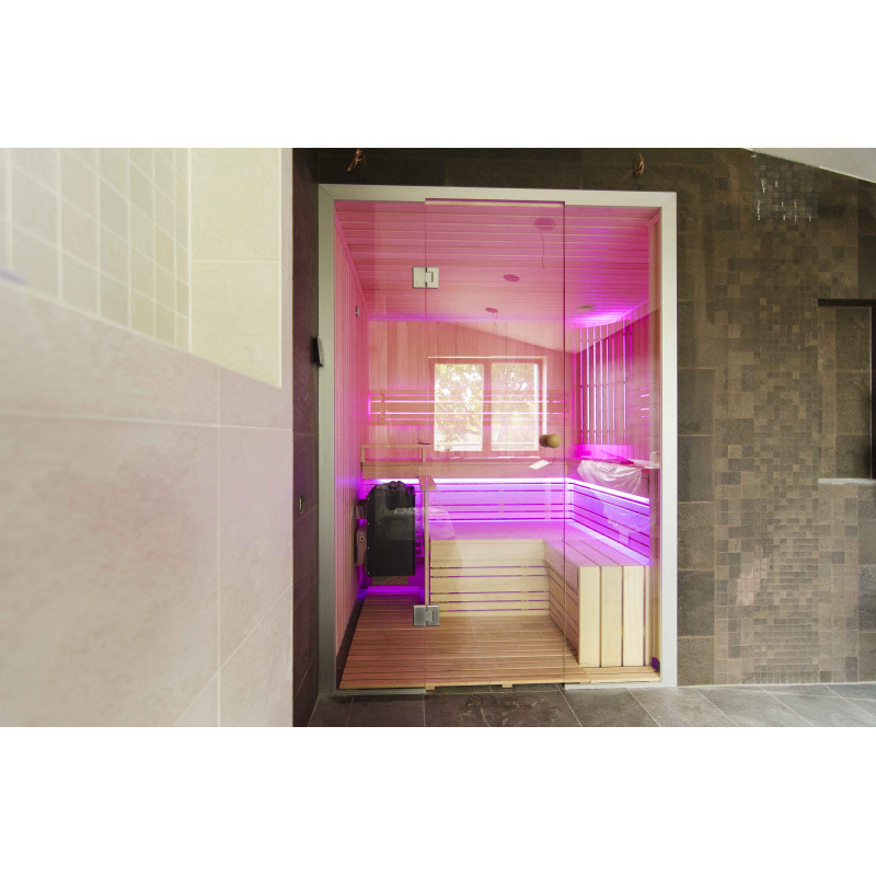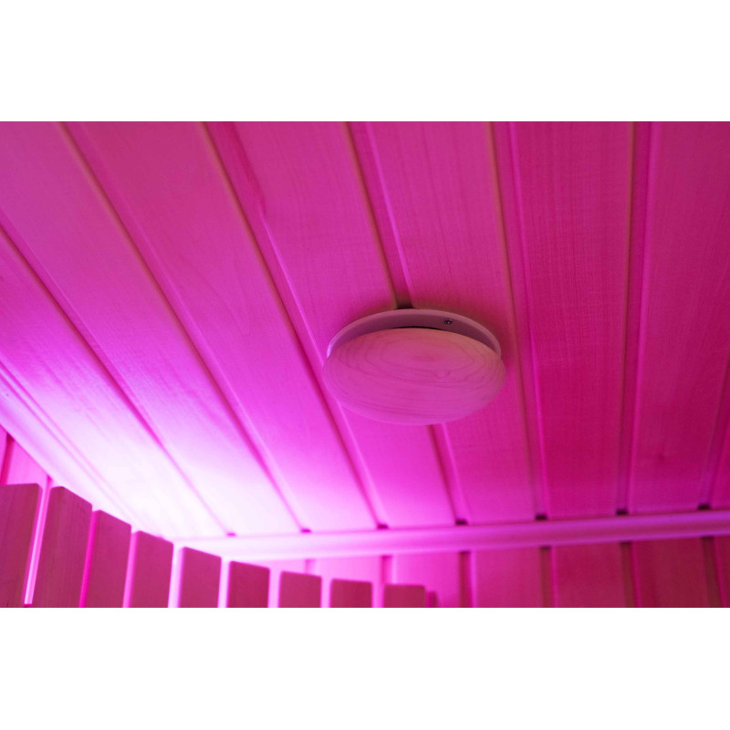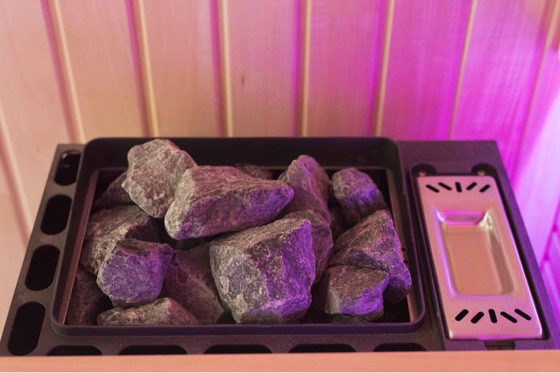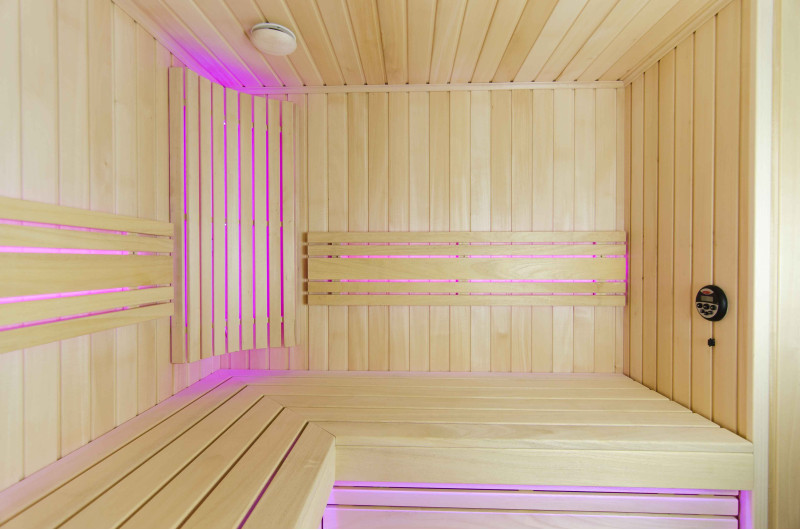 Το εσωτερικό της σάουνας είναι κατασκευασμένο από υψηλής ποιότητας ξύλο linden, οι ξαπλώστρες είναι κατασκευασμένες από ξύλο abachi - χωρίς θέρμανση και είναι ιδανικές για τη σάουνα.