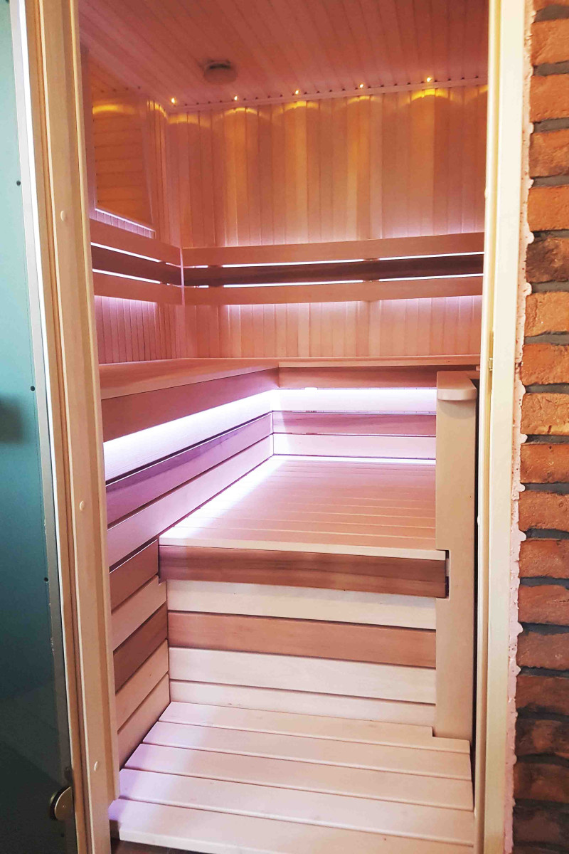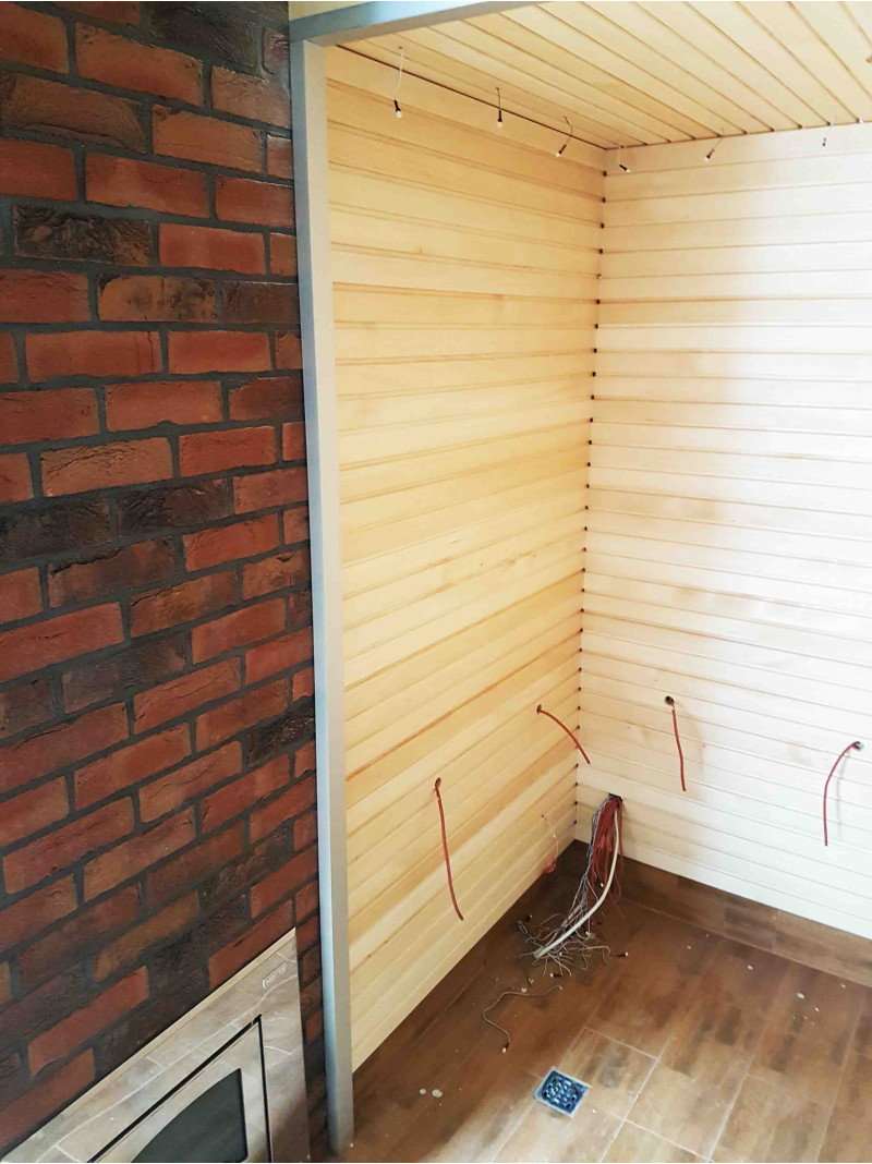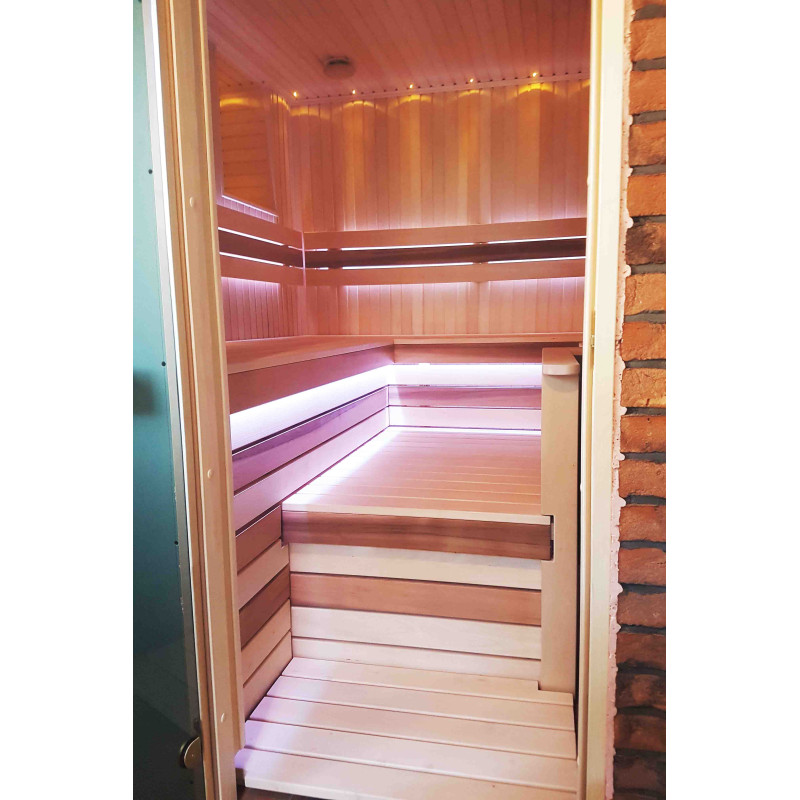 Έχει τοποθετηθεί φωτισμός σάουνας ανθεκτικός στην υγρασία και τη θερμότητα - LED "Sun". Κάτω από τις ξαπλώστρες και στις πλάτες - έγχρωμος φωτισμός RGB που ελέγχεται από τηλεχειριστήριο αλλαγής χρωμάτων.