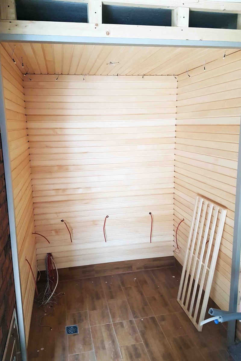 Οι οροφές, οι τοίχοι και οι πάγκοι είναι από ξύλο φλαμουριάς με διακοσμητικά στοιχεία από ξύλο κέδρου. Σχάρα δαπέδου από μαύρο σκλήθρα. Τα στηρίγματα πάγκων και οι τοίχοι είναι βερνικωμένα και κερωμένα, εξασφαλίζοντας την ανθεκτικότητα του ξύλου.