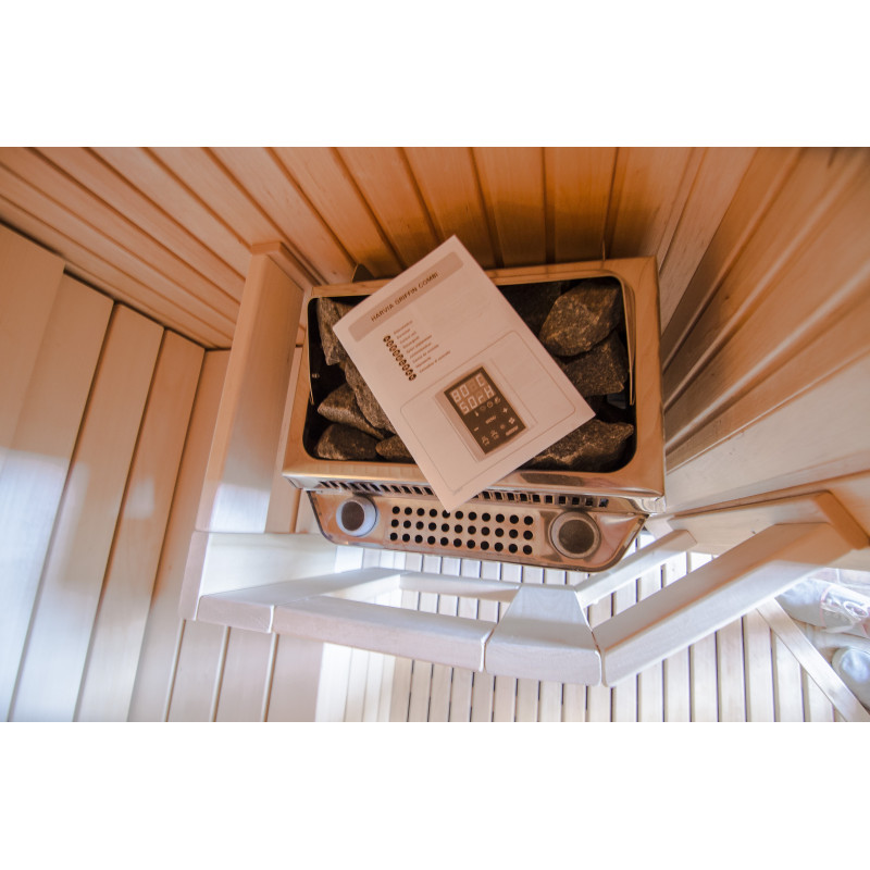 Θερμοσίφωνας - Harvia Topclass Combi - ηλεκτρική θέρμανση σάουνας με γεννήτρια ατμού, κρεμασμένη στον τοίχο. Εξωτερικό και εσωτερικό φινίρισμα: ανοξείδωτο ατσάλι. Το σετ περιλαμβάνει δύο πέτρινες γλάστρες για αρώματα και ψησταριά ατμού.