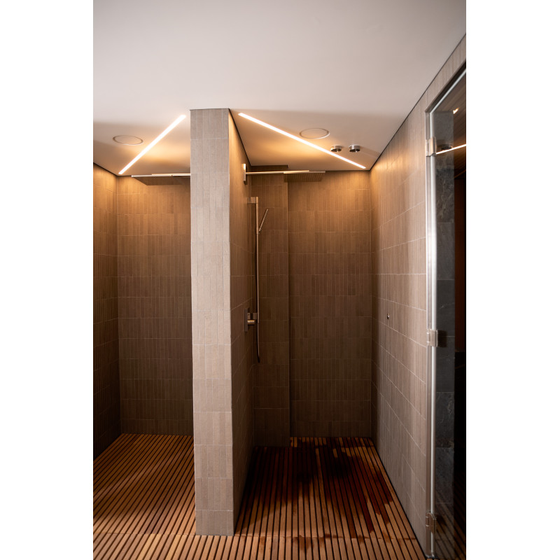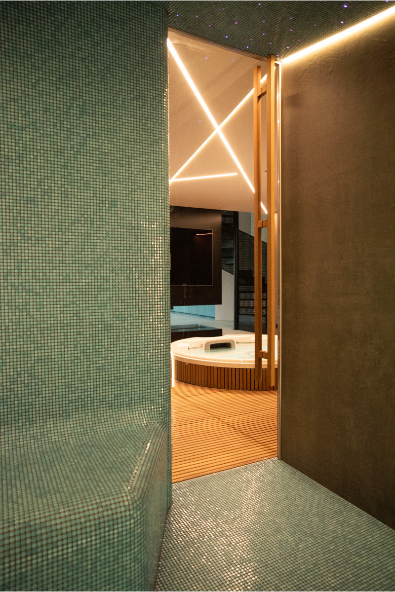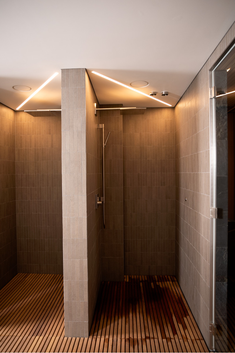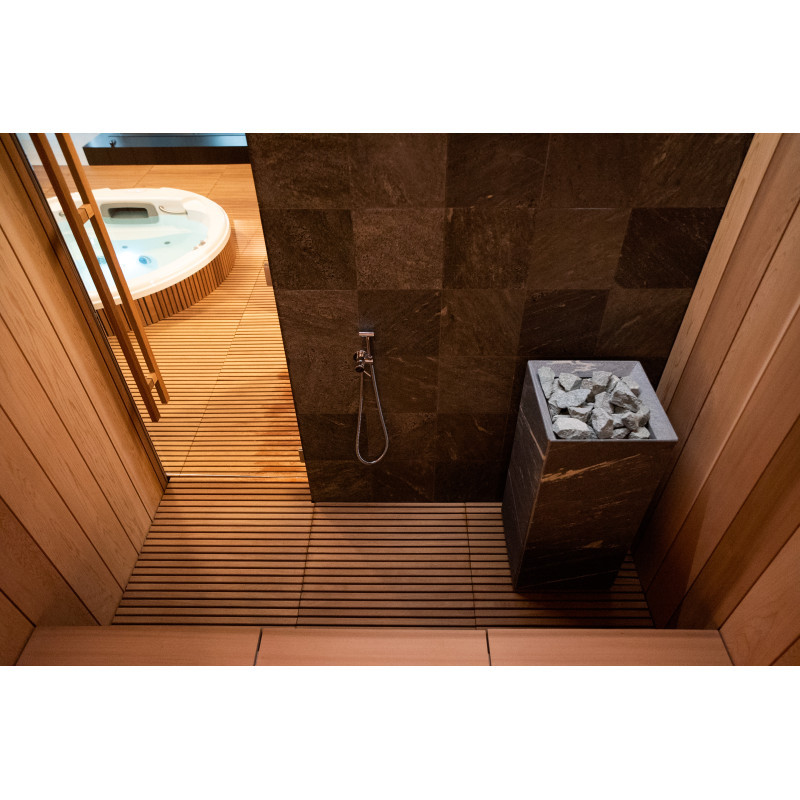 Σε ολόκληρο τον χώρο του SPA, το δάπεδο διαθέτει φυσικές ξύλινες σχάρες Iroko , προσφέροντας ανθεκτικότητα και εκλεπτυσμένη αισθητική.
