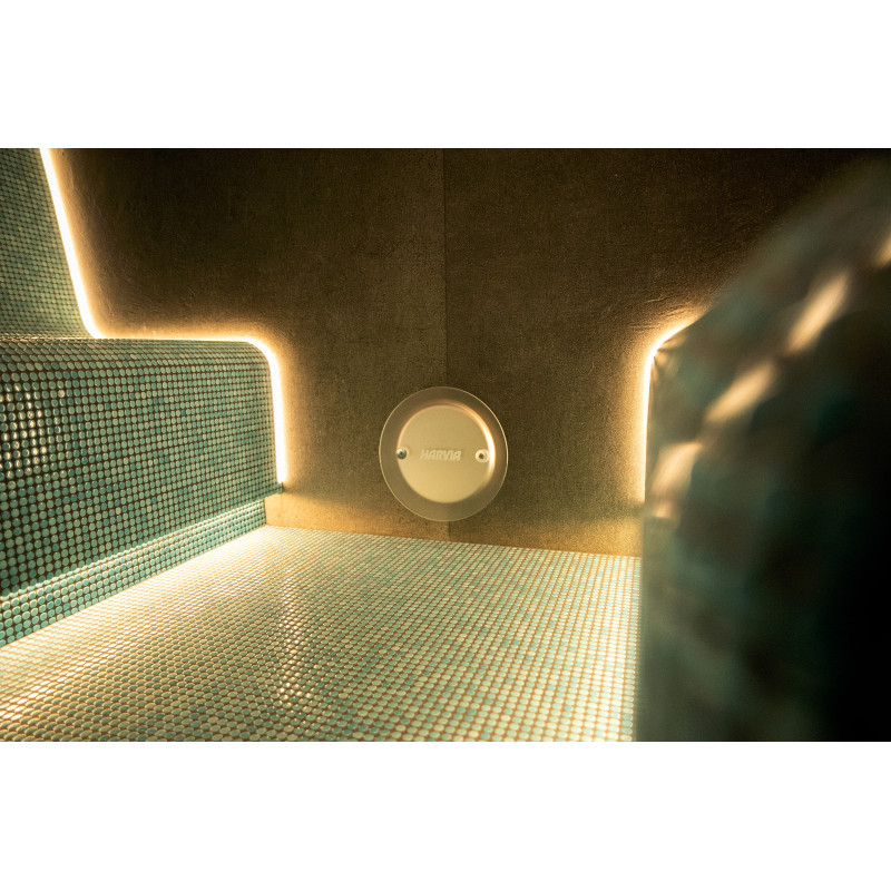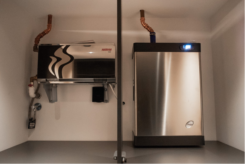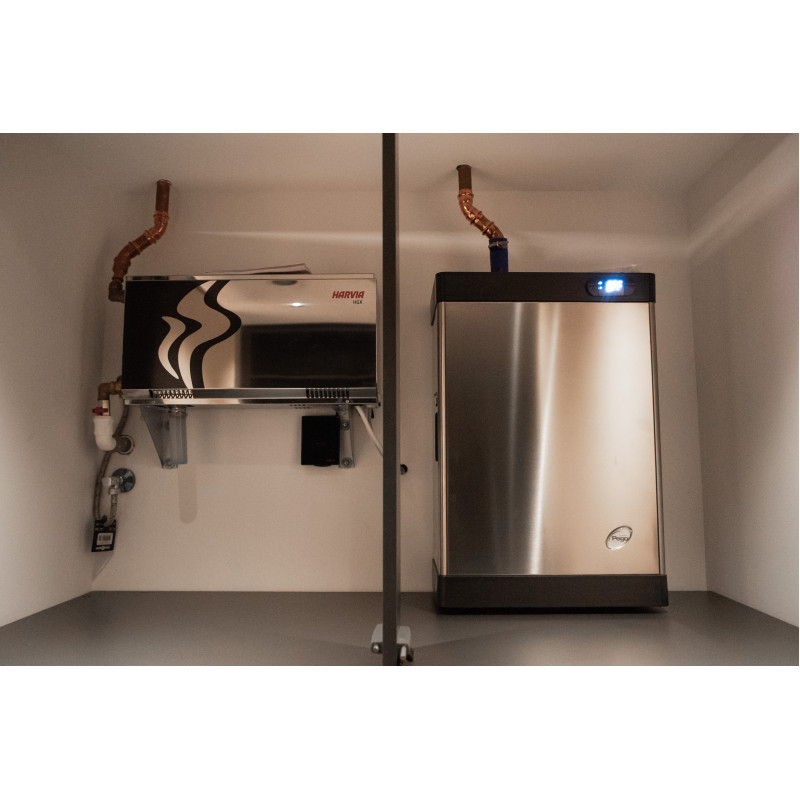 Ακροφύσιο ατμού Harvia ZG-520 και γεννήτρια ατμού PEGO ES12N (9kW), που λειτουργούν μέσω του πίνακα ελέγχου FCU 5000 με αισθητήρα θερμοκρασίας.