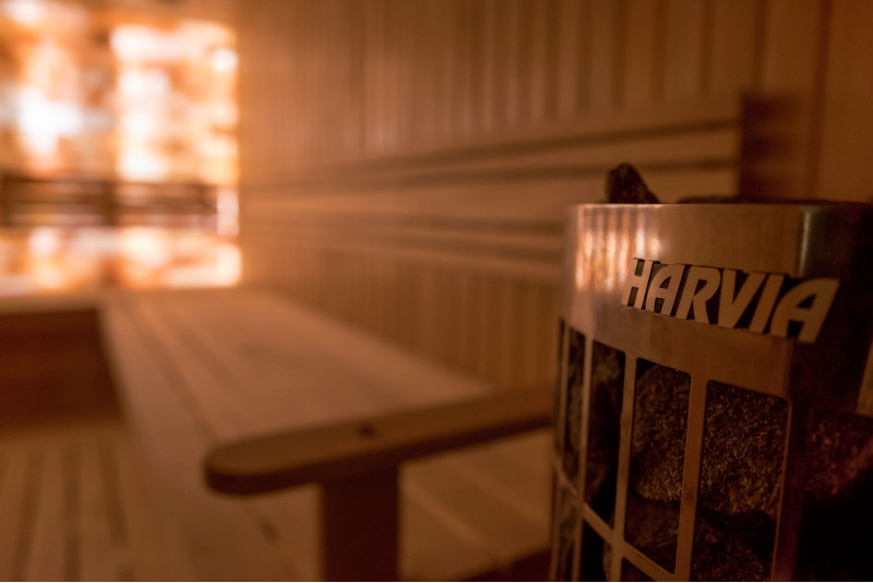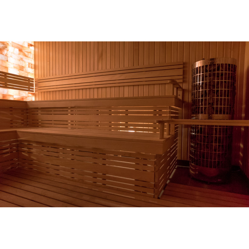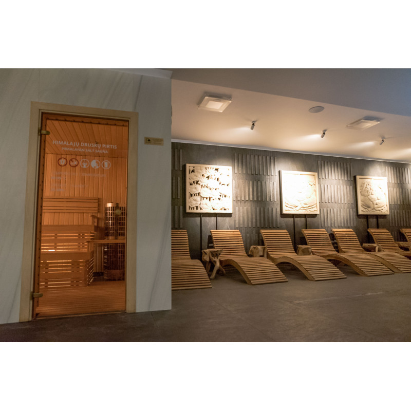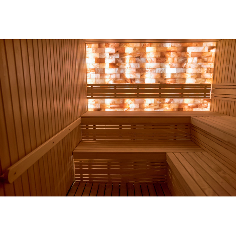 Το κύριο χαρακτηριστικό της σάουνας είναι ο εντυπωσιακός και μοντέρνος τοίχος από τούβλα από αλάτι Ιμαλαΐων. Αυτός ο τοίχος όχι μόνο απολαμβάνει την εμφάνισή του, δίνει στη σάουνα μια ζεστή ατμόσφαιρα, αλλά είναι επίσης γνωστό ότι το αλάτι Ιμαλαΐων έχει πολλές θετικές ιδιότητες για την ανθρώπινη υγεία. Το αλάτι Ιμαλαΐων έχει θετική επίδραση σε άτομα με αλλεργίες, βρογχικό άσθμα, παθήσεις του νευρικού συστήματος, ενισχύει το ανοσοποιητικό σύστημα, ανεβάζει τη διάθεση και παρέχει ενέργεια. Το αλάτι Ιμαλαΐων εξουδετερώνει την ηλεκτρομαγνητική ακτινοβολία, μειώνοντας τον στατικό ηλεκτρισμό στον αέρα. Ο τοίχος από αλάτι των Ιμαλαΐων τονίζεται και ομορφαίνει ακόμη περισσότερο από τον ενσωματωμένο φωτισμό LED κάτω από τα τούβλα.