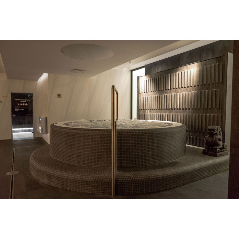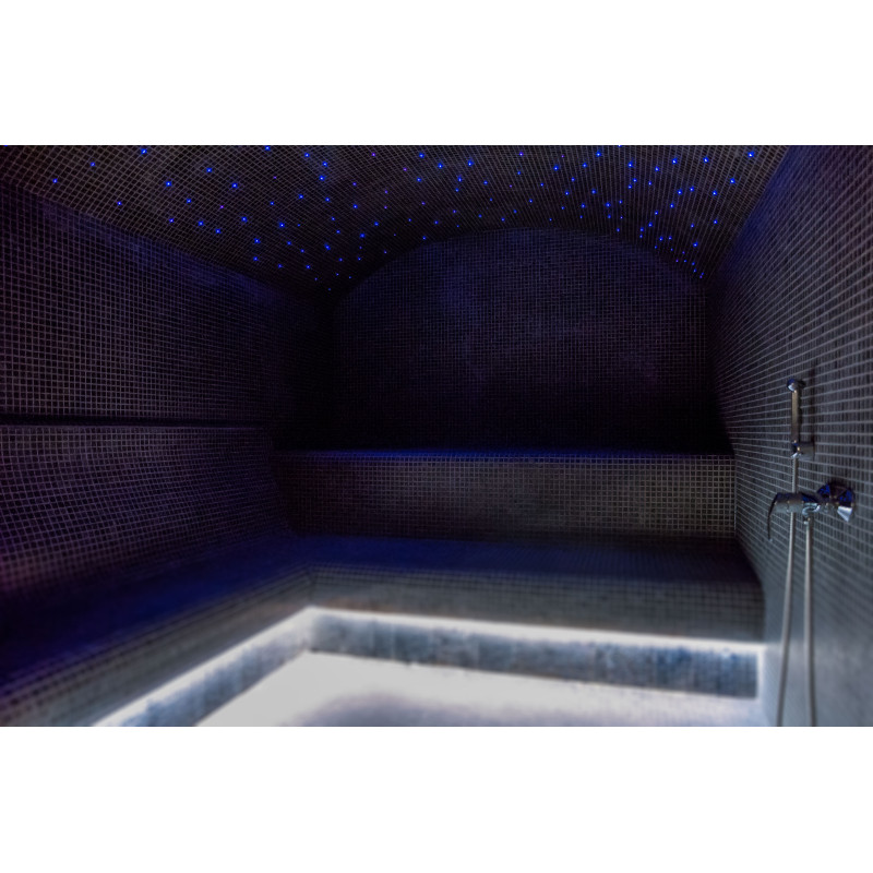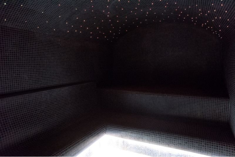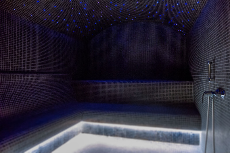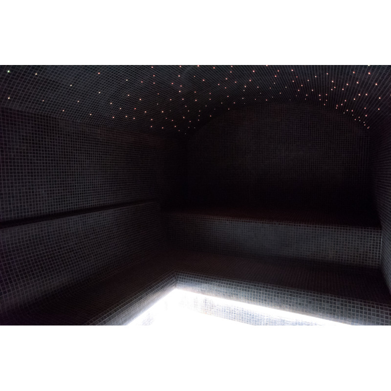 Στη σάουνα ατμού, οι επιφάνειες από αφρό πολυστερίνης, οι καμάρες οροφής και οι πάγκοι κατασκευάζονται σύμφωνα με ένα μεμονωμένο έργο. Μπορείτε να απολαύσετε τη σάουνα τόσο ξαπλωμένοι όσο και καθιστοί, καθώς υπάρχει πλάτη στη μία πλευρά της σάουνας.