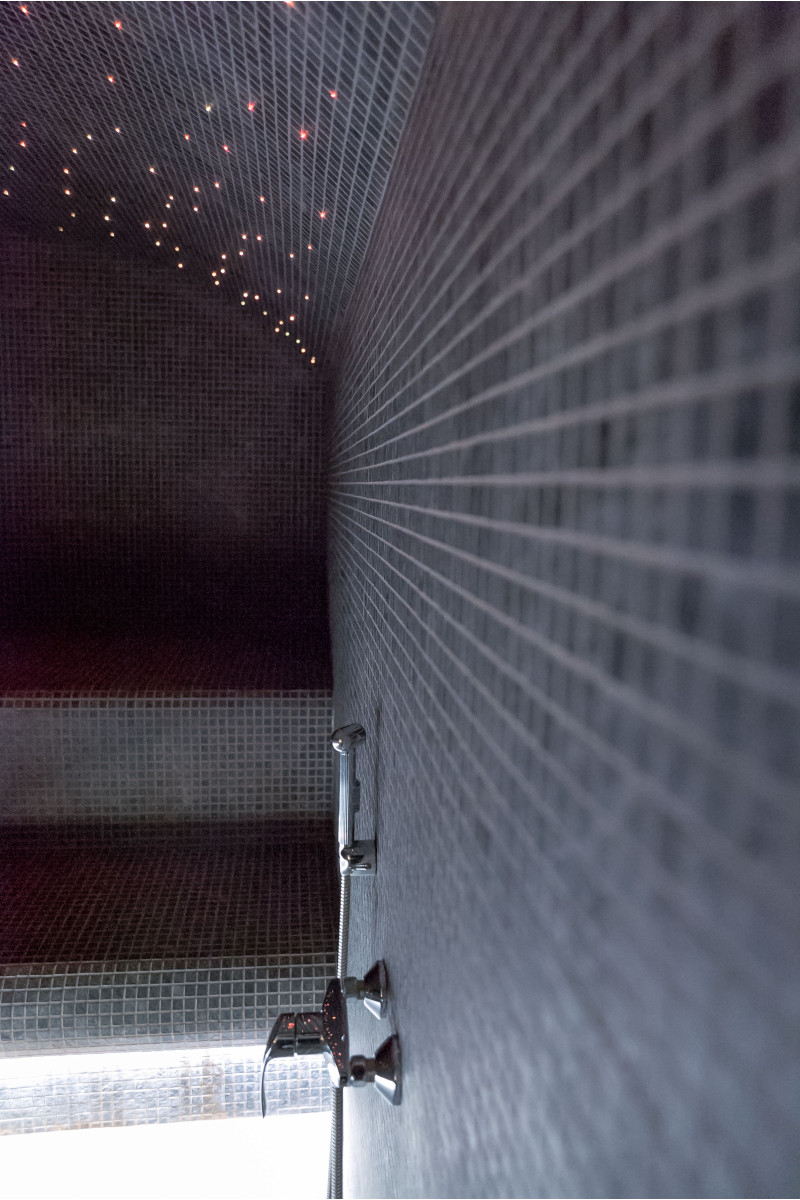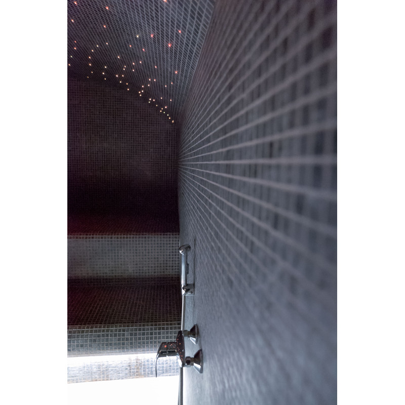 Ολόκληρη η σάουνα είναι διακοσμημένη με μικρά ψηφιδωτά πλακάκια και δύο ηχεία μουσικής δημιουργούν μια ήρεμη και ζεστή ατμόσφαιρα.