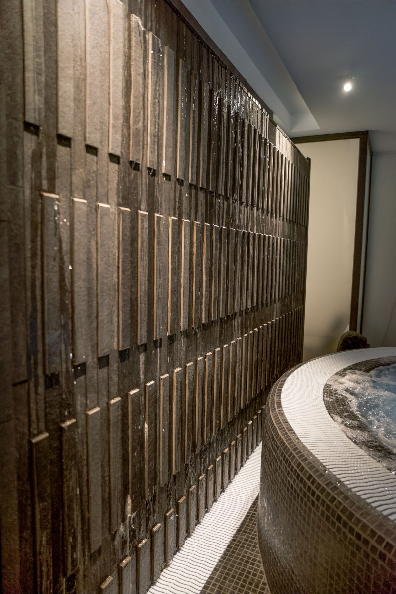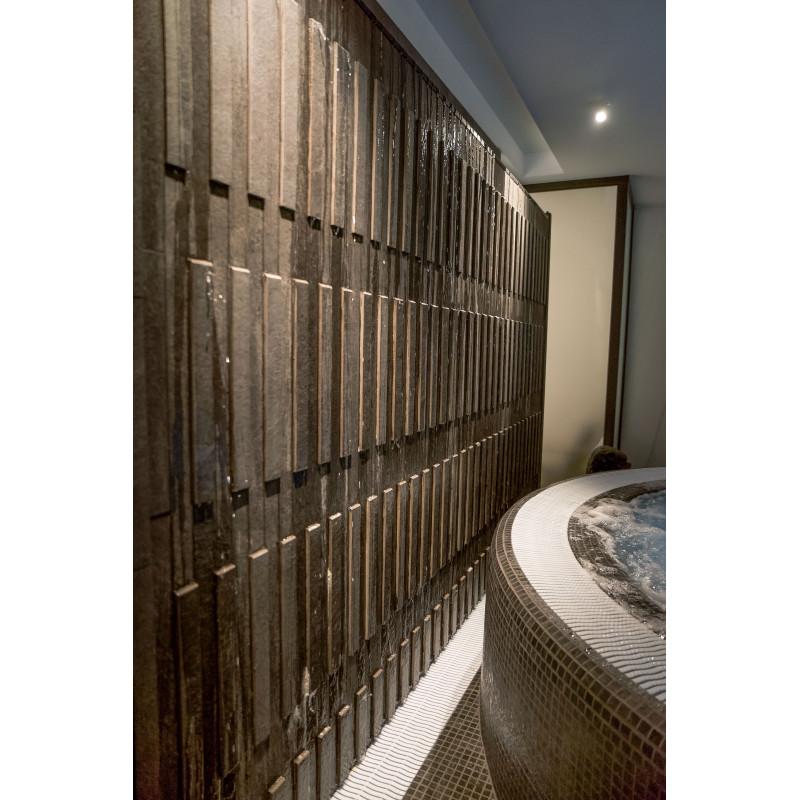 Η πισίνα πλαισιώνεται από έναν τοίχο με τρεχούμενο νερό. Εγκαθίστανται συστήματα συλλογής, διαρροής, φιλτραρίσματος νερού. Το νερό που πέφτει και στάζει δημιουργεί ένα τροπικό εξωτικό στυλ στο σπα. Η ατμόσφαιρα που δημιουργείται από την Ανατολή σας επιτρέπει να ζήσετε μια αποκλειστική ξεκούραση.