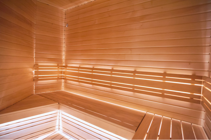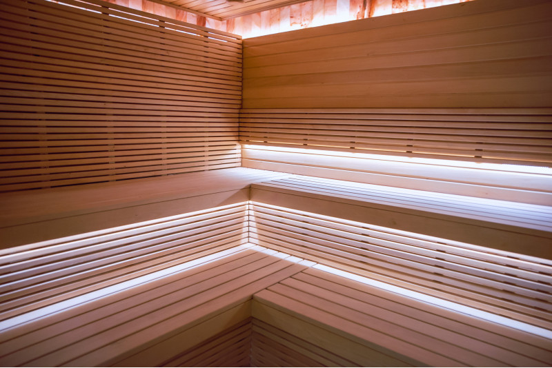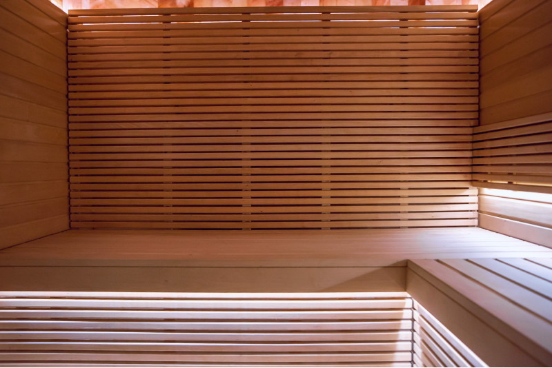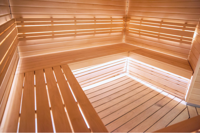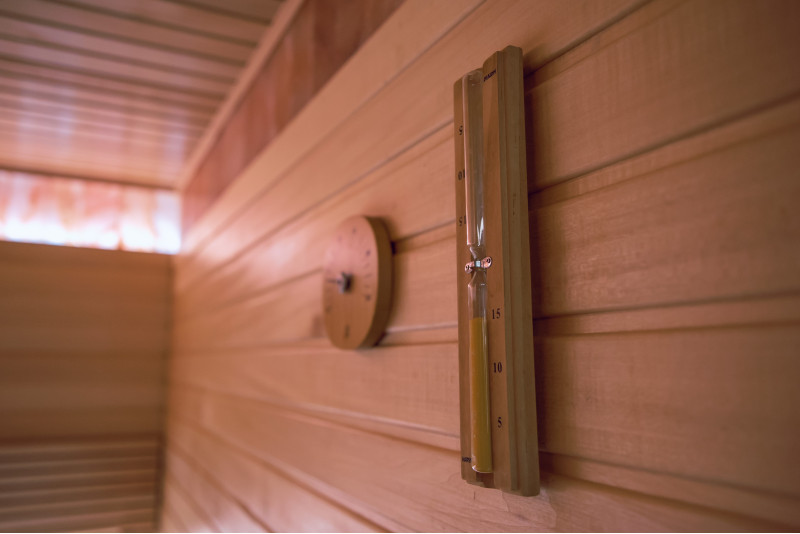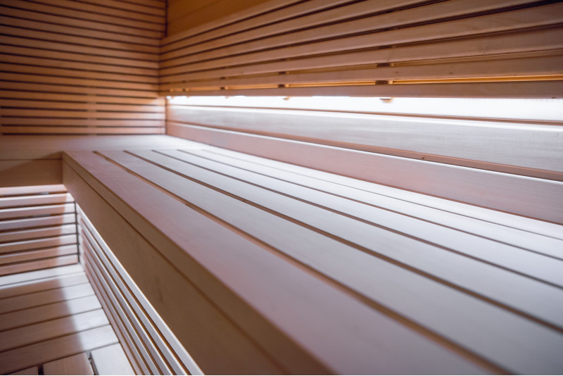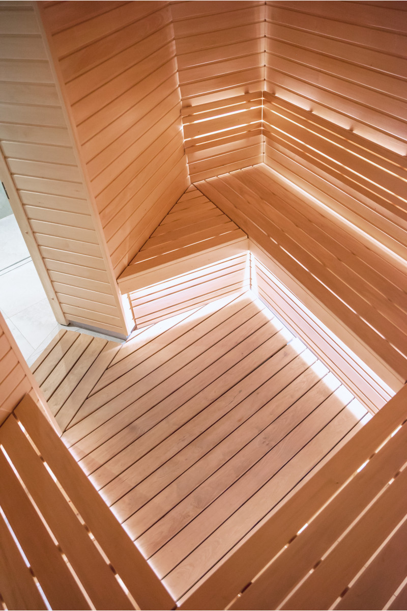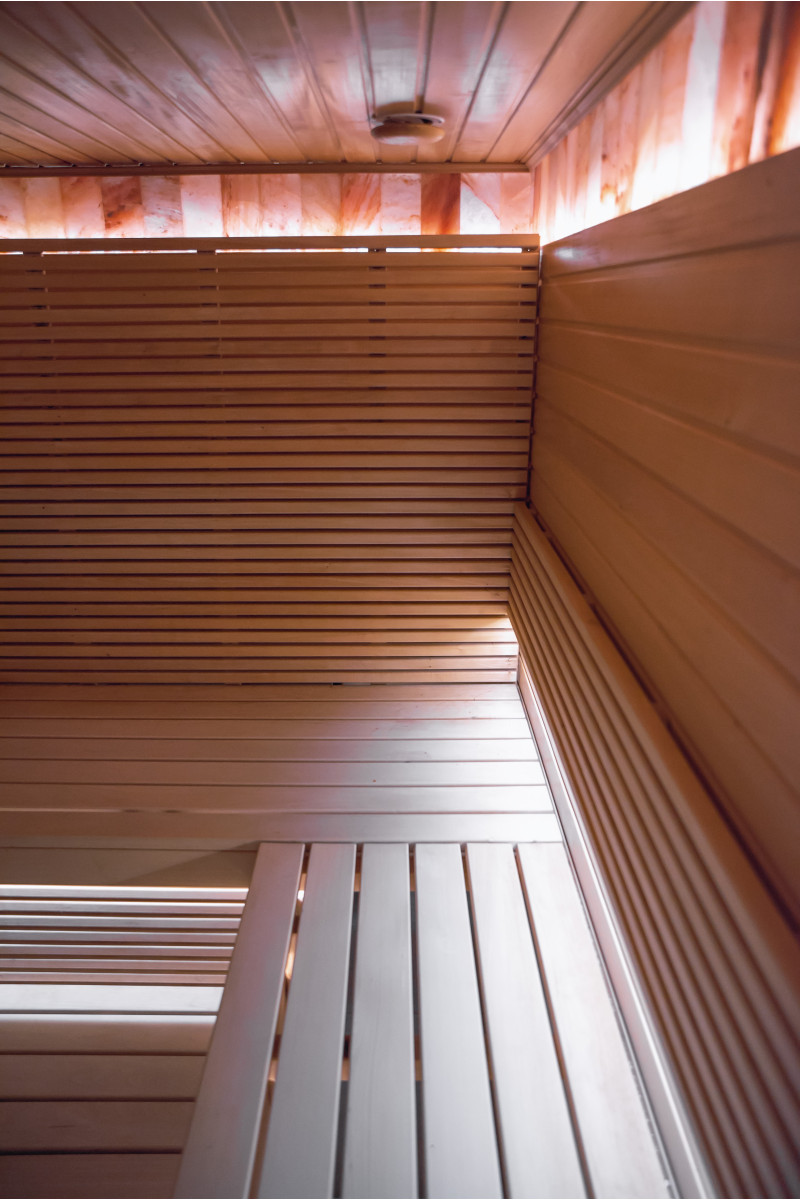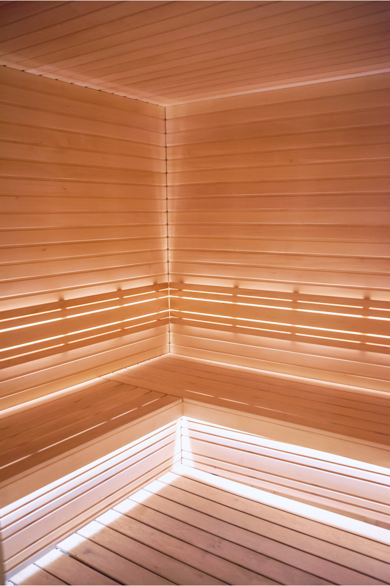 Οι εσωτερικές ξύλινες λεπτομέρειες της σάουνας είναι κατασκευασμένες από ξύλο ασβέστη.