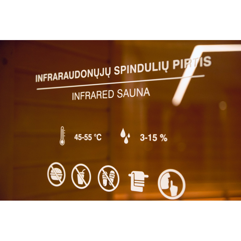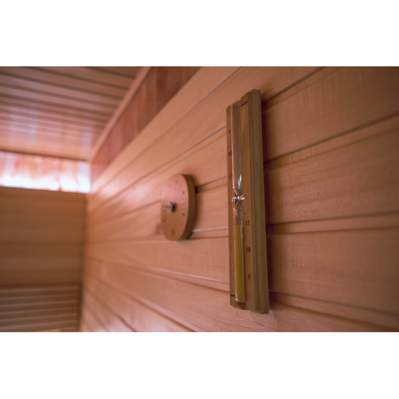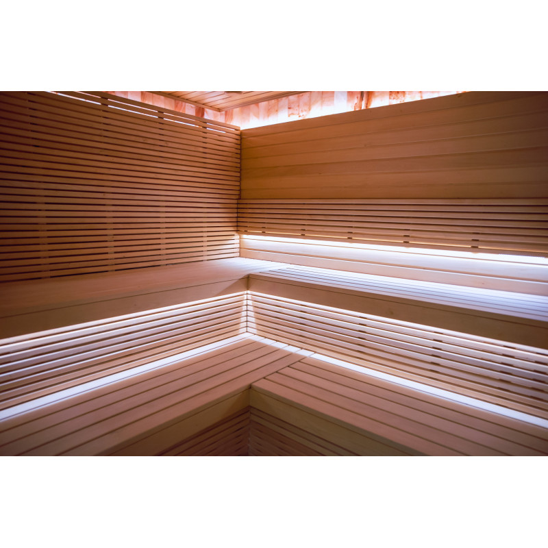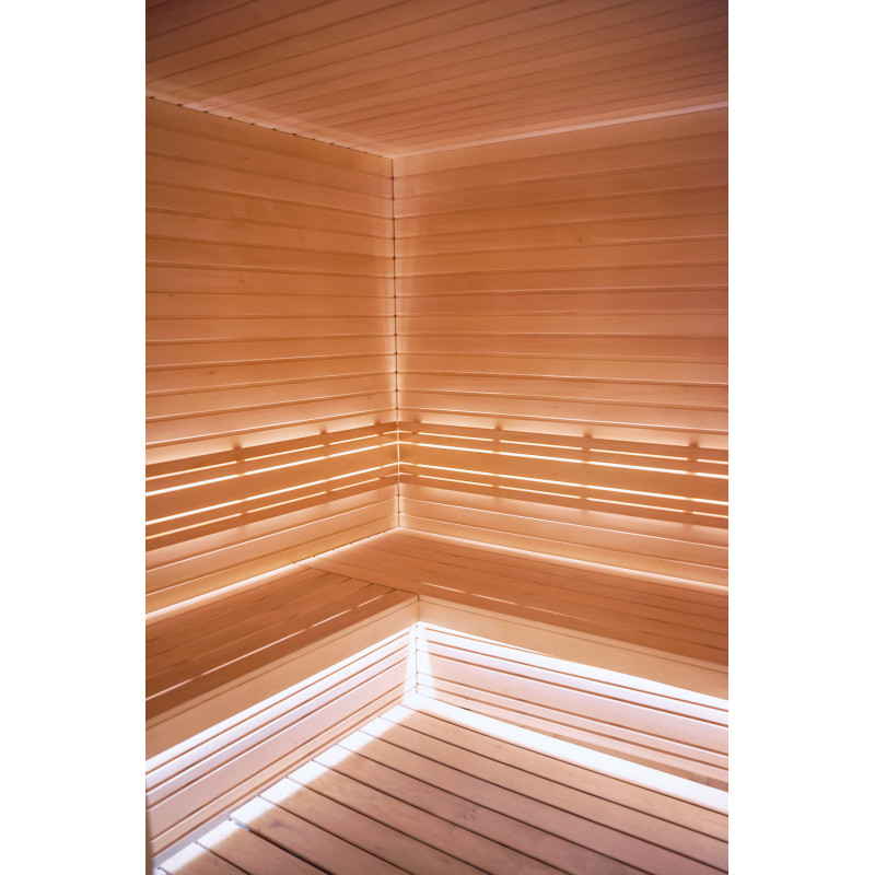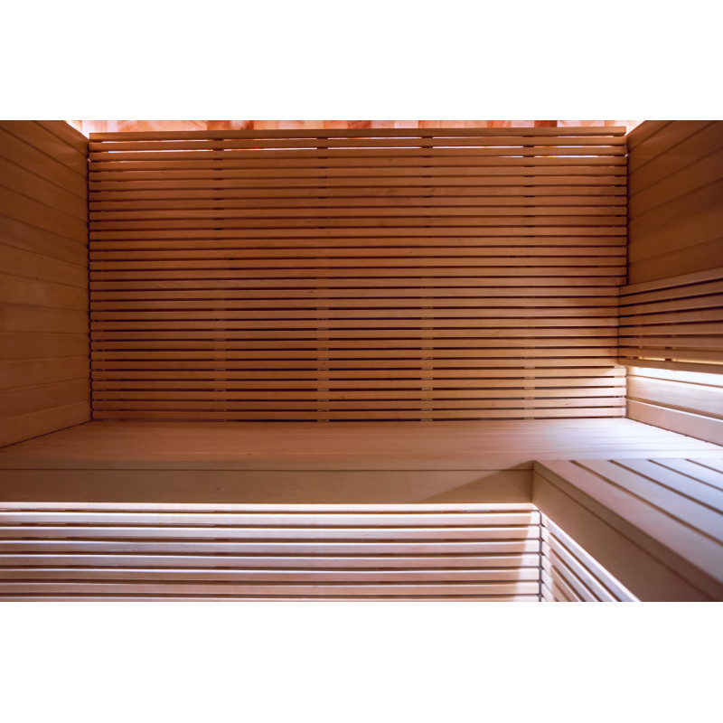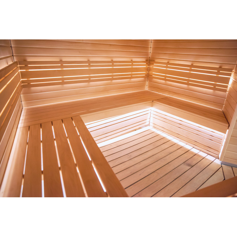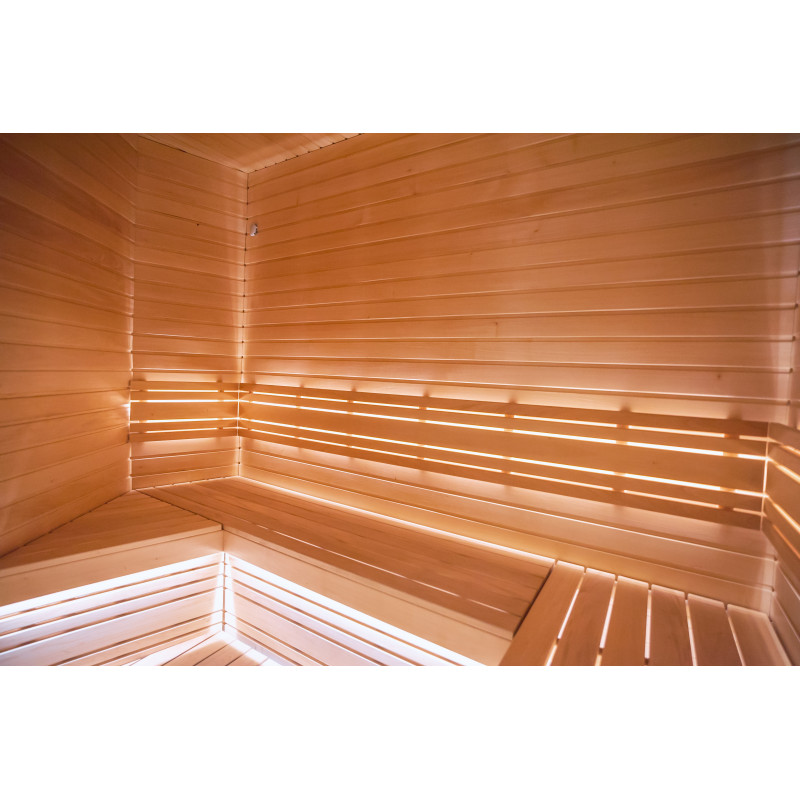 Η σάουνα είναι εξοπλισμένη με εξοπλισμό εξαερισμού, φωτισμό LED κάτω από τις επάνω κουκέτες και στα στηρίγματα της πλάτης.