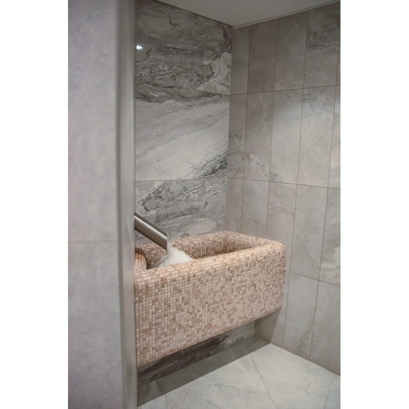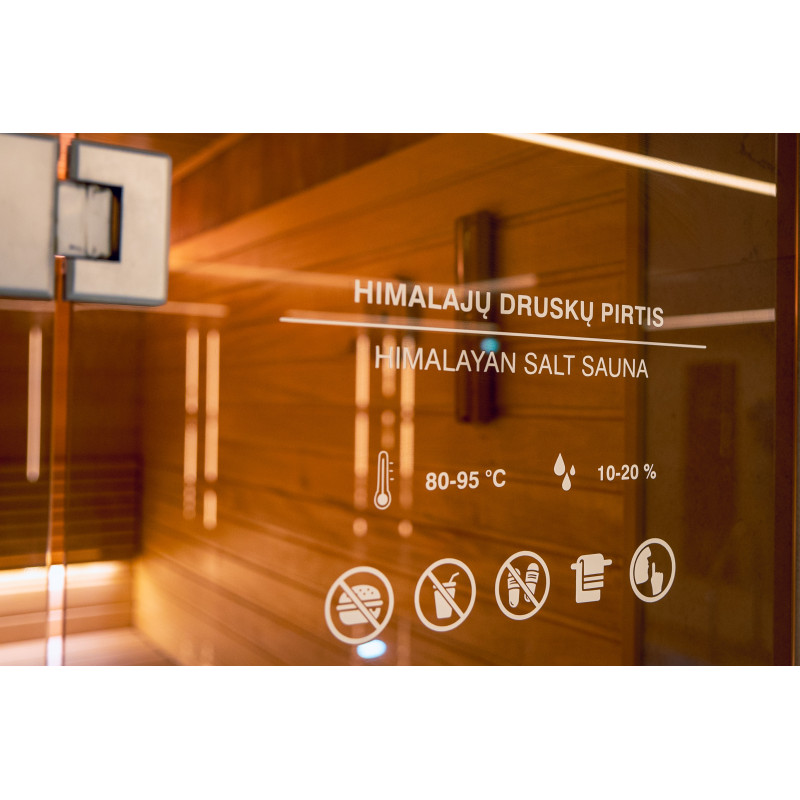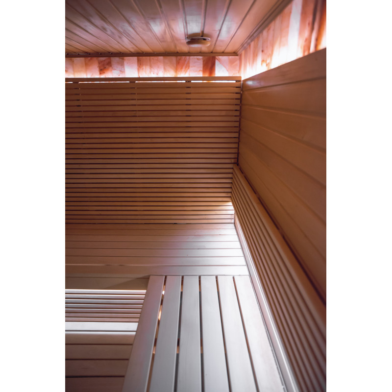 Ένας τοίχος από πλακάκια αλατιού Ιμαλαΐων σε μια σύγχρονη σάουνα είναι μια εξαιρετική λύση τόσο από άποψη αισθητικής όσο και από άποψη βελτίωσης της υγείας. Μια λωρίδα αλατιού Ιμαλαΐων σχηματίζεται σε ύψος 20 εκατοστών στον τοίχο ακριβώς δίπλα στην οροφή, σε όλη την περίμετρο της σάουνας. Πίσω από τα πλακάκια αλατιού τοποθετείται φωτισμός LED.