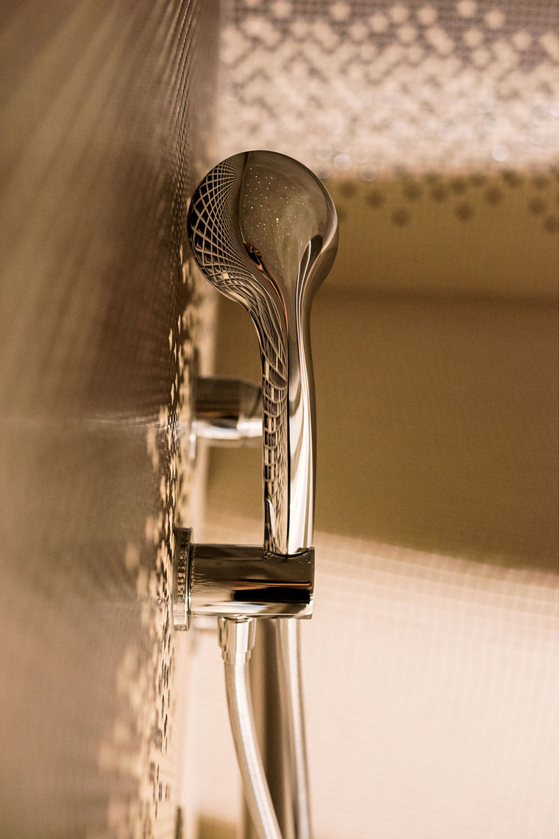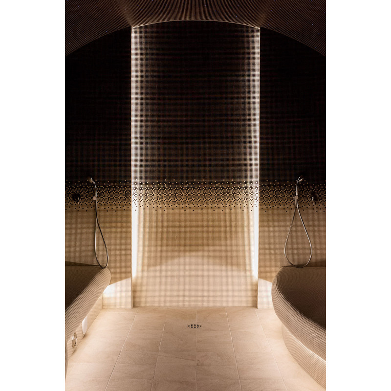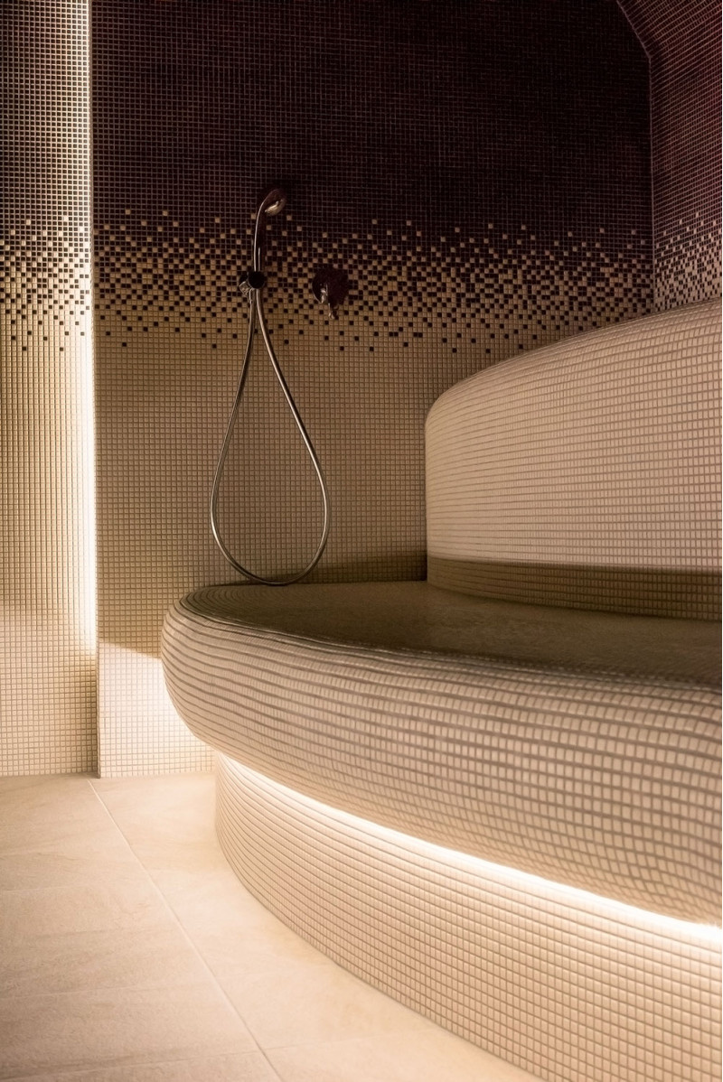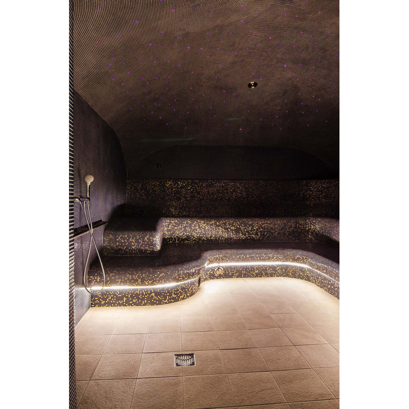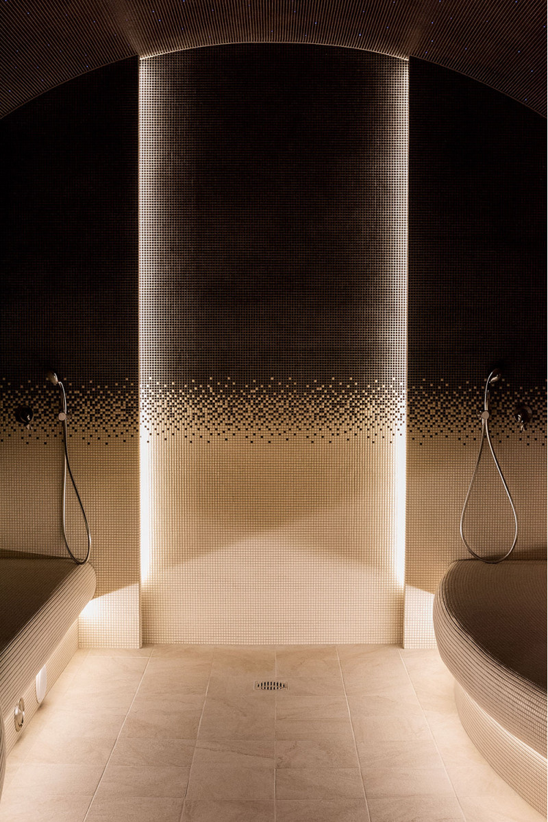 - Φωτιστικά ανθεκτικά στην υγρασία και τη θερμοκρασία τοποθετούνται κάτω από τα κρεβάτια. Ο φωτισμός LED είναι εγκατεστημένος πίσω από τον τοίχο αλατιού Ιμαλαΐων.