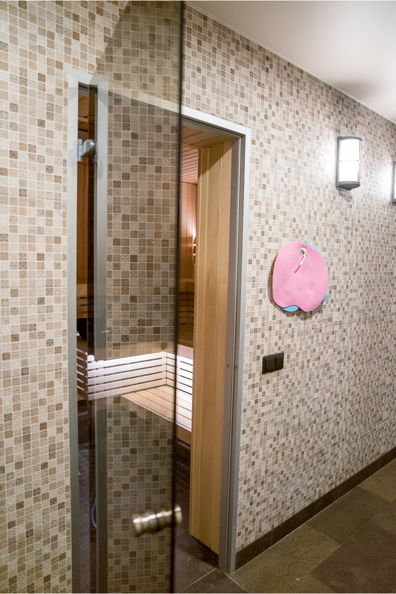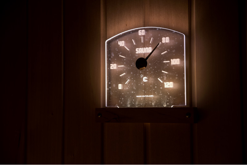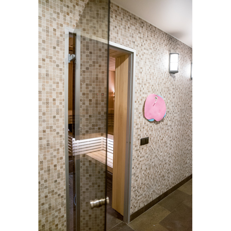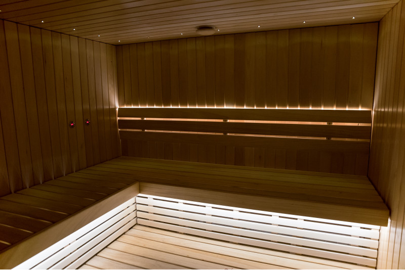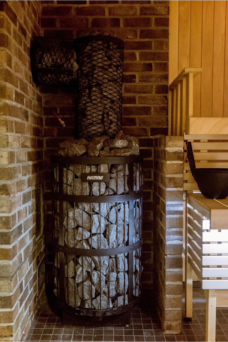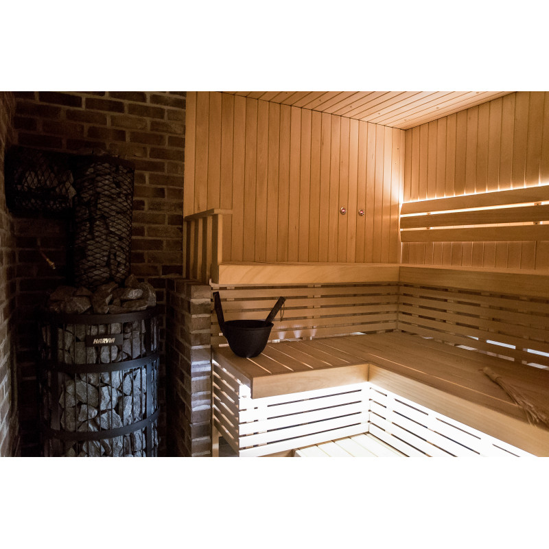 Οι εσωτερικές ξύλινες λεπτομέρειες της σάουνας -παγκάκια και παρακαμπτήριος- είναι κατασκευασμένες από υψηλής ποιότητας ξύλο μαύρου σκλήθρου.