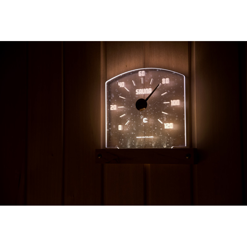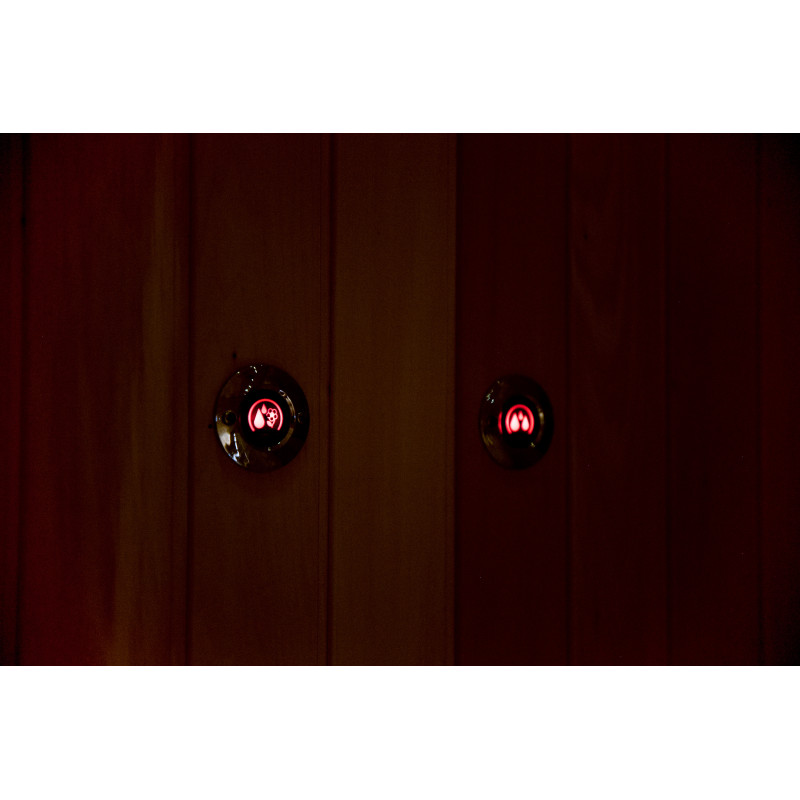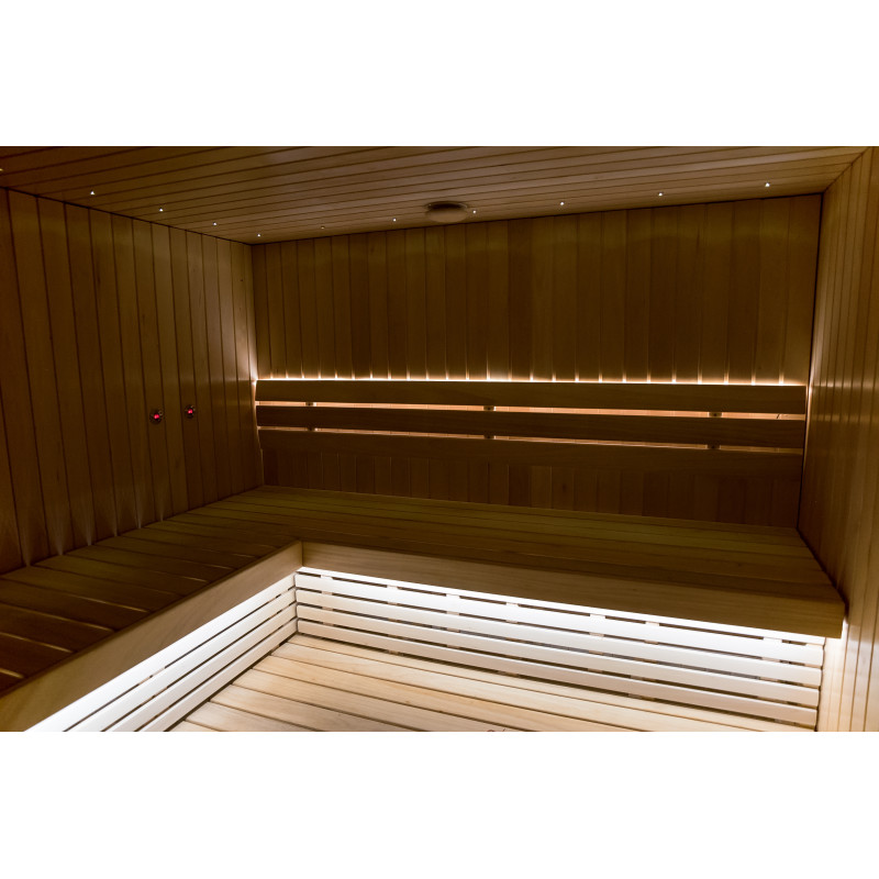 Εξοπλισμένο με έγχρωμο φωτισμό RGB κάτω από τους επάνω πάγκους και τις πλάτες. Αυτός ο φωτισμός σάουνας είναι ανθεκτικός στην υγρασία και τη θερμοκρασία. Το χρώμα του φωτισμού μπορεί να αλλάξει ανάλογα με τη διάθεσή σας.