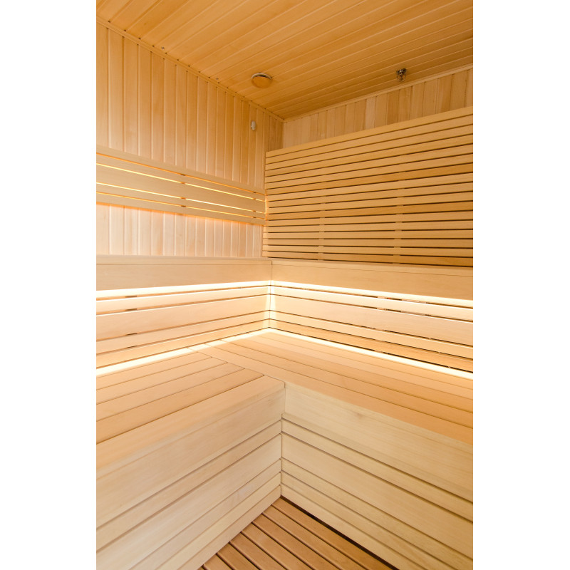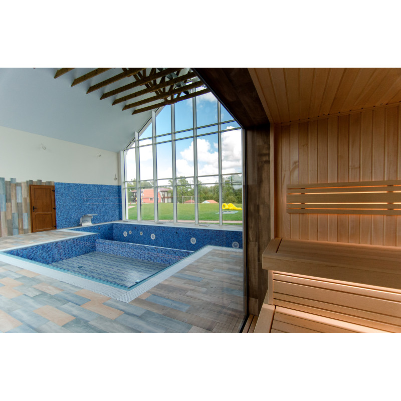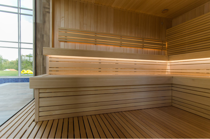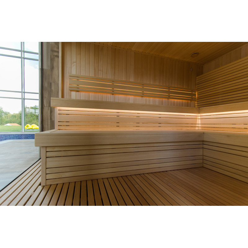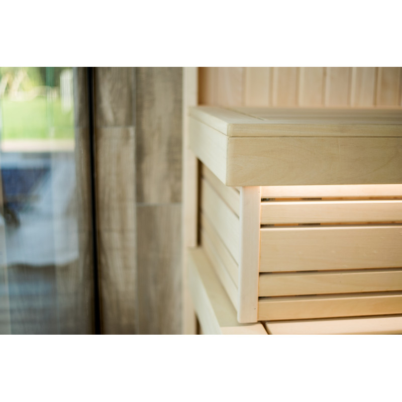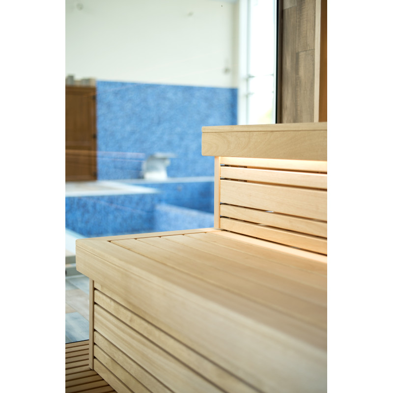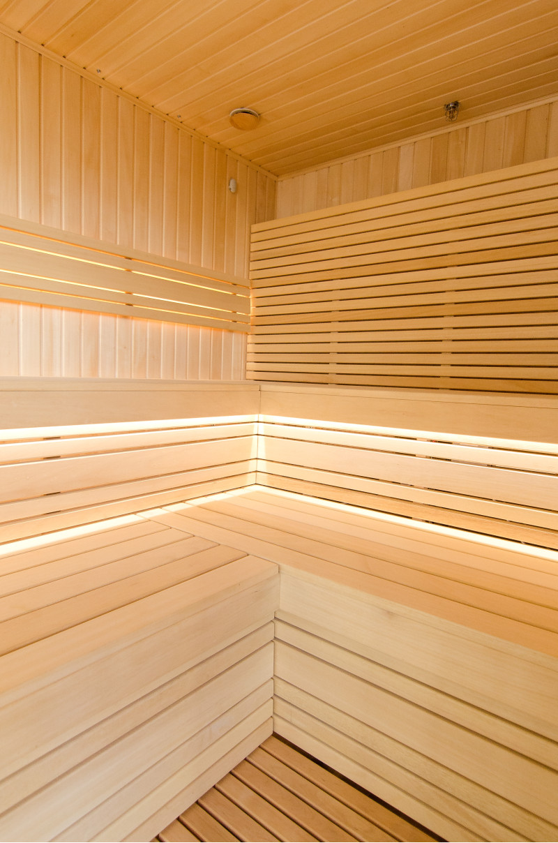 Σάουνα. Οι εσωτερικές ξύλινες λεπτομέρειες της σάουνας είναι κατασκευασμένες από ξύλο abachi, η οροφή και οι τοίχοι από ξύλο Ιουλίου. Χαρακτηριστικά: