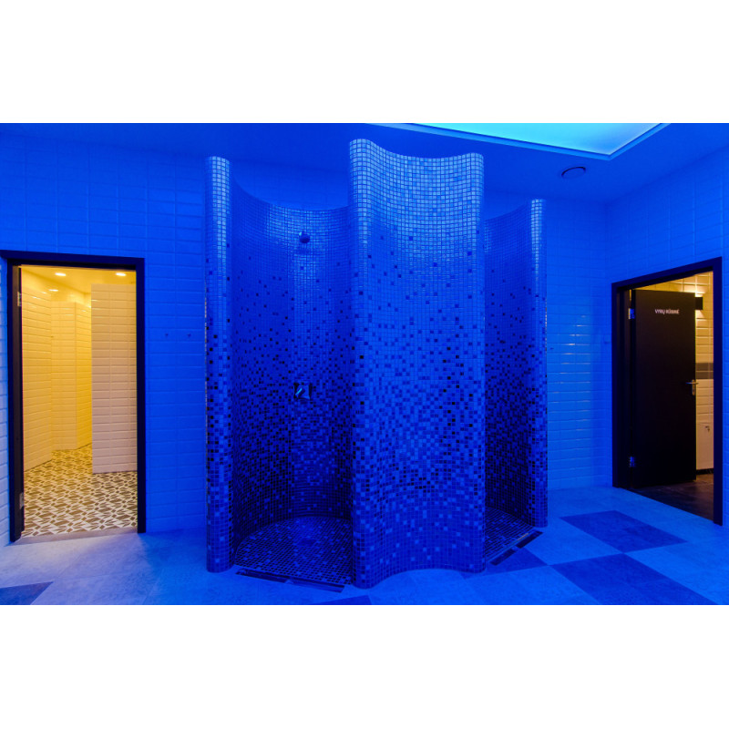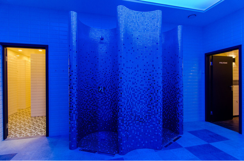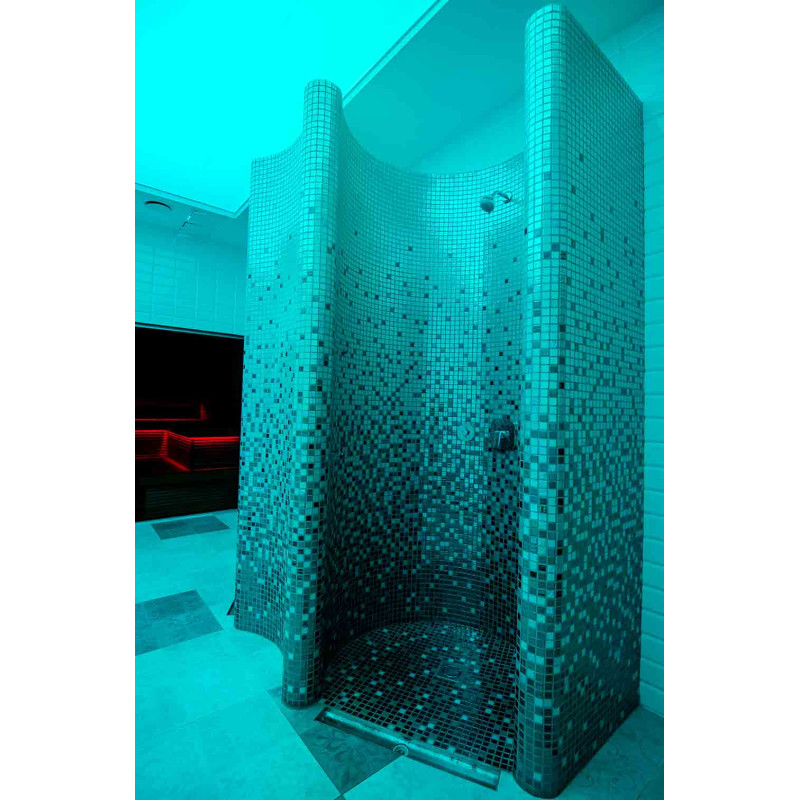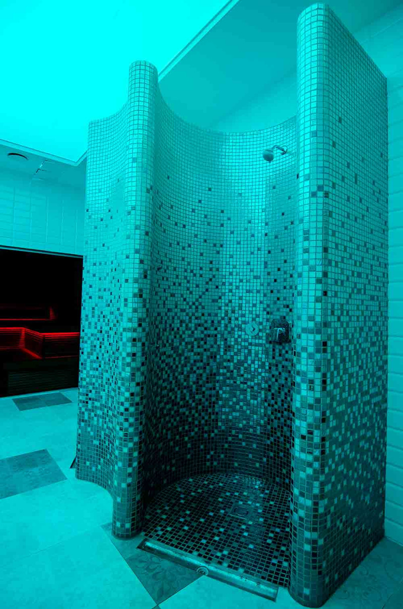 Τα καλούπια ντους είναι κατασκευασμένα από XPS 300, χρησιμοποιώντας προδιαγραφές. τεχνολογία κοπής σύμφωνα με τον ατομικό σχεδιασμό. Καλούπια τοποθετημένα, αδιάβροχα με λιπαντική αδιαβροχοποίηση Schonox. Κολλημένα ψηφιδωτά πλακάκια, προσαρμοσμένα στην καμπυλότητα και γεμάτα με γκρι αδιαβροχοποίηση Schonox. Ντους - για διαφορετικούς σκοπούς. Ένα από αυτά - για ένα απλό πλύσιμο, το άλλο - για ψύξη μετά από σάουνα, με πίδακες κρύου νερού.