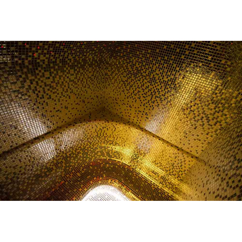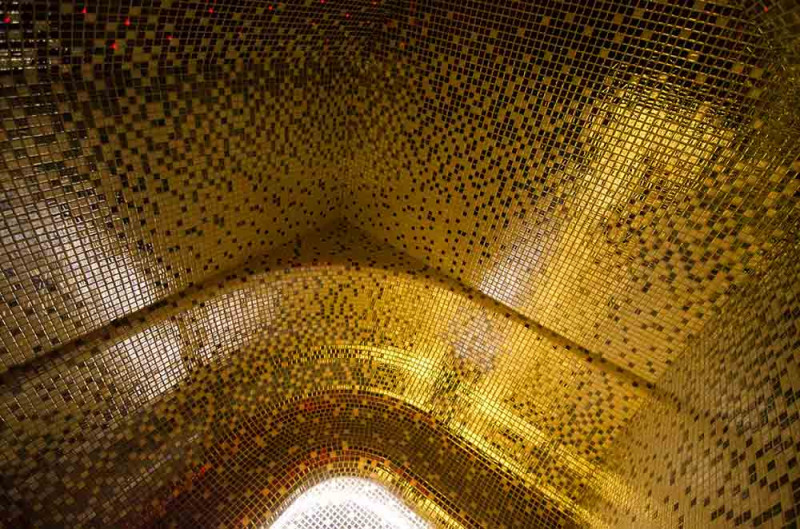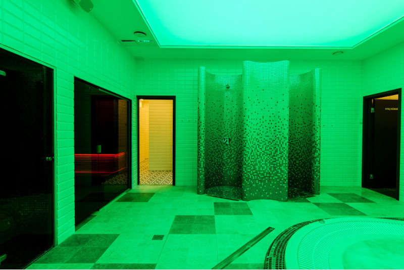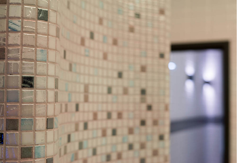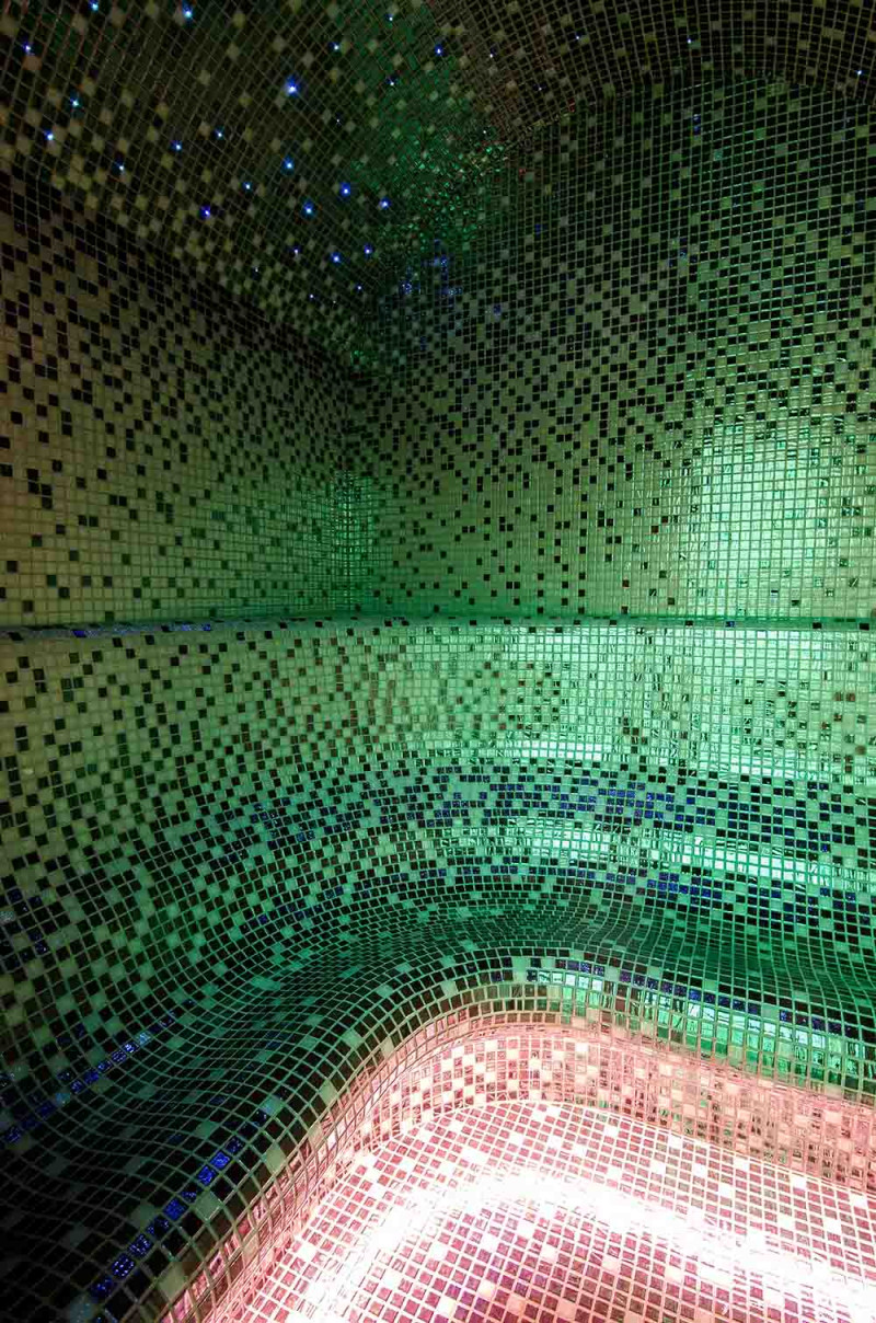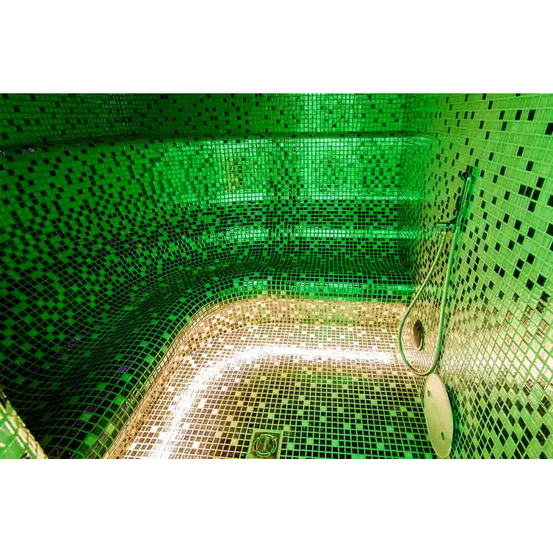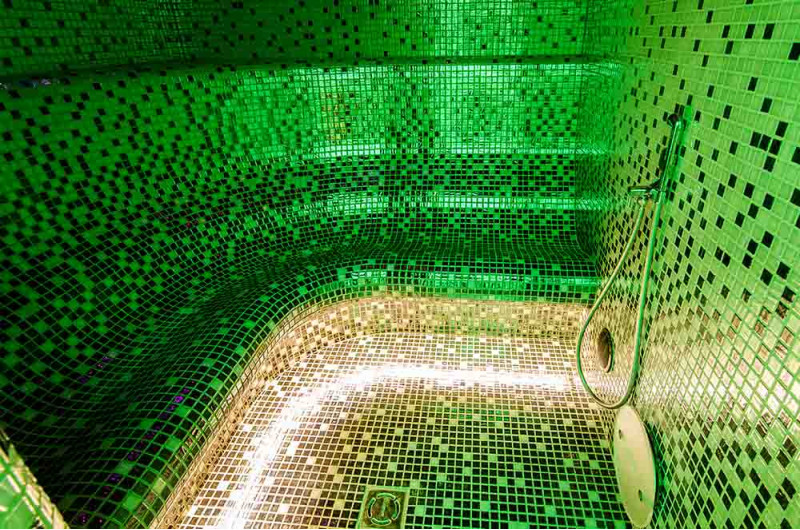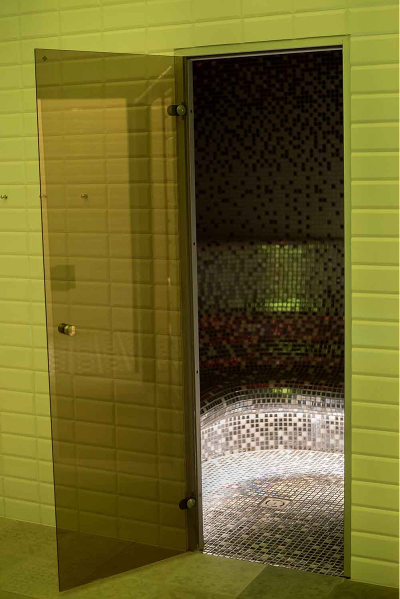 Οι εσωτερικές επιφάνειες του ατμού σχηματίζονται σύμφωνα με ένα μεμονωμένο έργο από διογκωμένη πολυστερίνη, χρησιμοποιώντας συνεχή κοπή EPS στυρόλιο. Κολλημένα ψηφιδωτά πλακίδια, προσαρμοσμένα στην καμπυλότητα και γεμάτα με γκρι αδιαβροχοποίηση Schonox. Το πάτωμα του δωματίου θερμαίνεται. Πόρτες - πλαίσιο αλουμινίου, γυαλί απόχρωση. Εξοπλισμός ατμού μπάνιου: