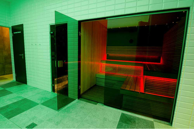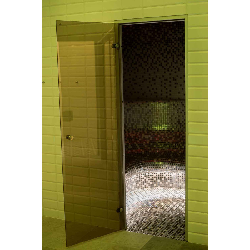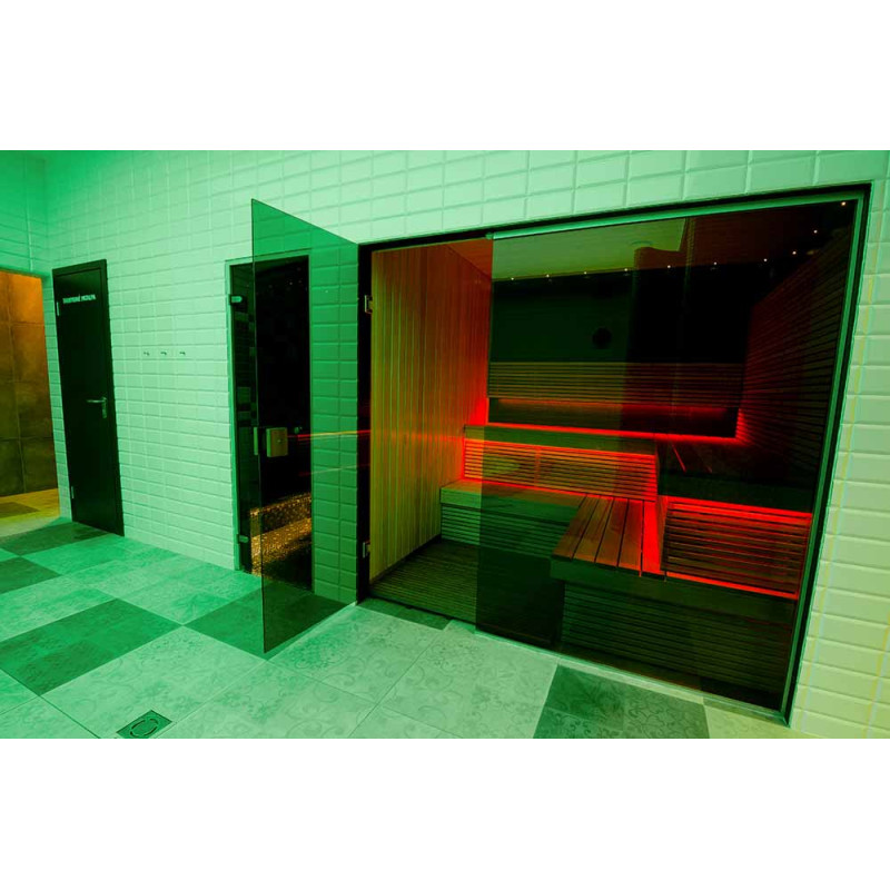 - δημιουργώντας ένα απρόσκοπτο στιλ, η γυάλινη βιτρίνα που είναι εγκατεστημένη στη σάουνα επεκτείνει τον χώρο και δημιουργεί την εντύπωση της ελαφρότητας, δίνει στο δωμάτιο φως και μοντέρνο χαρακτήρα Γυάλινο γυαλί βιτρίνας - φιμέ, μετριασμένο, πλαίσιο αλουμινίου,